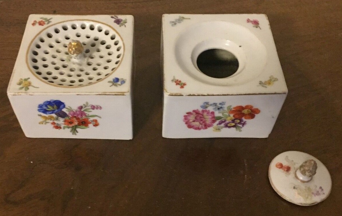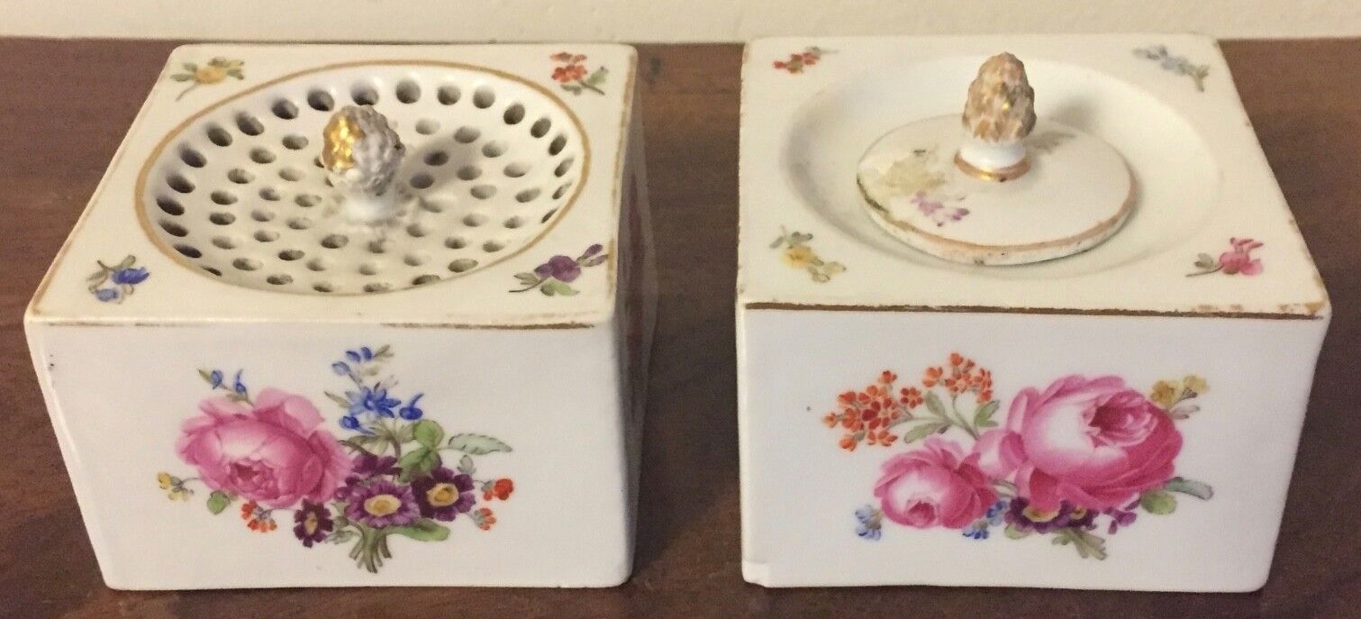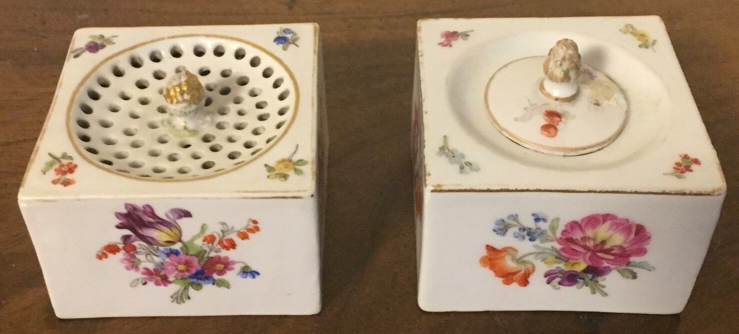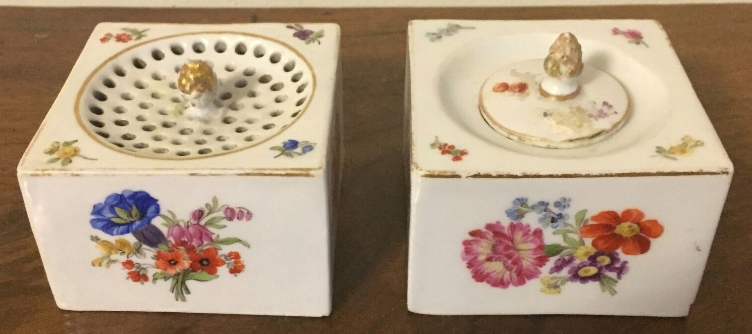 German Meissen porcelain inkwell and pounce pot. Decorated on all sides with different floral sprigs, and fully marked on the base.