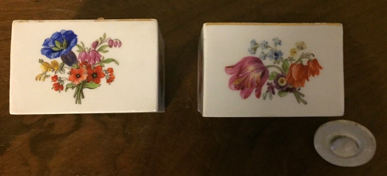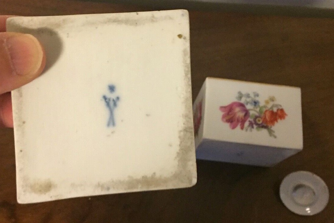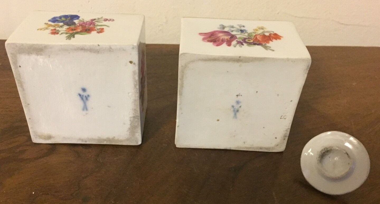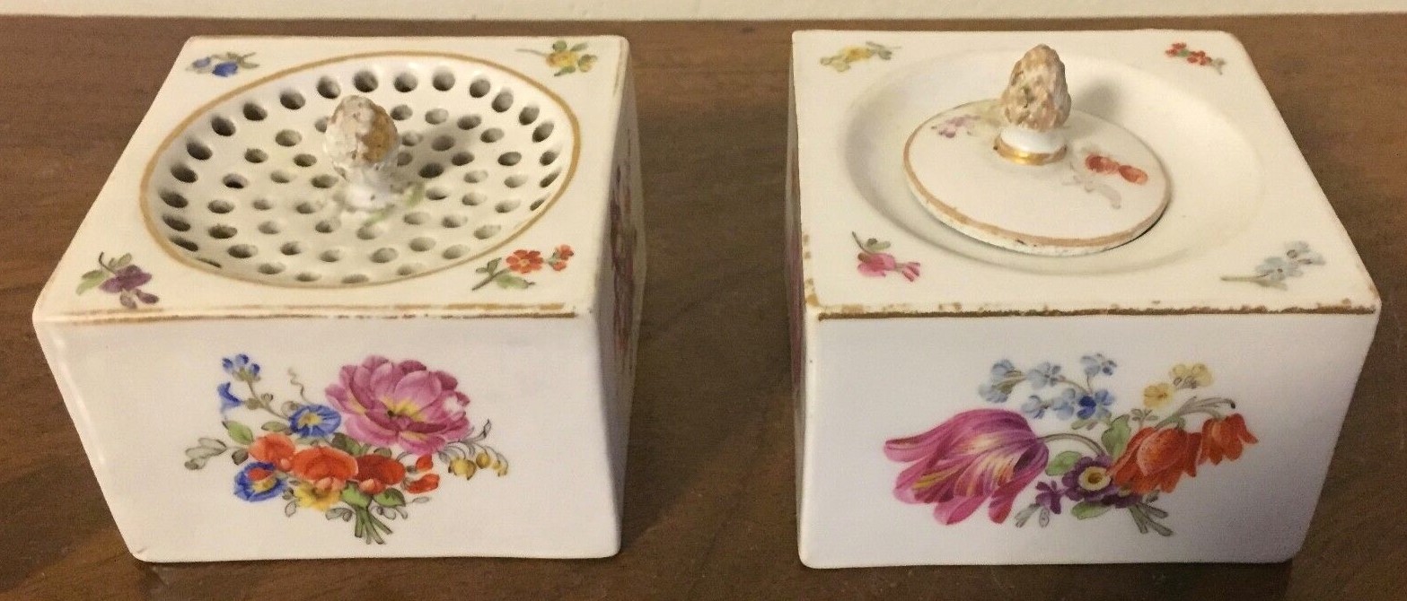 German Meissen porcelain inkwell and pounce pot. Decorated on all sides with different floral sprigs, and fully marked on the base.