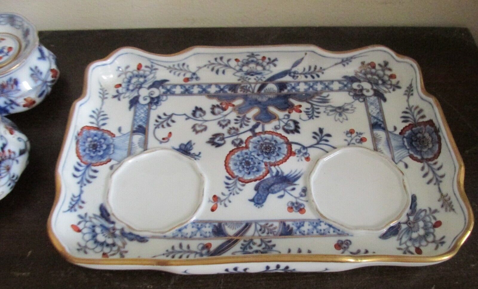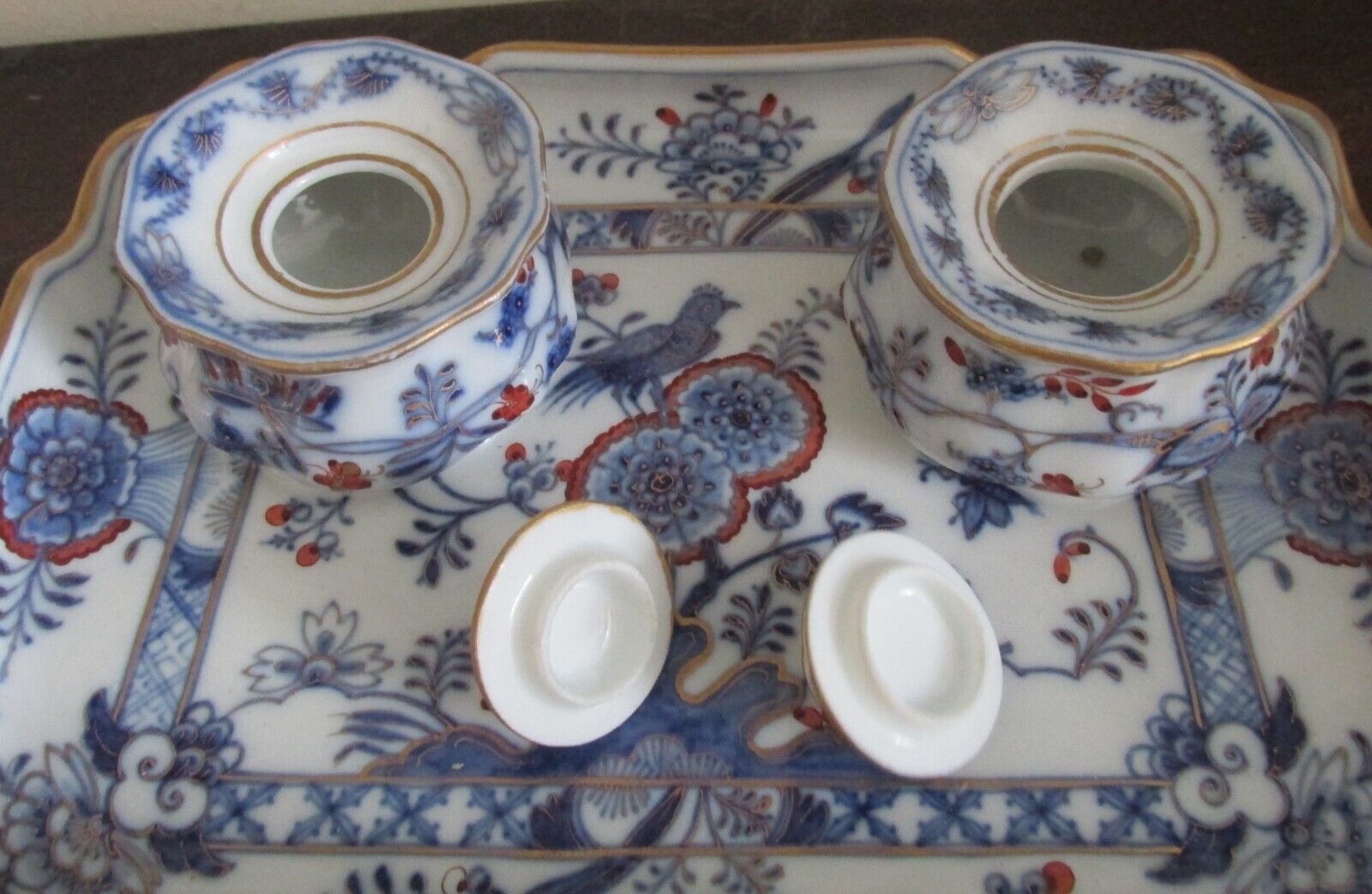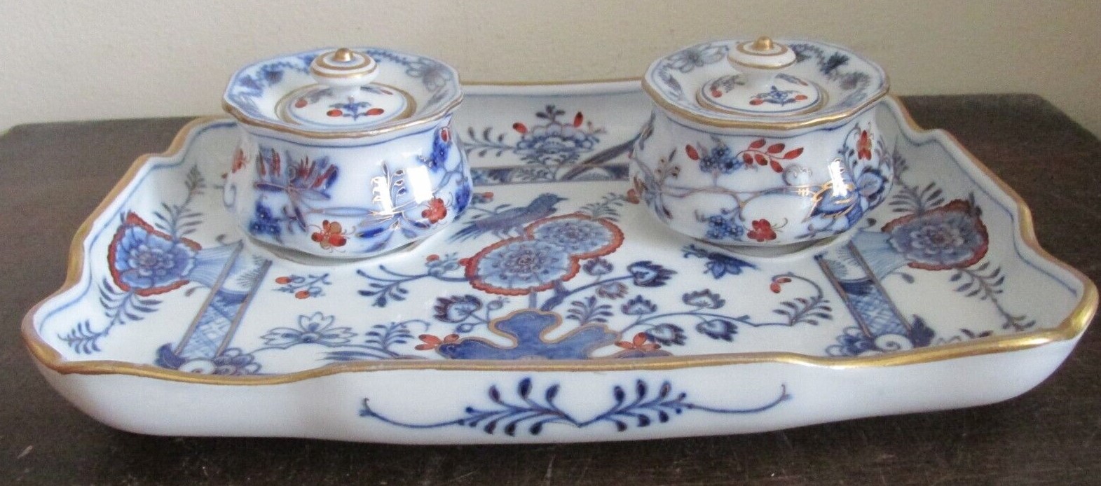 Meissen Germany porcelain inkstand – hand painted in oranges, blues, and gold.