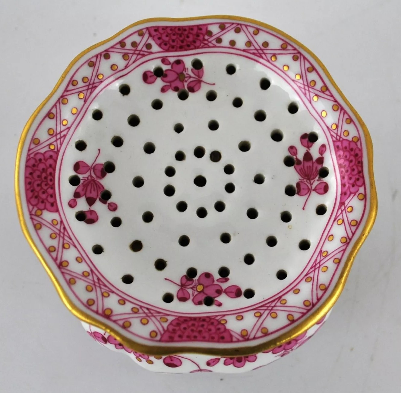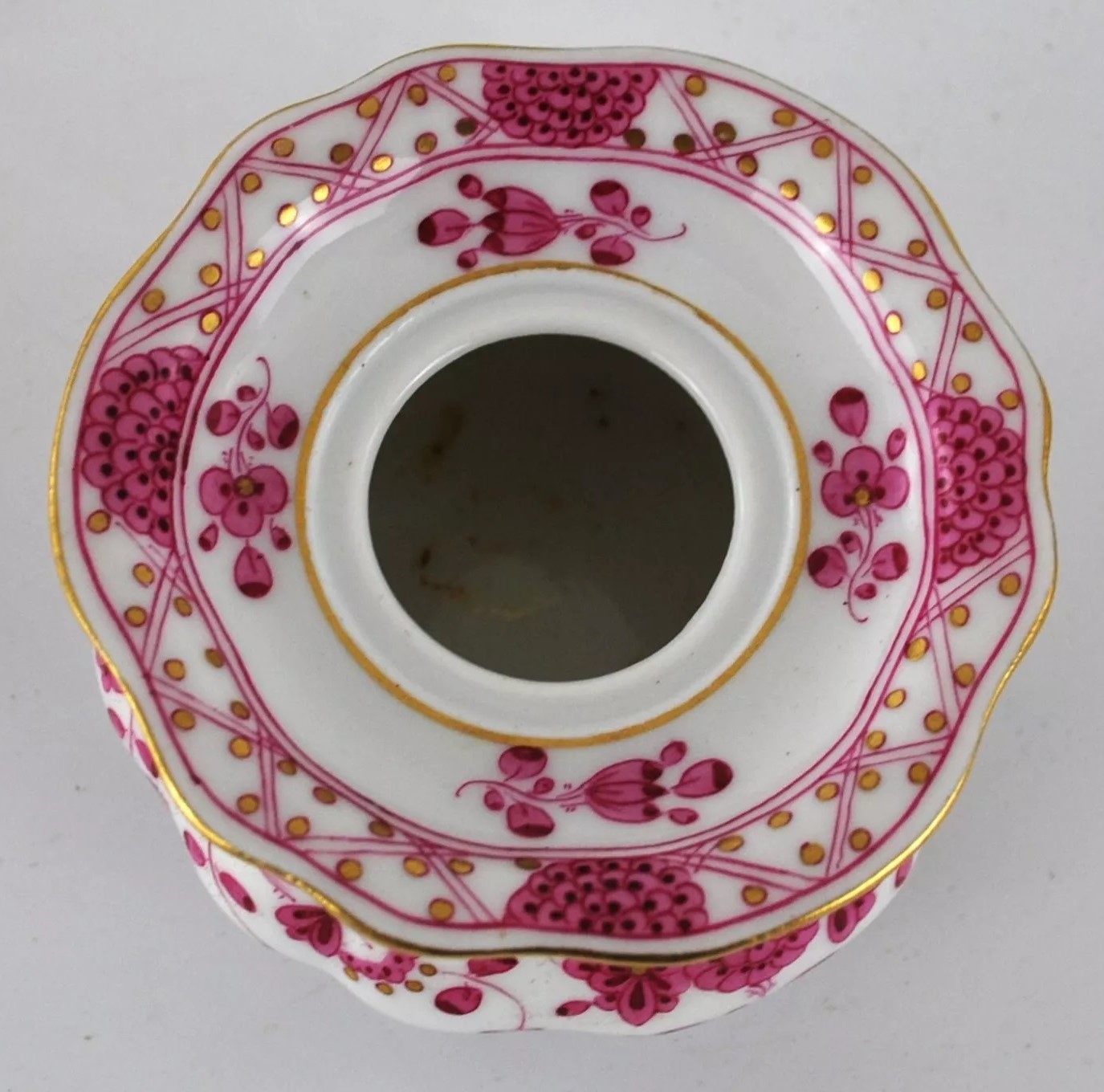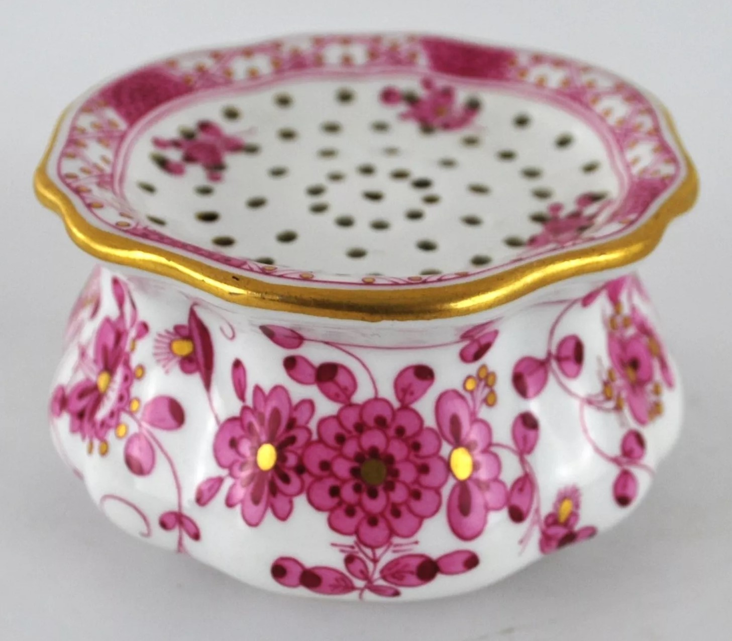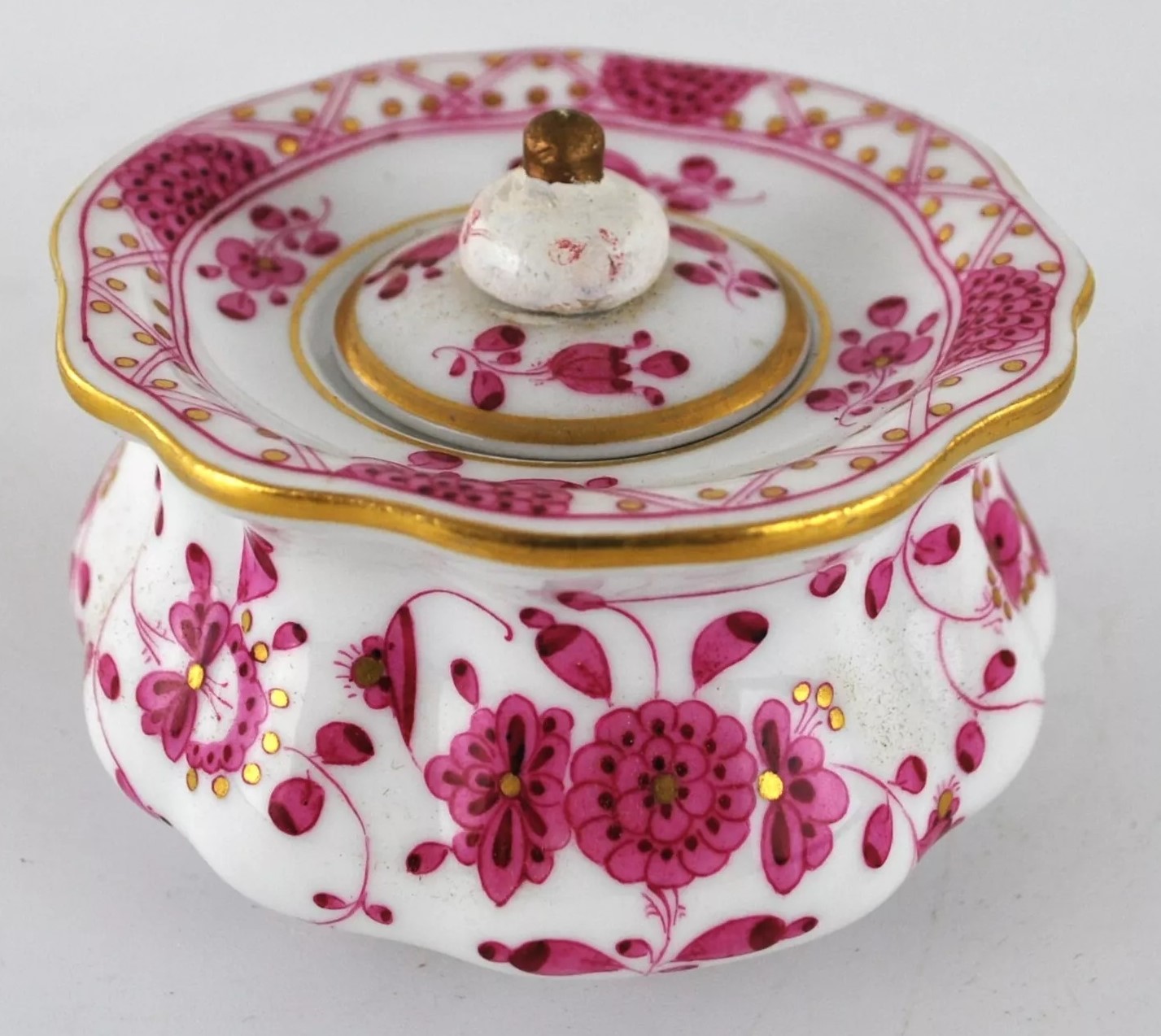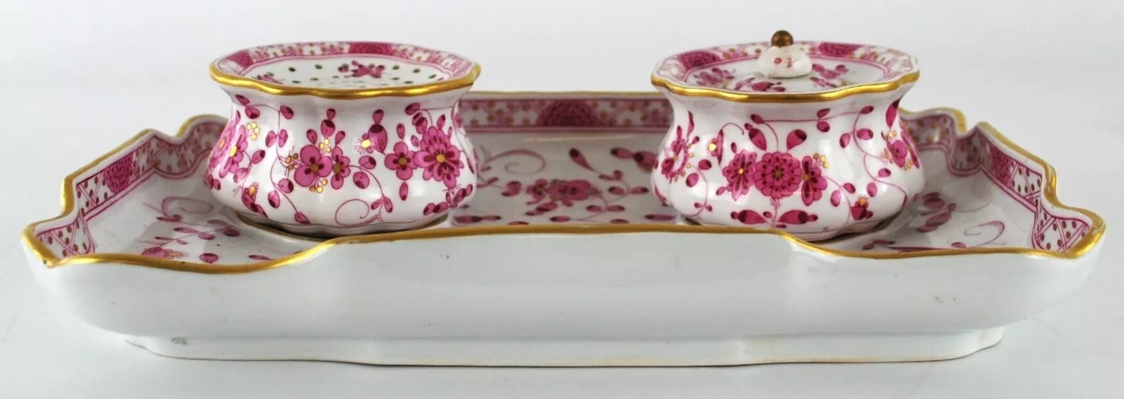 This Meissen inkstand includes an inkwell and a sander, both placed on a tray. The tray itself features scalloped edges with gilded detailing. The inkwell and sander are adorned with pink floral patterns and gold accents, one of Meissen’s iconic decorative motifs called “Indianische Blumen” (Indian Flowers). The blue underglaze crossed swords mark with pommels on the underside signifies its origin from the Royal Manufactory Meissen, one of the most renowned porcelain manufacturers in Europe.