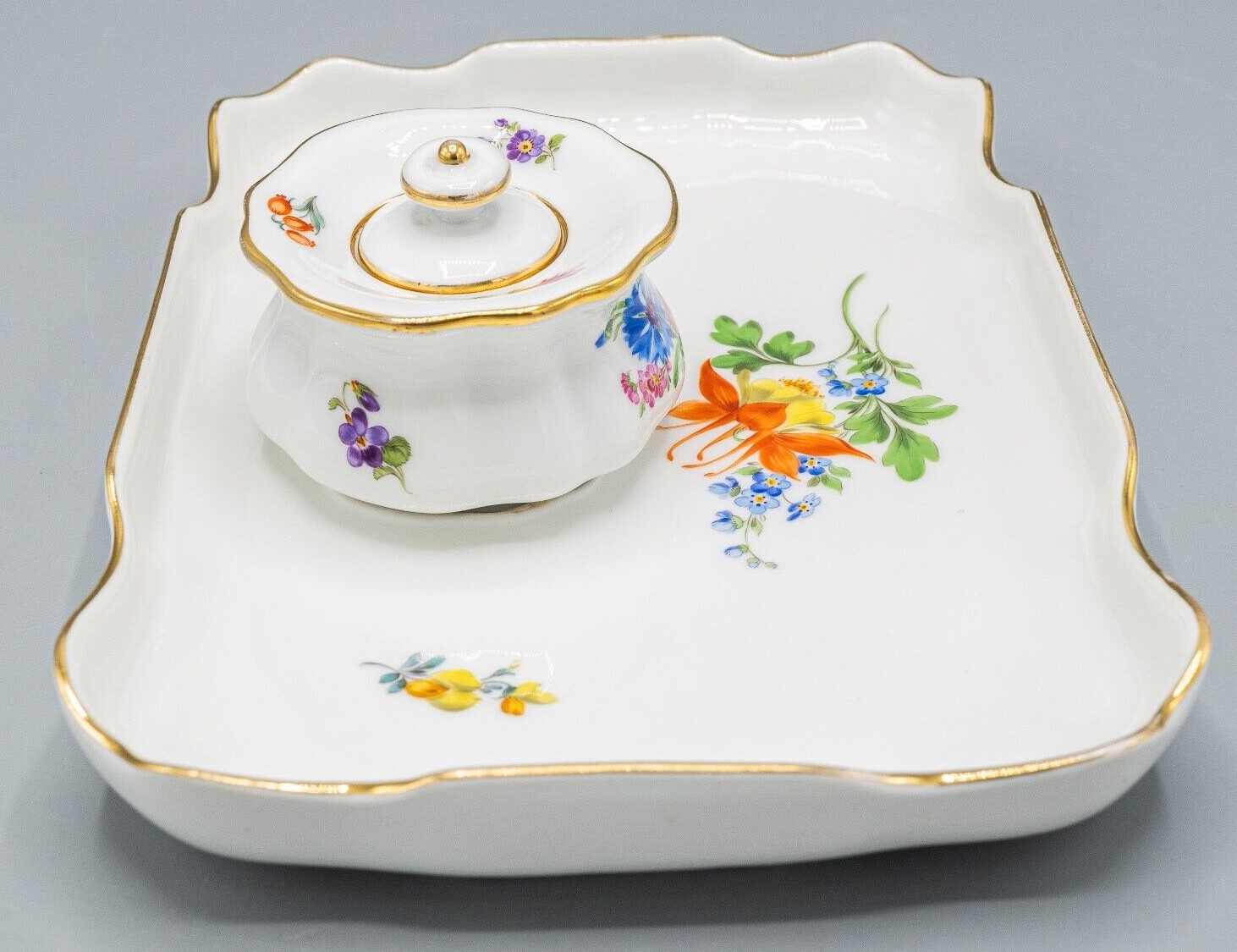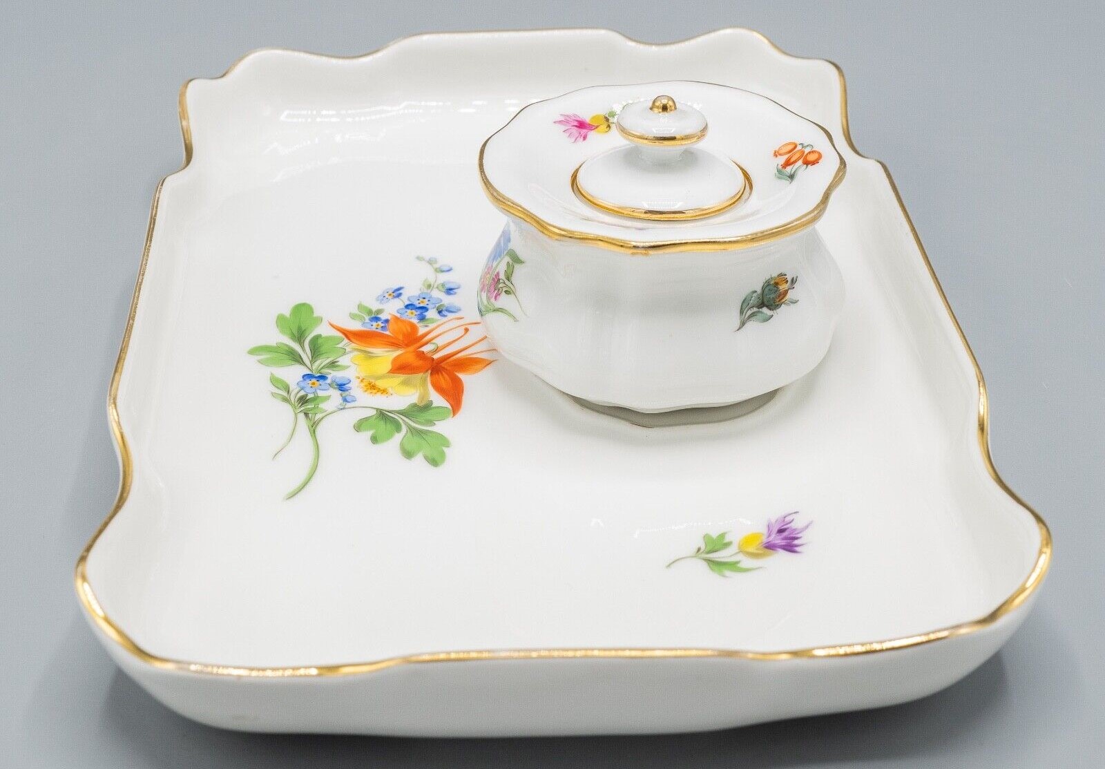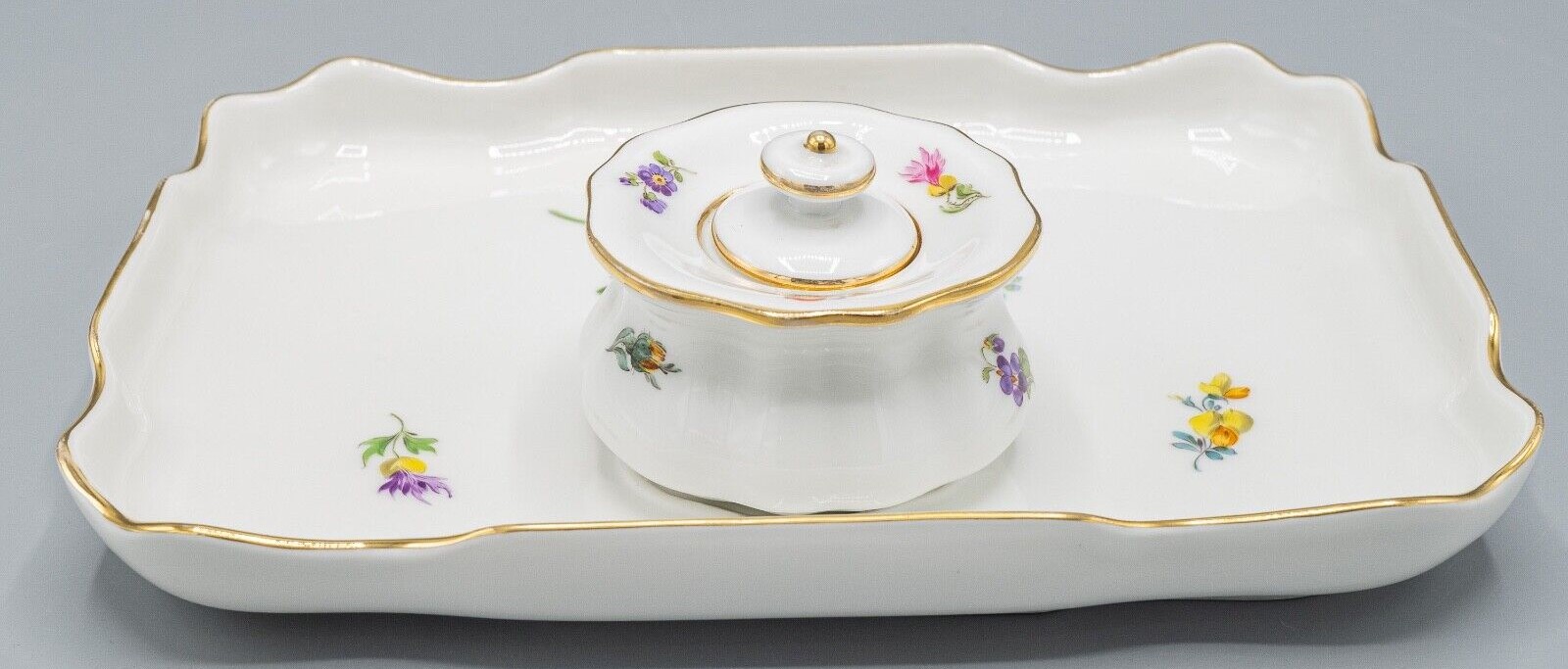 Beautifully rendered porcelain inkwell with tray featuring scatterings of flowers.