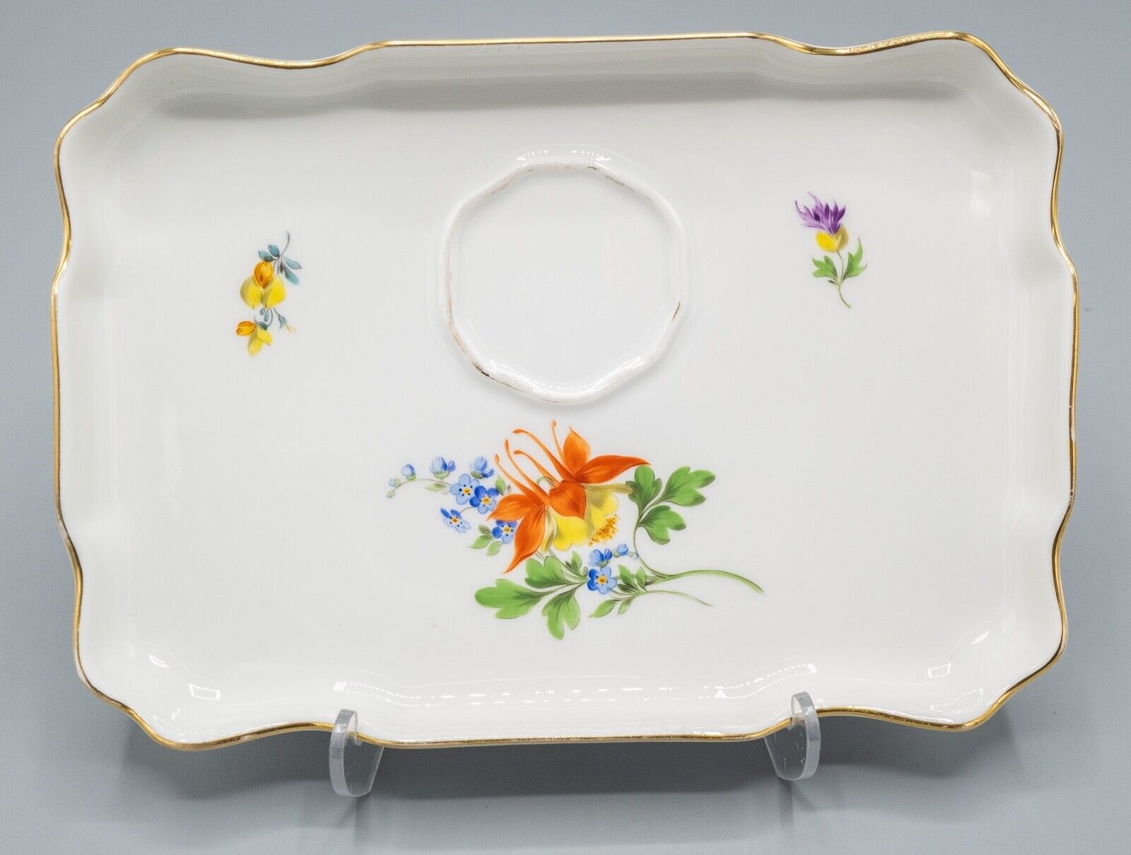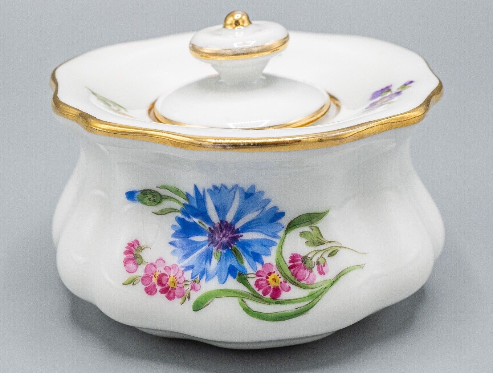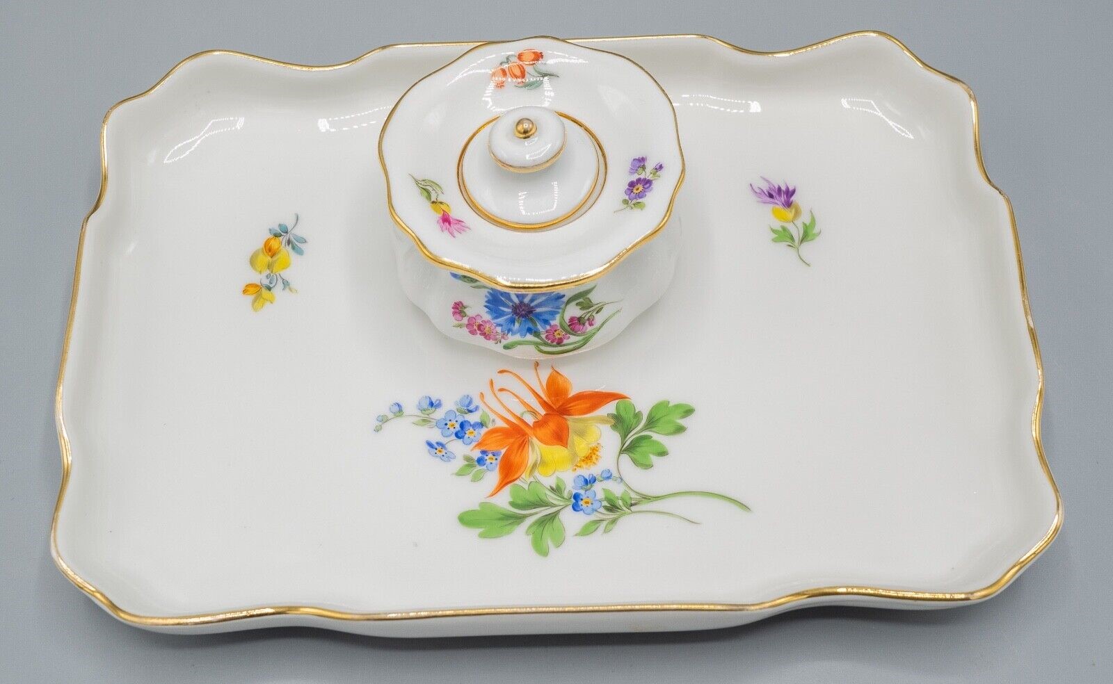 Beautifully rendered porcelain inkwell with tray featuring scatterings of flowers.