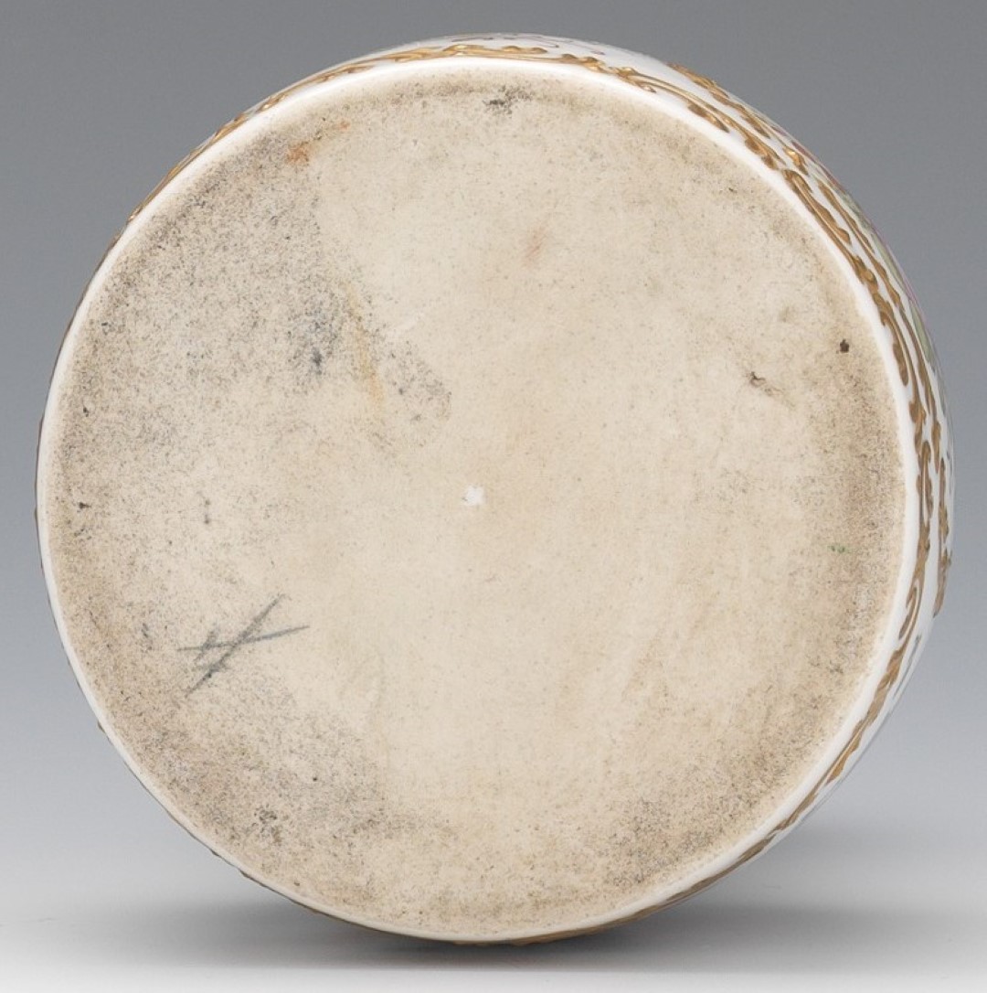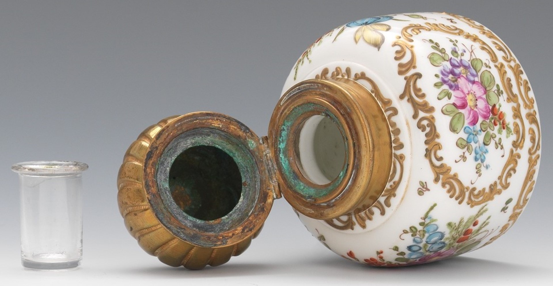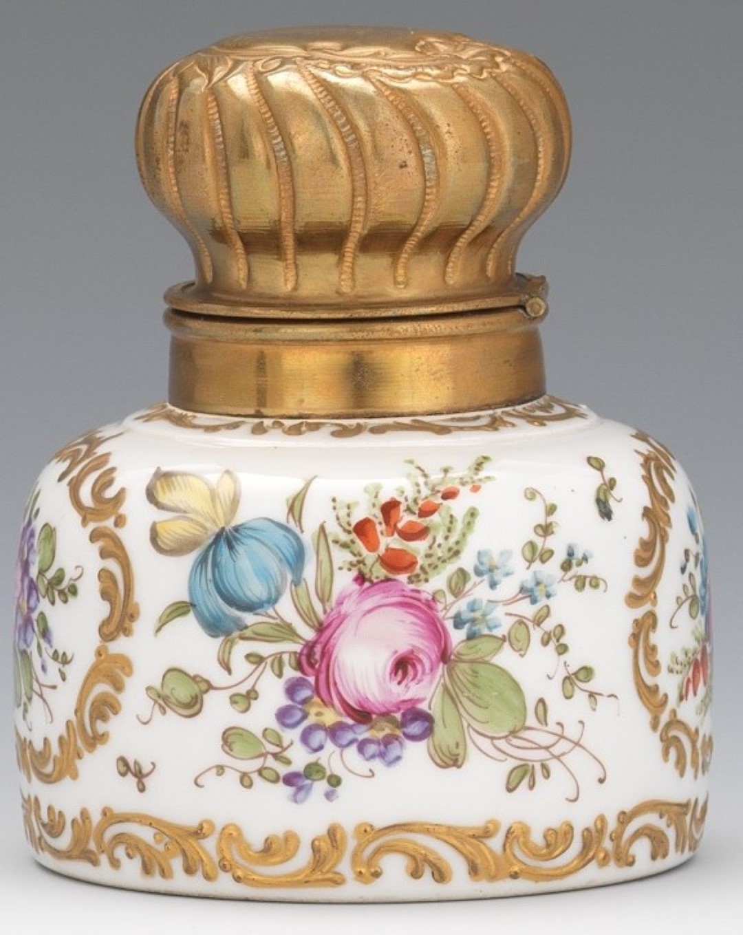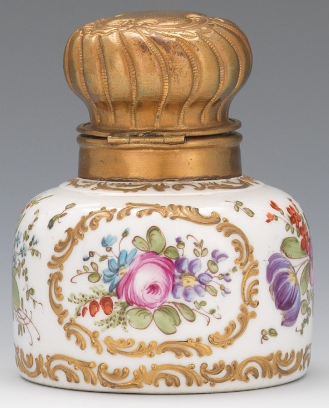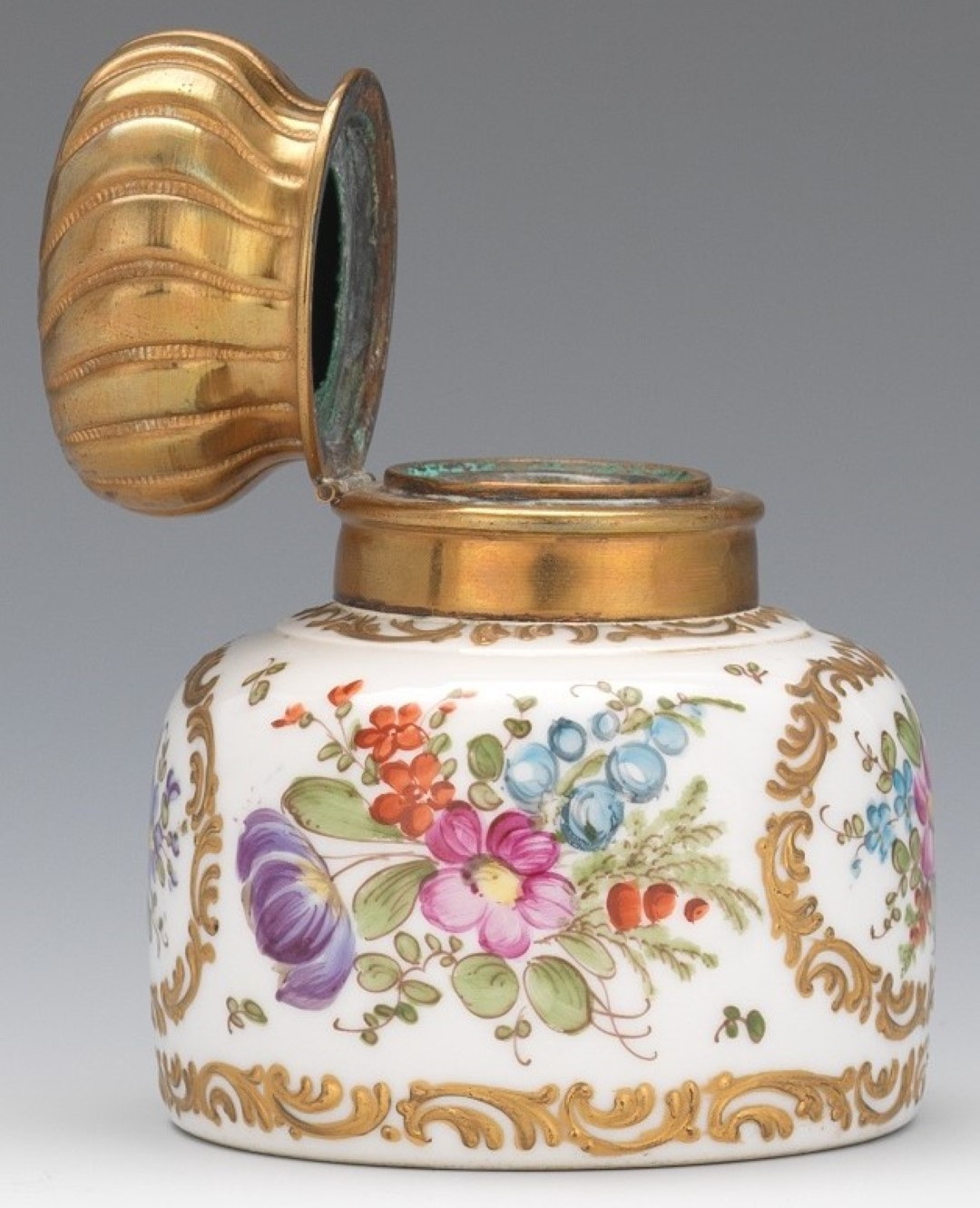 Meissen porcelain inkwell, hand decorated with polychrome sprays of flowers surrounded by raised gilt scrolls, brass collar and chased hinged lid covering a glass insert. Marked underneath with their “crossed swords” mark.
