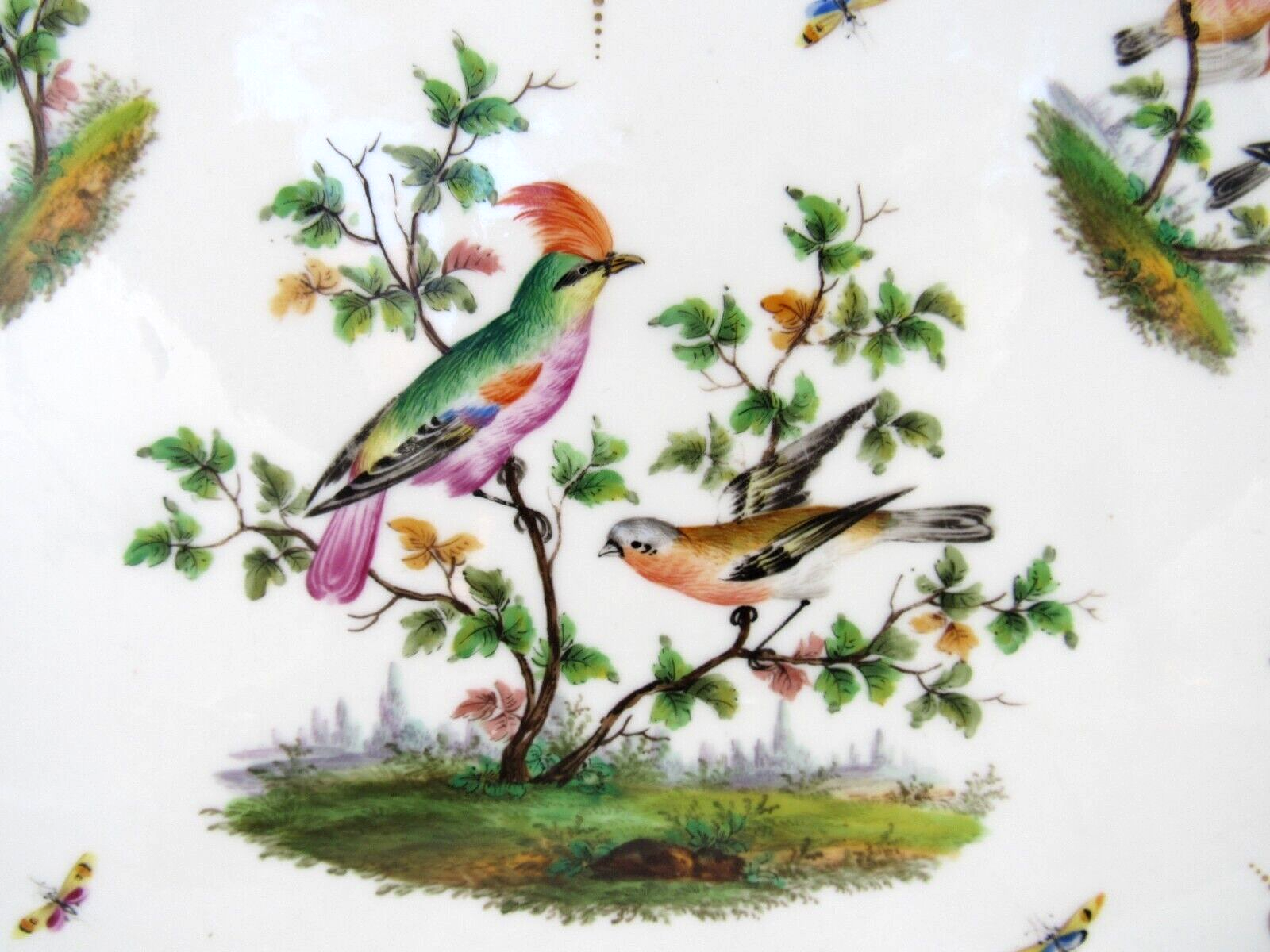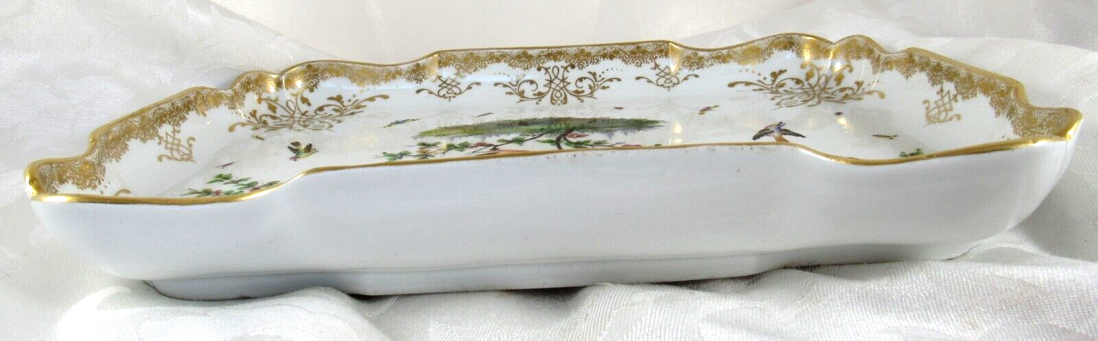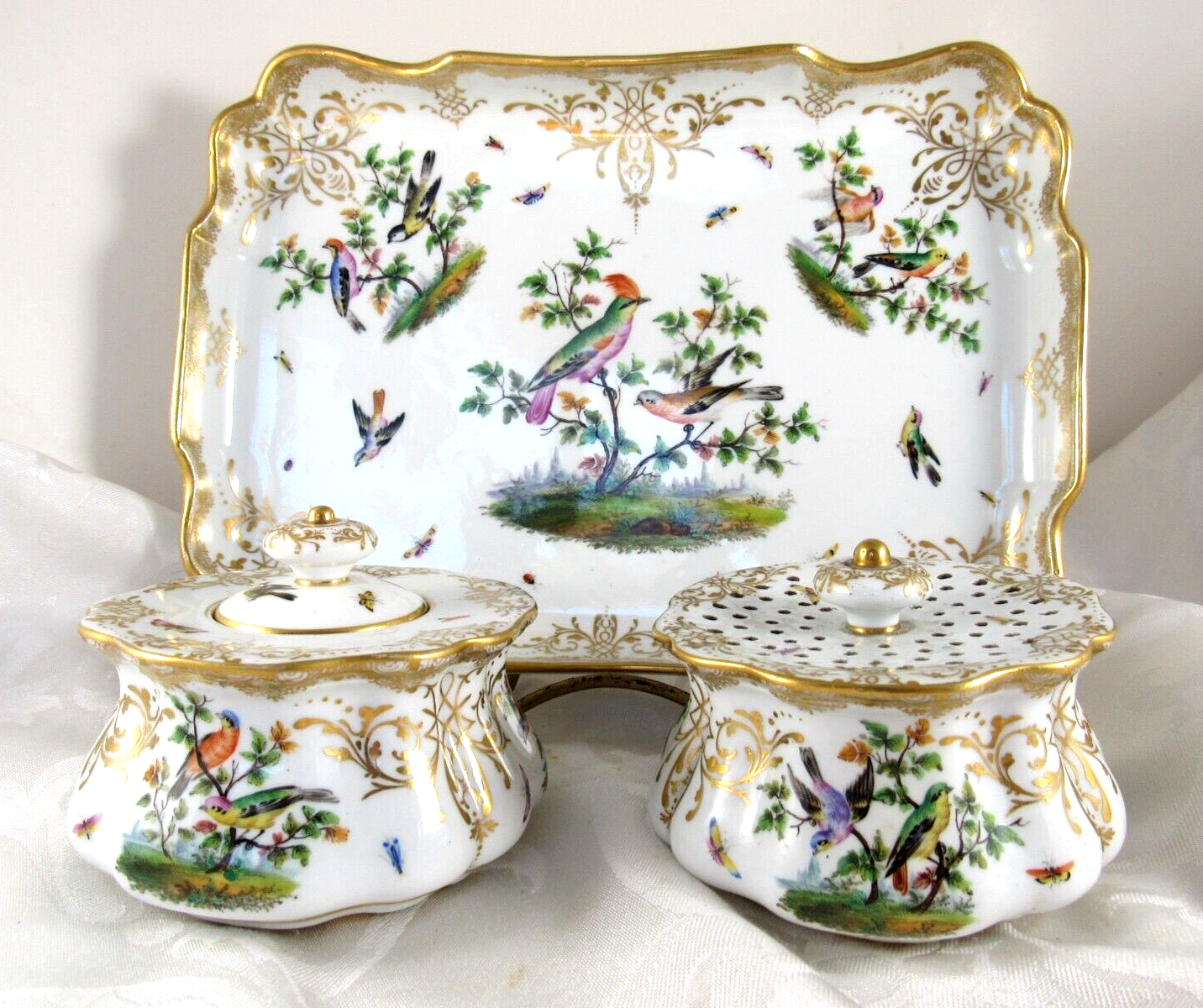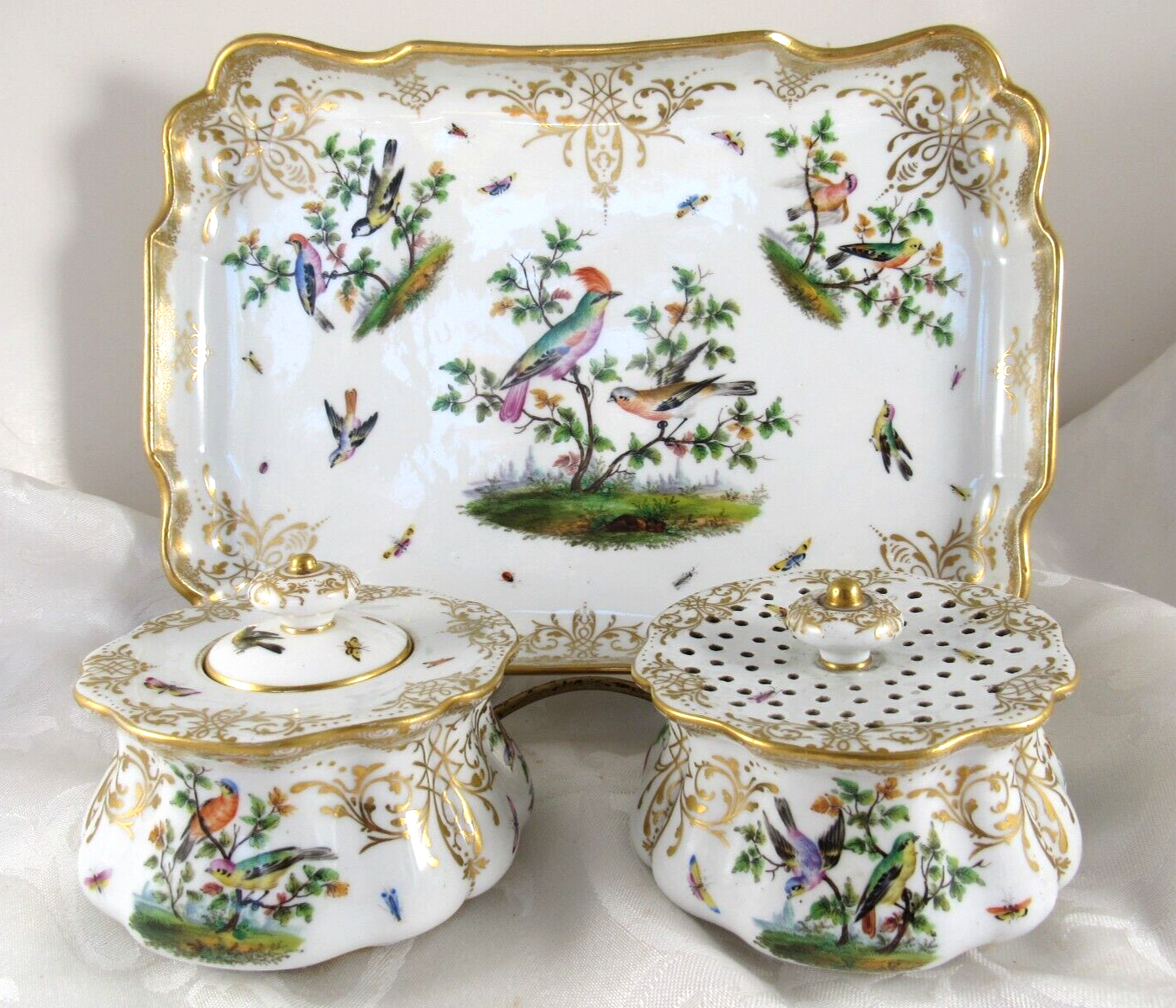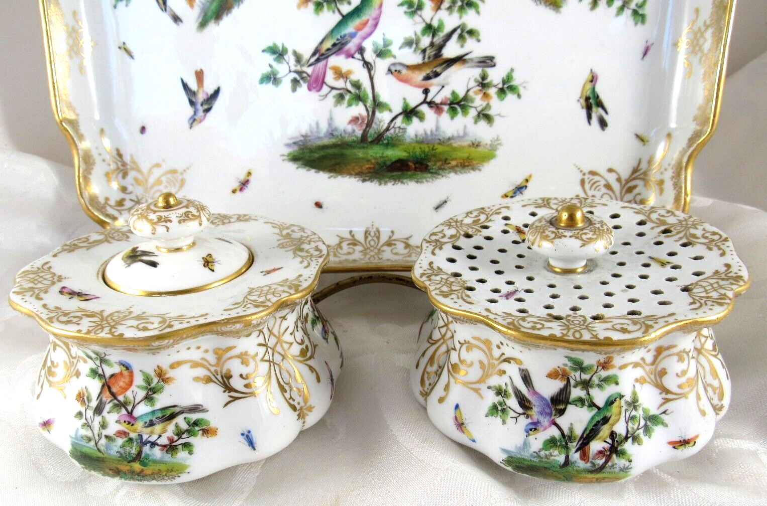 Made of white Meissen porcelain, the tray’s edges are scalloped and gilded. The surface is adorned with colorful and detailed renderings of birds and insects. The inkwell and sander are round, scalloped shaped pots with similar bird decorations as the tray. Such detail – even on the inkwell’s small lid, and between the holes on the sander, there are tiny renderings of birds / insects. Blue underglaze crossed swords with pommels mark for the Royal Manufactory Meissen.