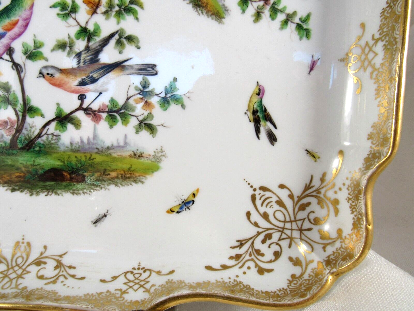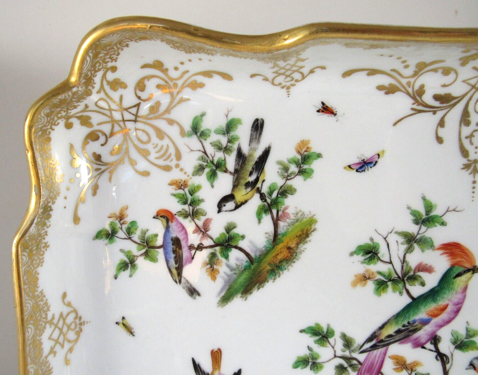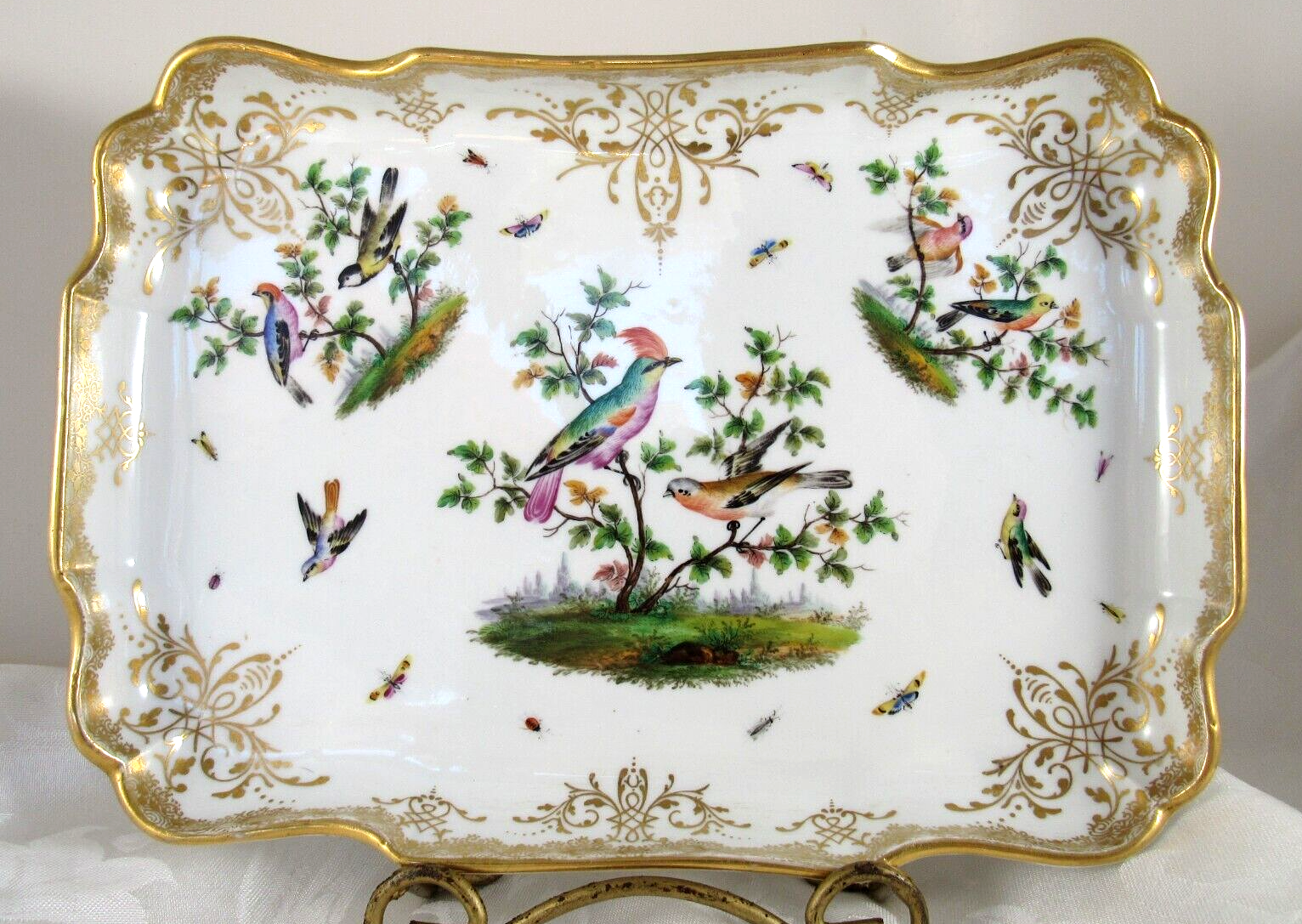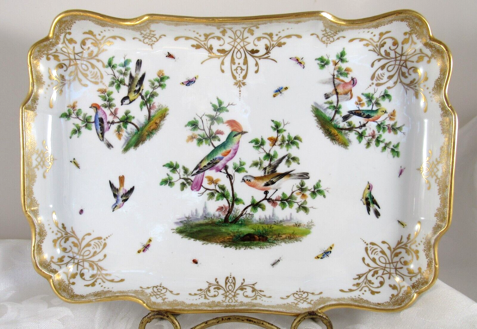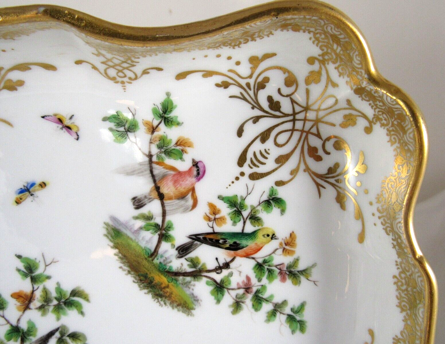 Made of white Meissen porcelain, the tray’s edges are scalloped and gilded. The surface is adorned with colorful and detailed renderings of birds and insects. The inkwell and sander are round, scalloped shaped pots with similar bird decorations as the tray. Such detail – even on the inkwell’s small lid, and between the holes on the sander, there are tiny renderings of birds / insects. Blue underglaze crossed swords with pommels mark for the Royal Manufactory Meissen.