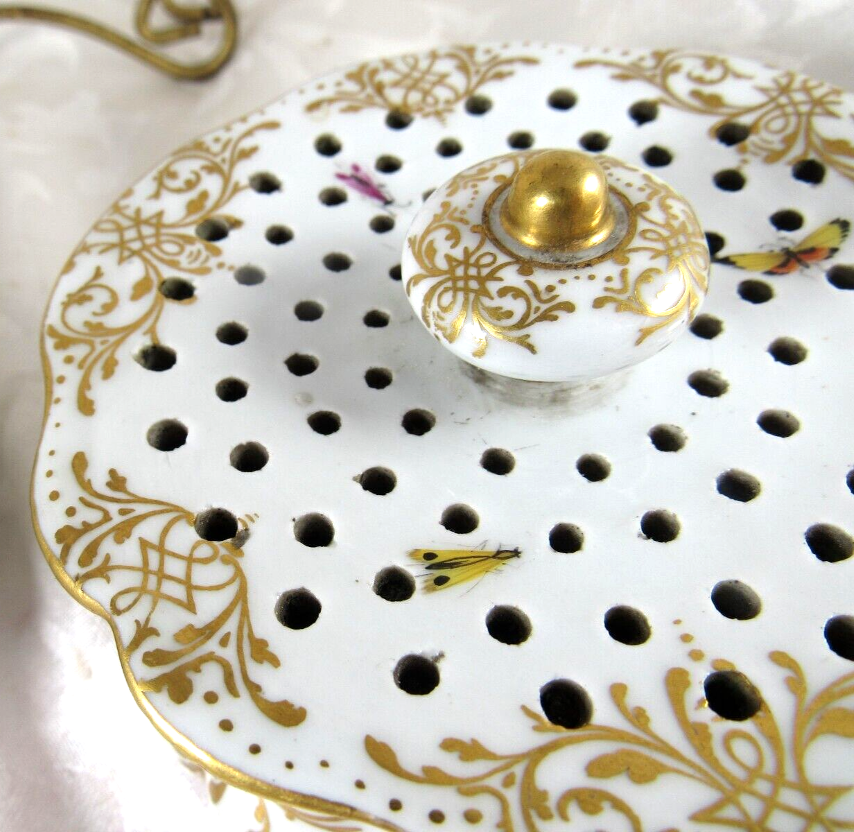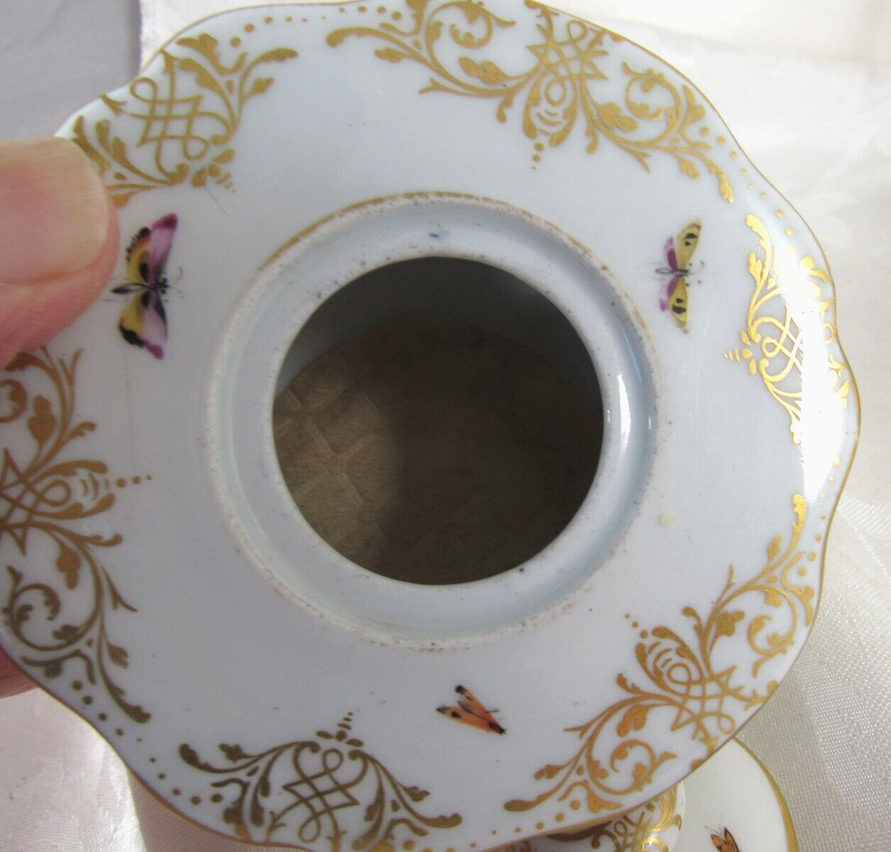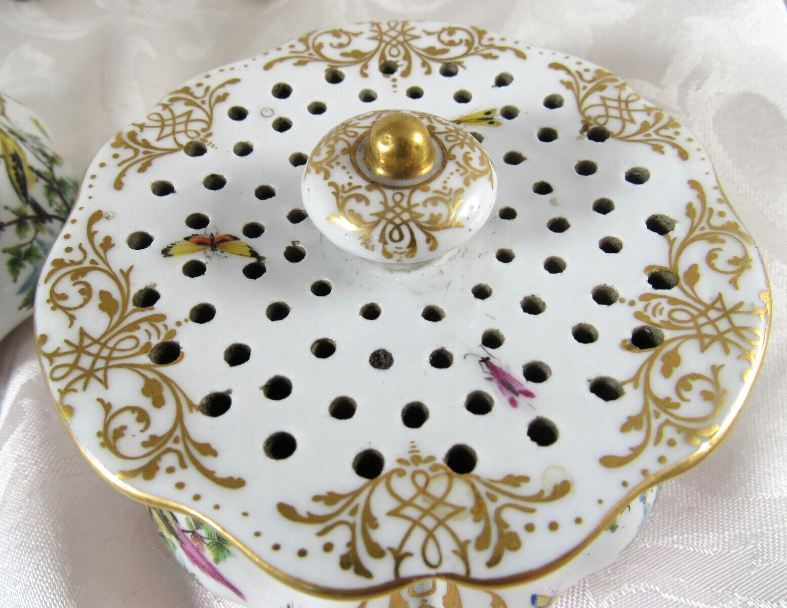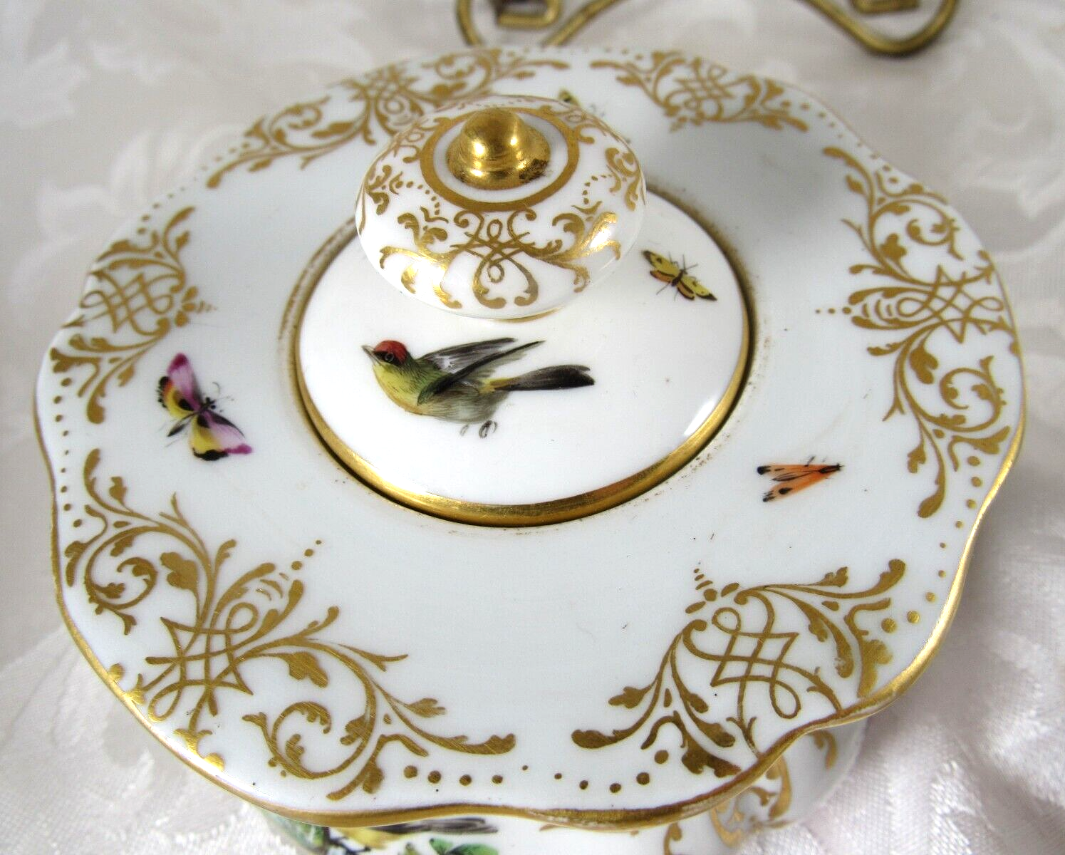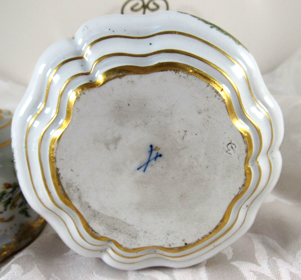 Made of white Meissen porcelain, the tray’s edges are scalloped and gilded. The surface is adorned with colorful and detailed renderings of birds and insects. The inkwell and sander are round, scalloped shaped pots with similar bird decorations as the tray. Such detail – even on the inkwell’s small lid, and between the holes on the sander, there are tiny renderings of birds / insects. Blue underglaze crossed swords with pommels mark for the Royal Manufactory Meissen.