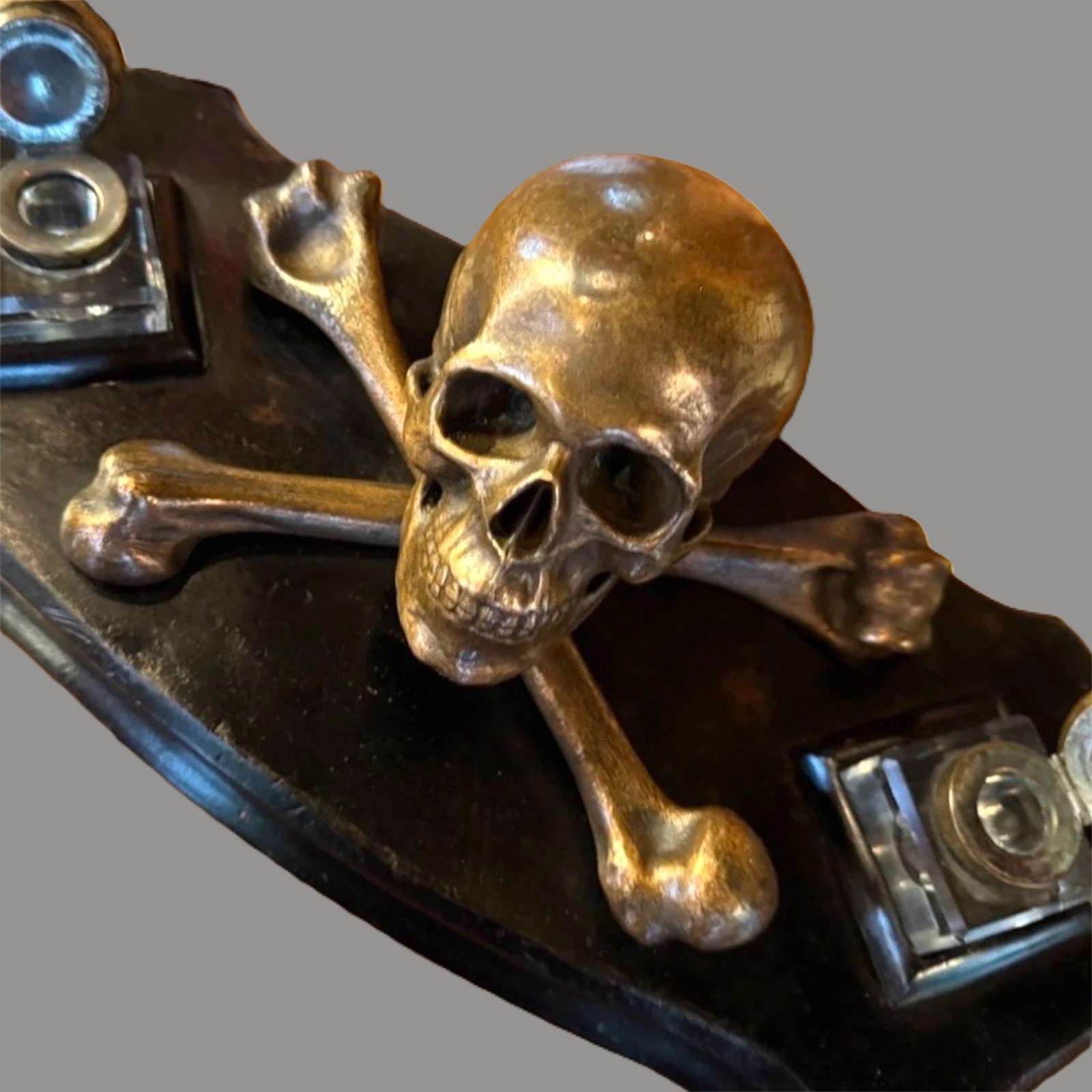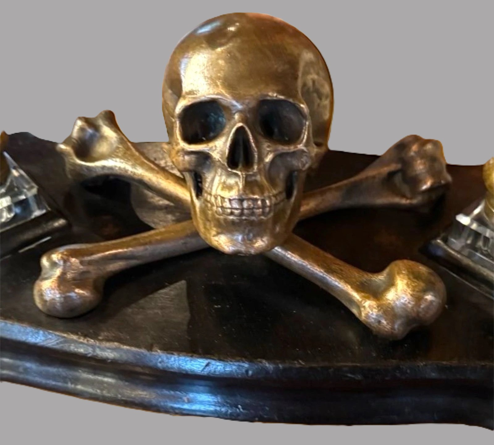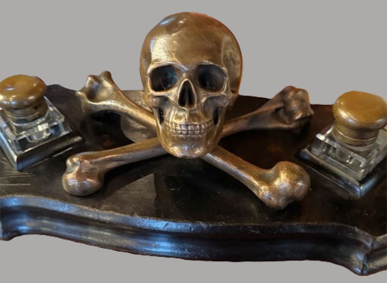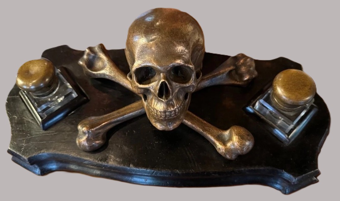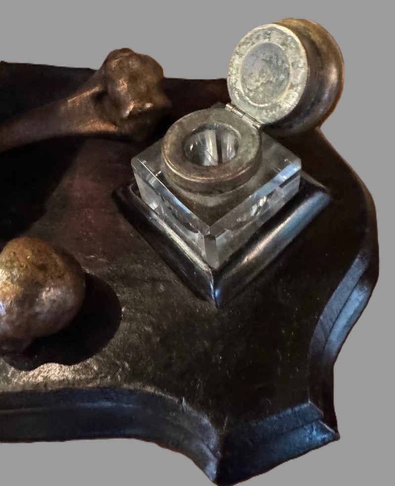 - Inkwells: The two square, cut-glass wells are positioned symmetrically. The metal lids match the patina of the central skull. The entire structure is removable.