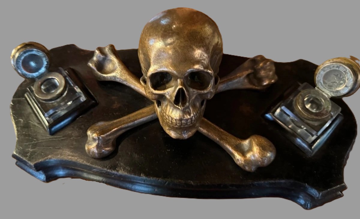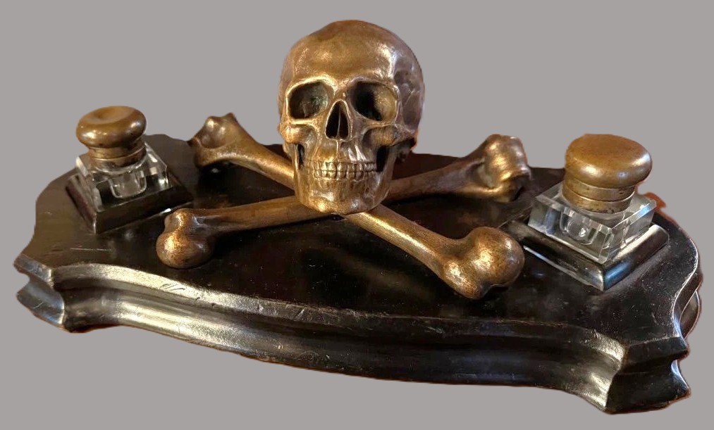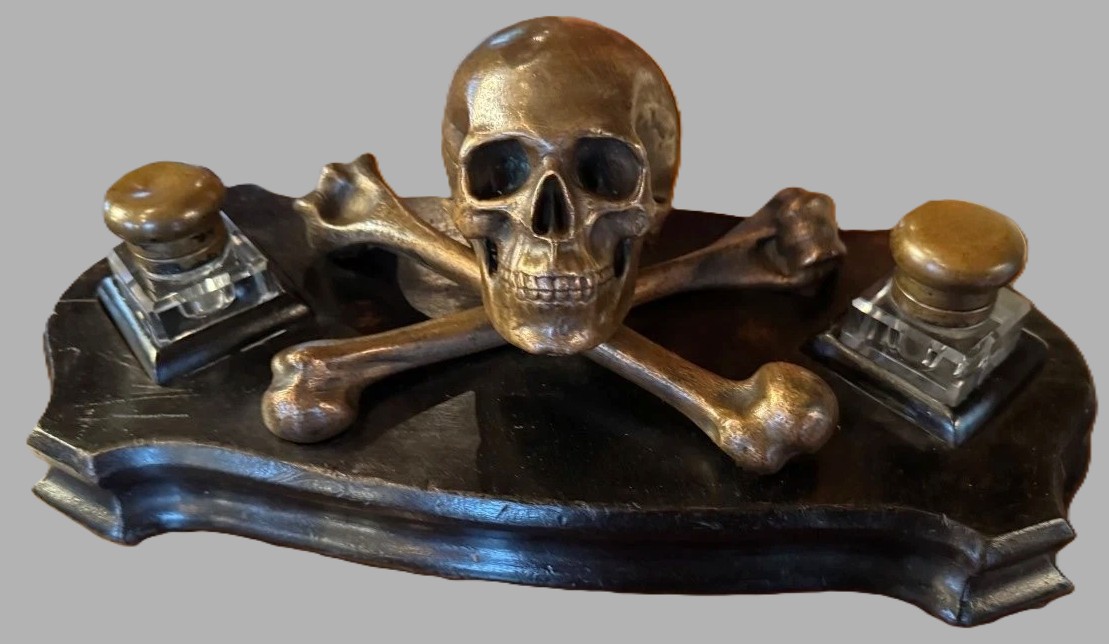 This is a striking Memento Mori (Latin for “remember you must die”) inkstand. Its design is a quintessential example of late 19th-century European craftsmanship, blending the macabre with the highly functional.