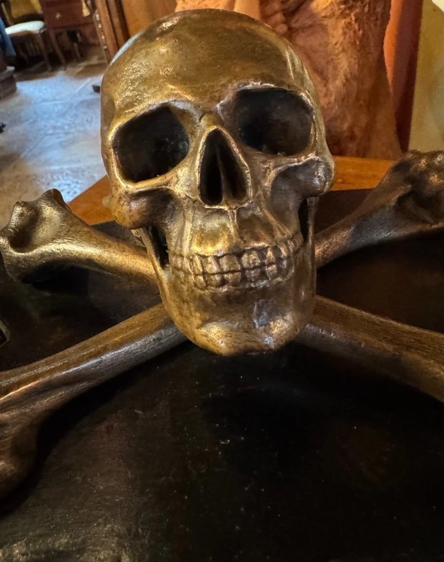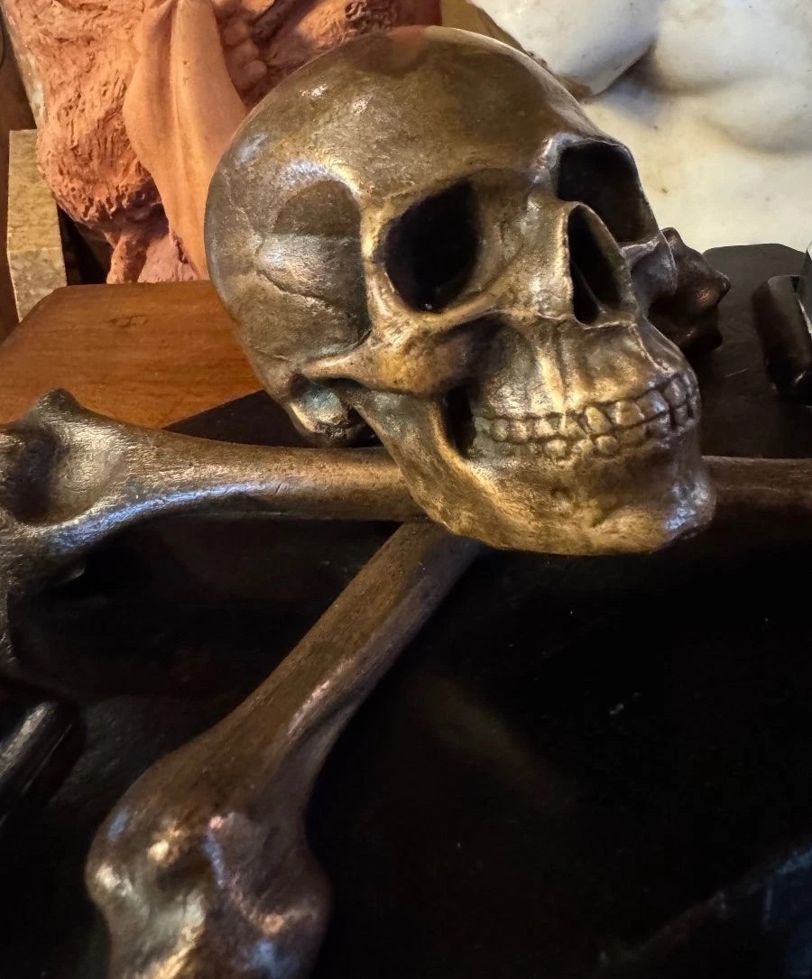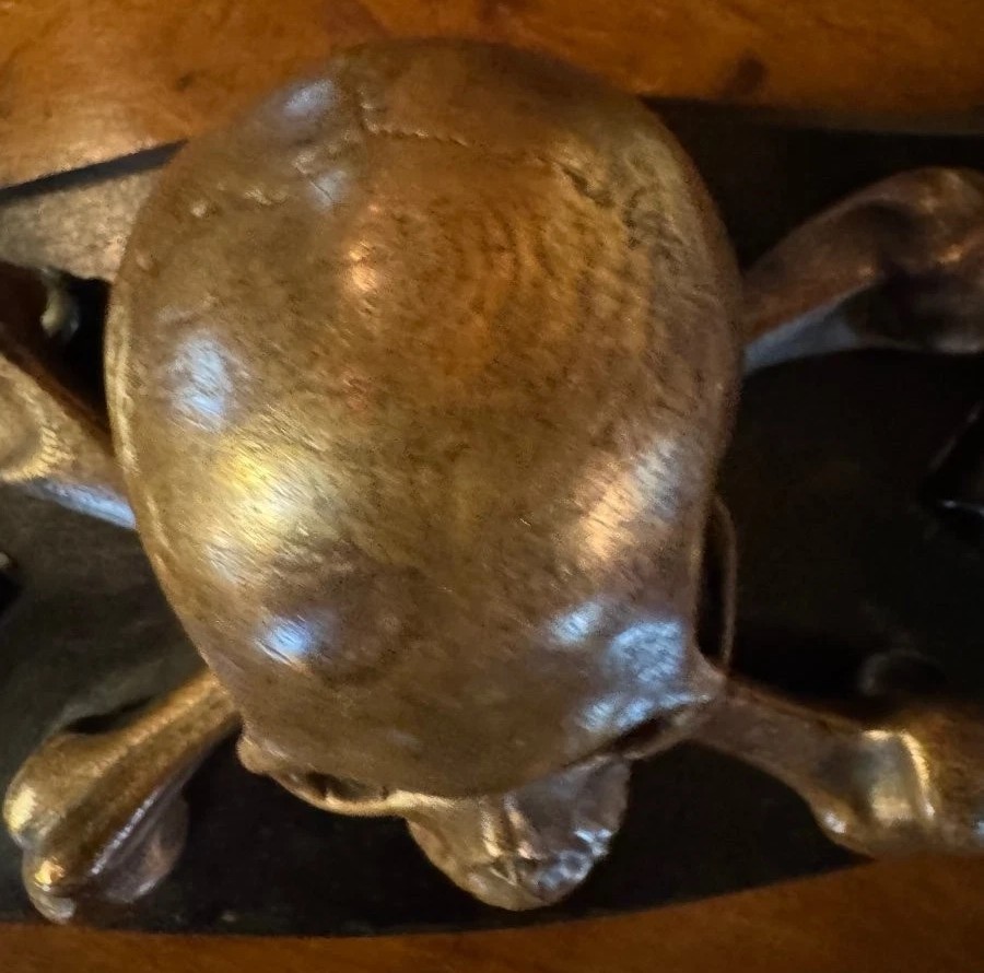 - Central Motif: The centerpiece is a finely cast patinated bronze skull resting atop crossed femurs. The level of anatomical detail—specifically the cranial sutures and the articulation of the jaw—suggests it was intended for a sophisticated audience, likely a scholar, physician, or a member of a fraternal order.