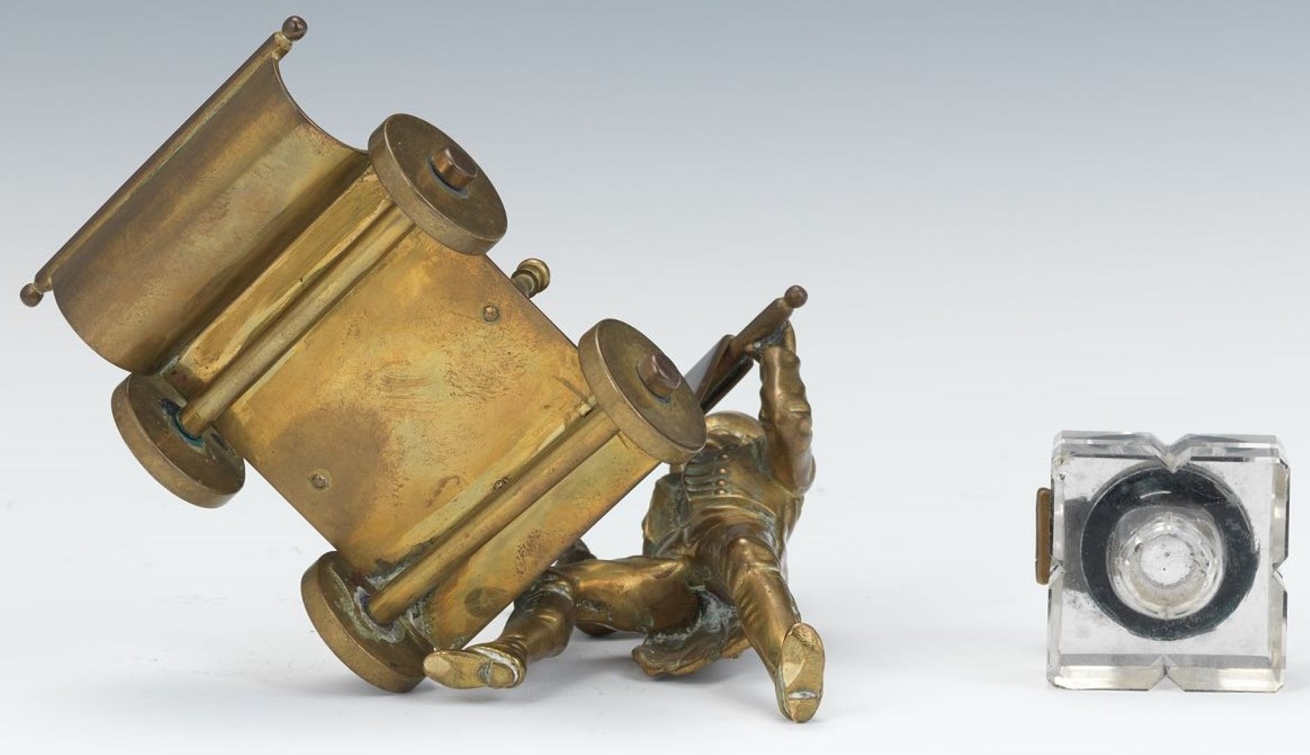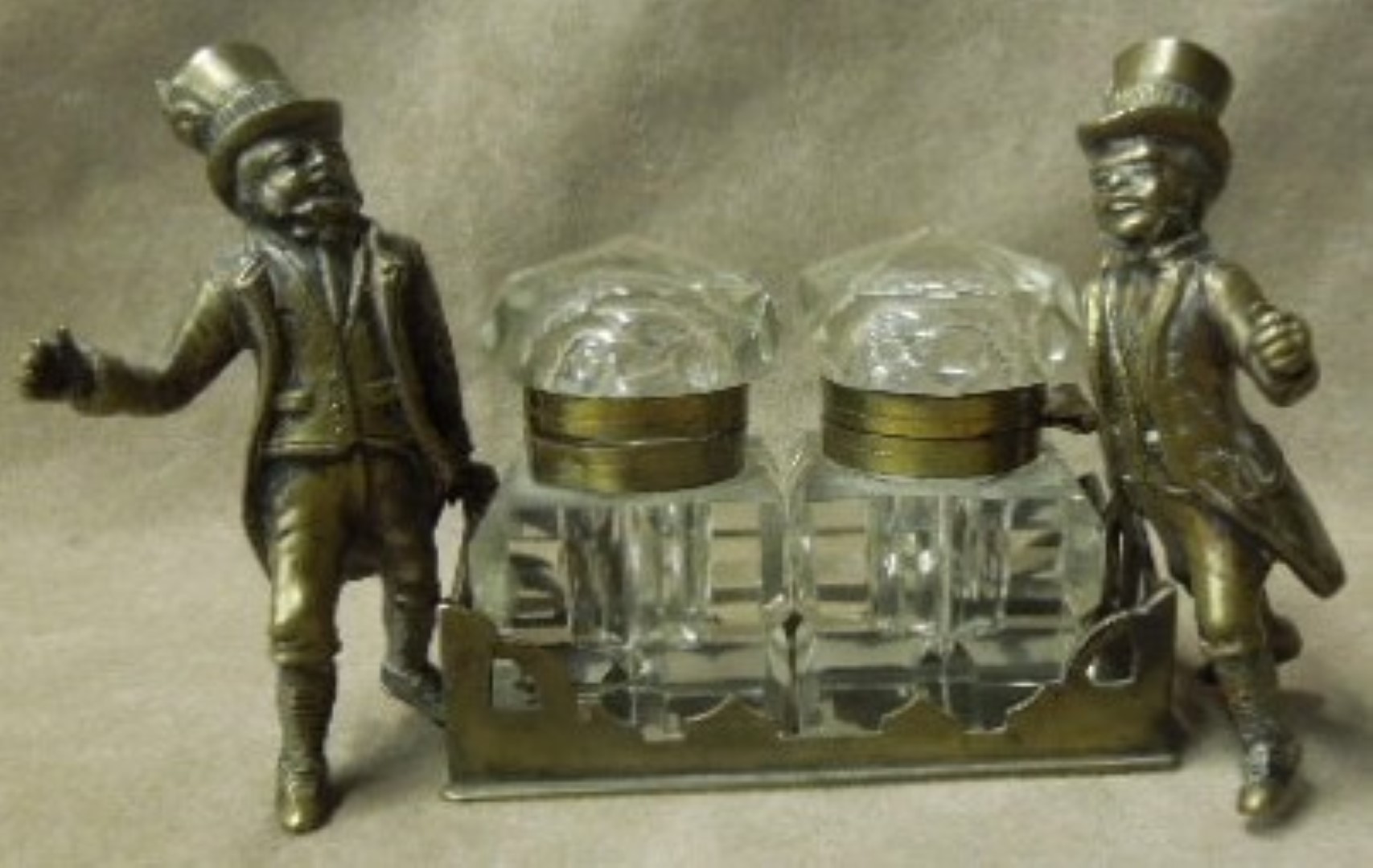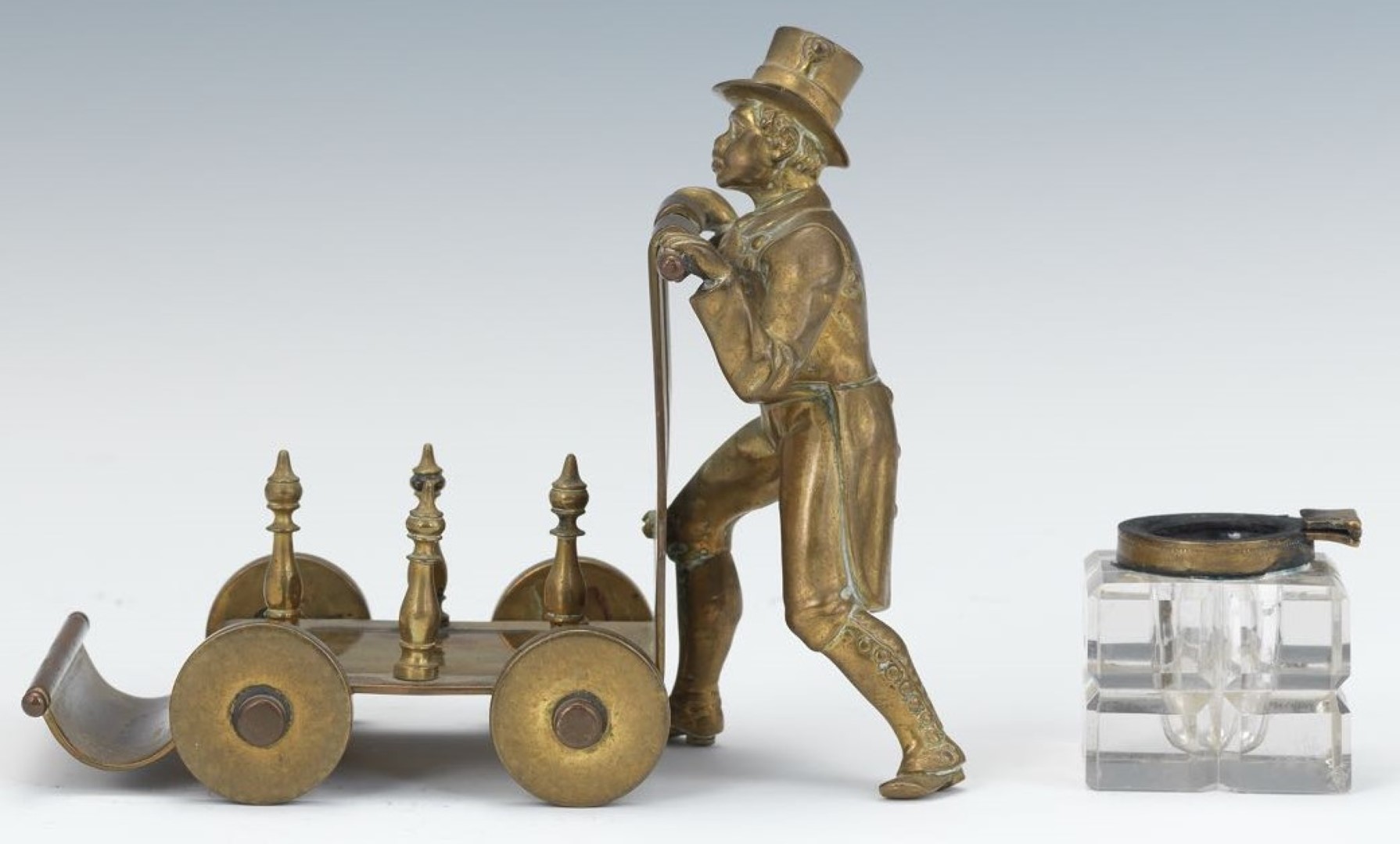 These two inkstands appear to be of the same manufacturer. Both feature men suited in 19th century garb, wearing top hats. The first shows a man pushing a four-wheel cart. The single cut glass inkwell is missing its lid. The second inkstand features men on either side of two inkwells.