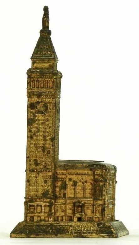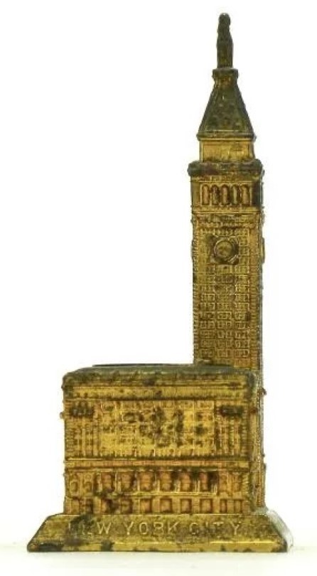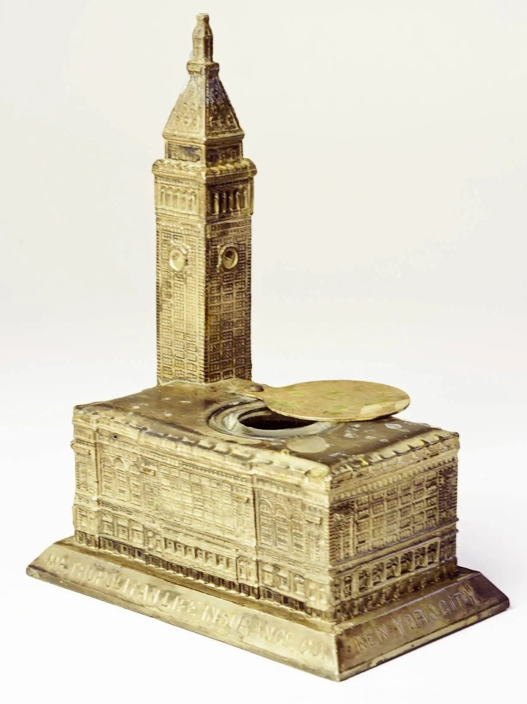 This advertising piece is an exact reproduction of the home office building of Metropolitan Life. It is made of gilded white metal. Around the base of the building are inscribed: “Home Office”; “Largest Office Building in the World”; “Metropolitan Life Insurance Co”; “New York City”. The inkwell is found in the middle of the roof and has a swivel cover. The inkwell was produced by Robert Stoll at 12 John Street in Manhattan. This is marked on the underside of the inkwell.