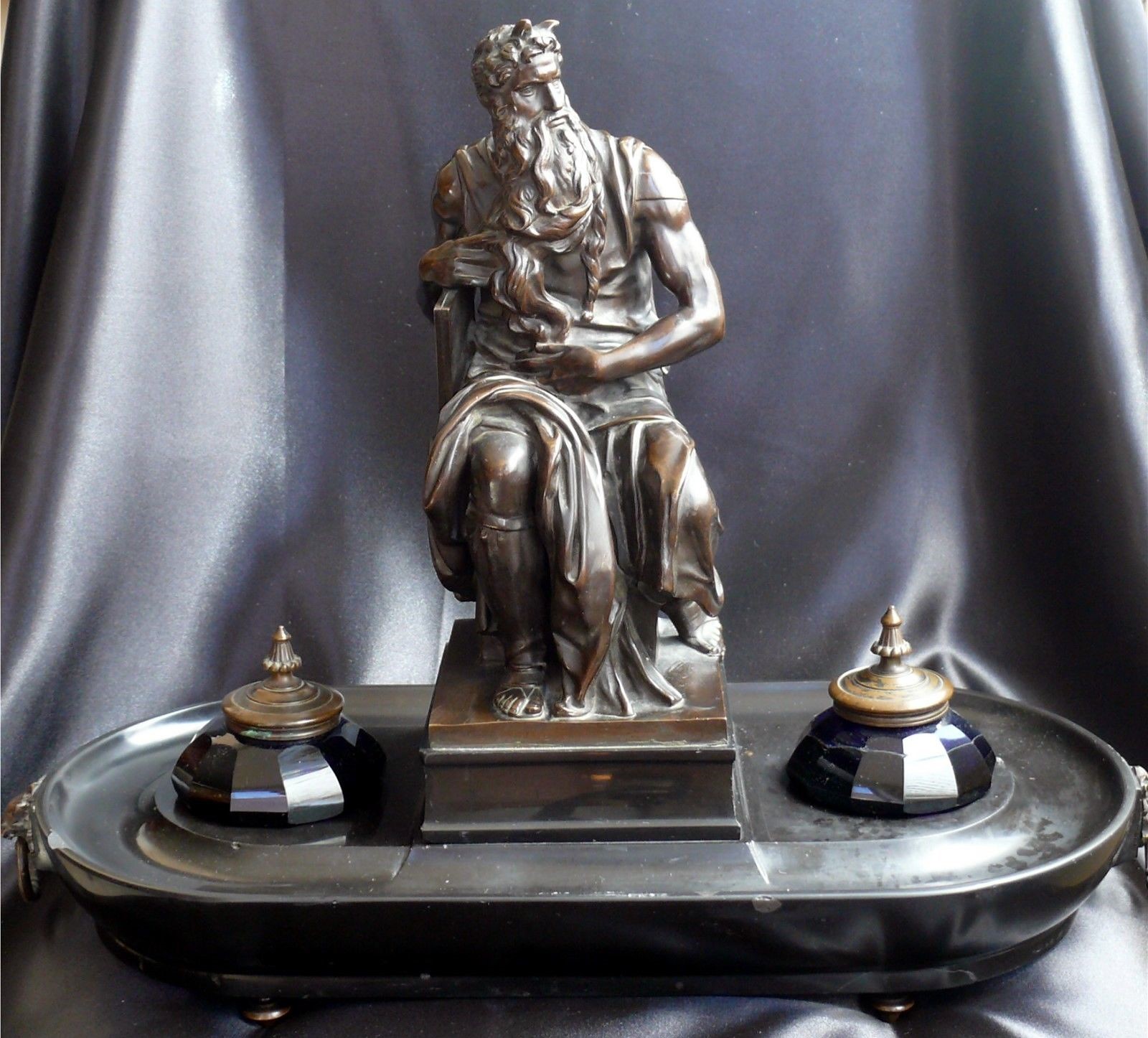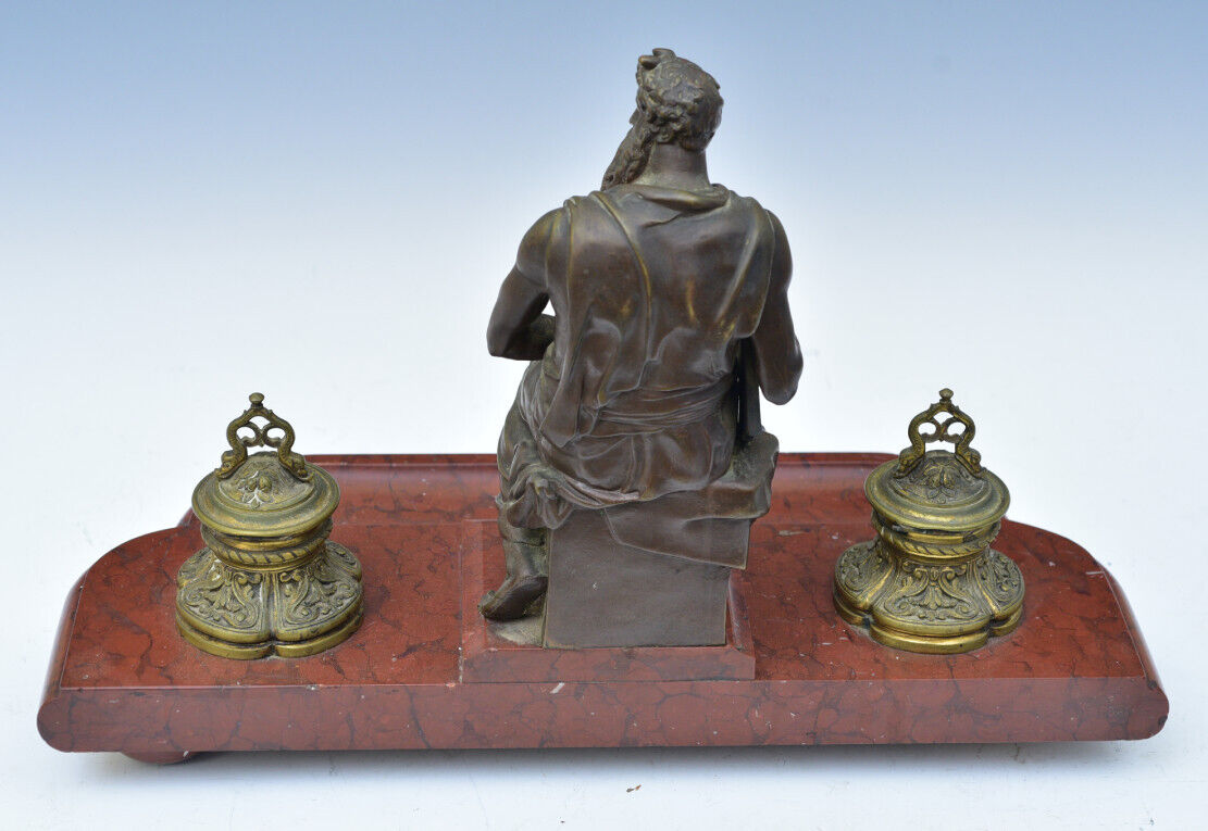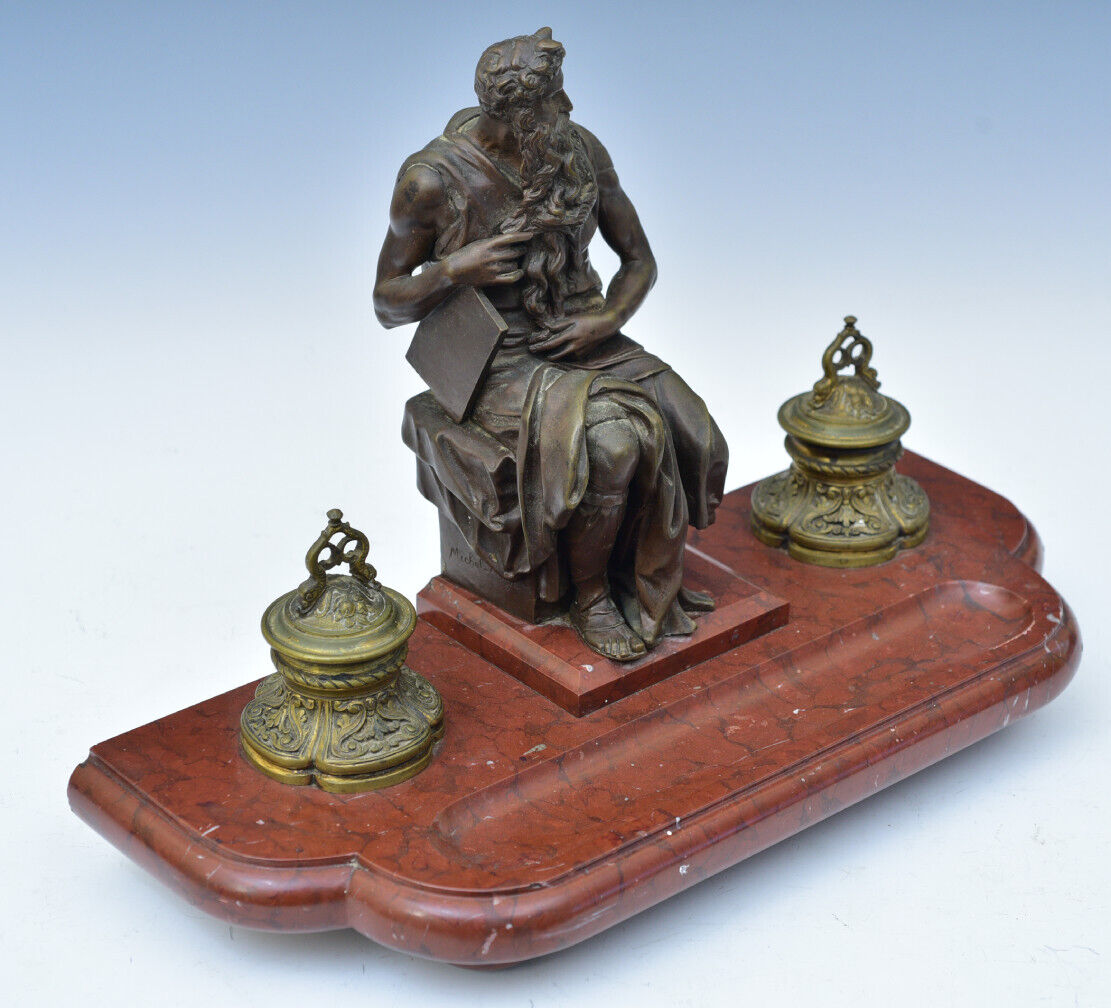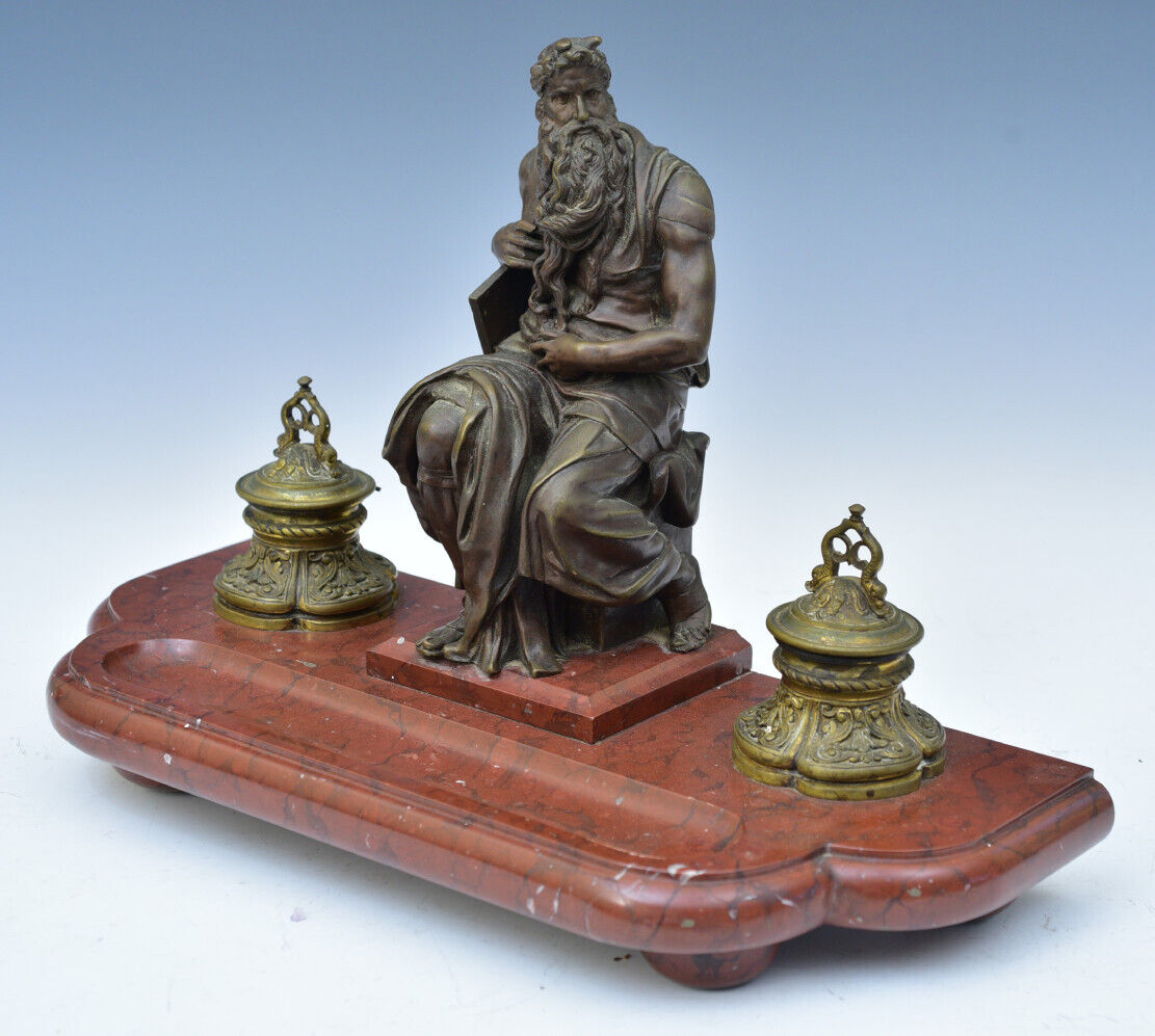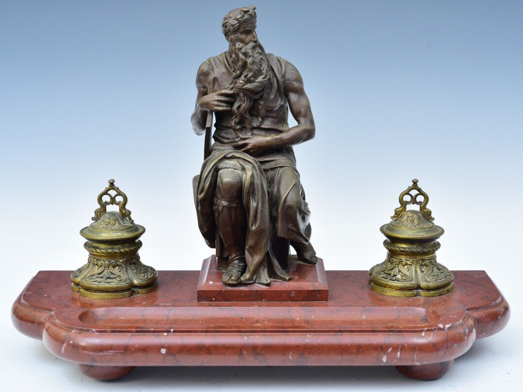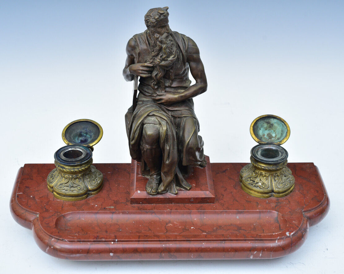 Bronze double inkstand – the base is heavy slate with holders for two paneled cobalt glass inkwells. In the center is a bronze casting of Michelangelo’s Moses statue.  Achille Collas, the inventor of a revolutionary process that reduced large statues to smaller sizes, created this bronze.  With Ferdinand Barbedienne, Collas established the Barbedienne Foundry in Paris in 1838.  Collas died in 1859, leaving his share of the foundry to Barbedienne, who continued the work of the foundry until his death just before the turn of the century. This piece is an original 19th century Barbedienne Foundry casting using the invention of Achille Collas to create the sculpture. The mark on the sculpture reads “A. Collas, Brevete Reduction Mechanique”.