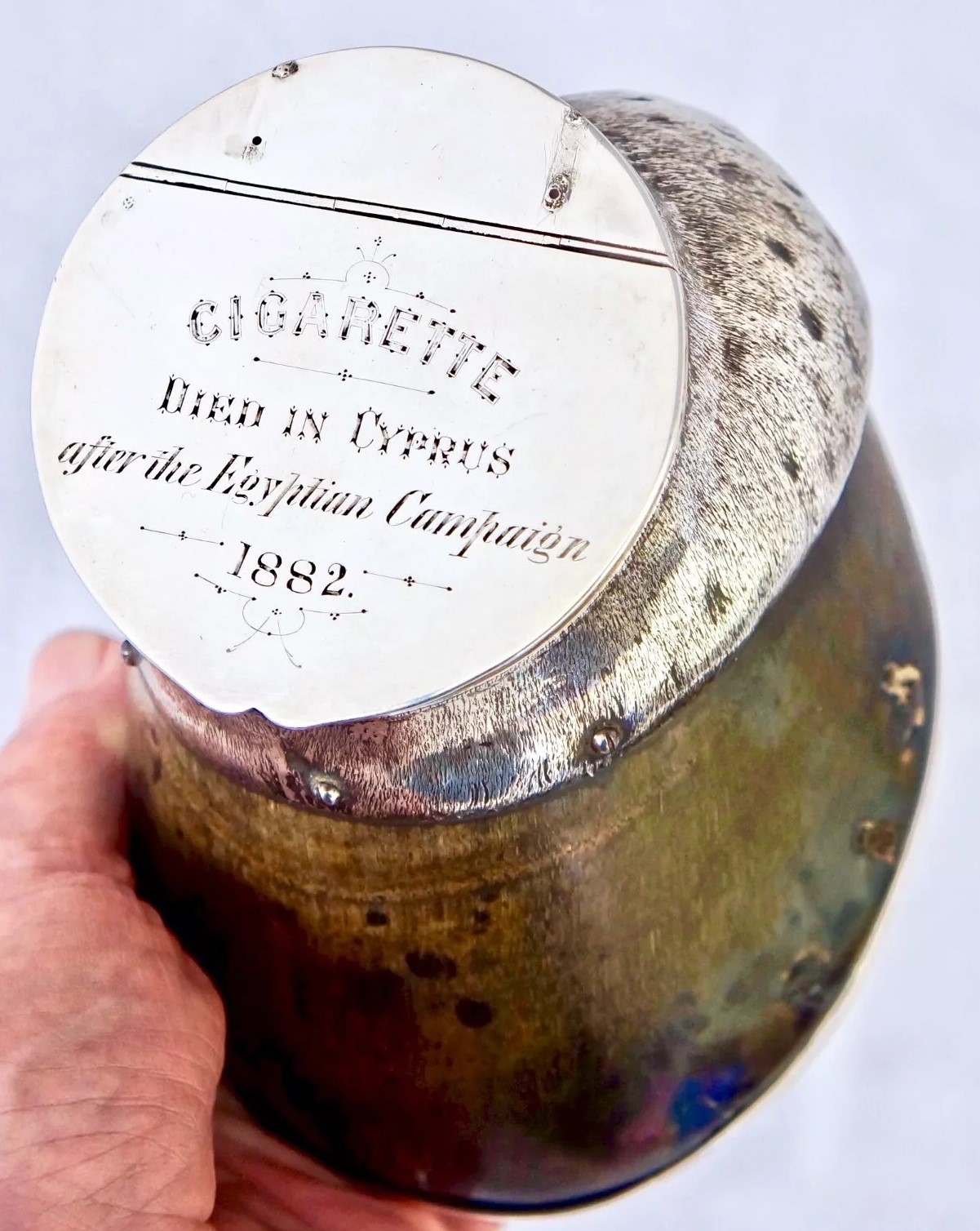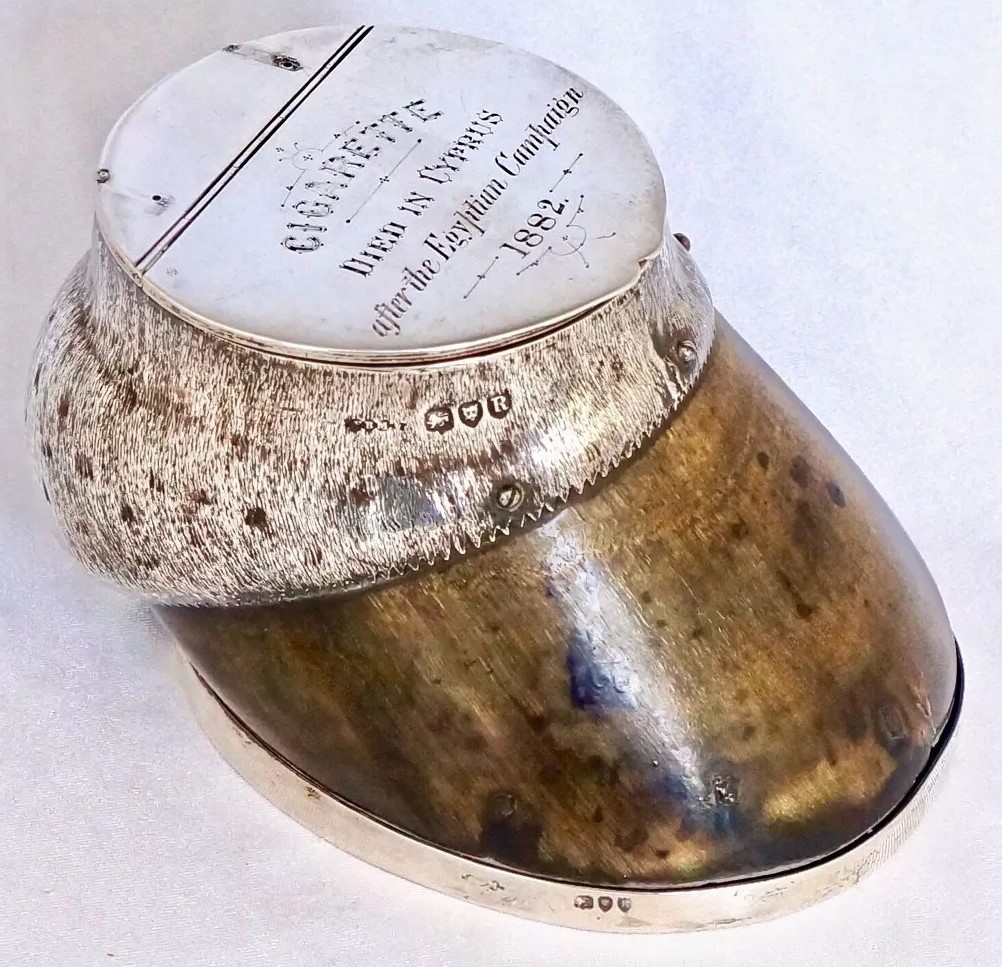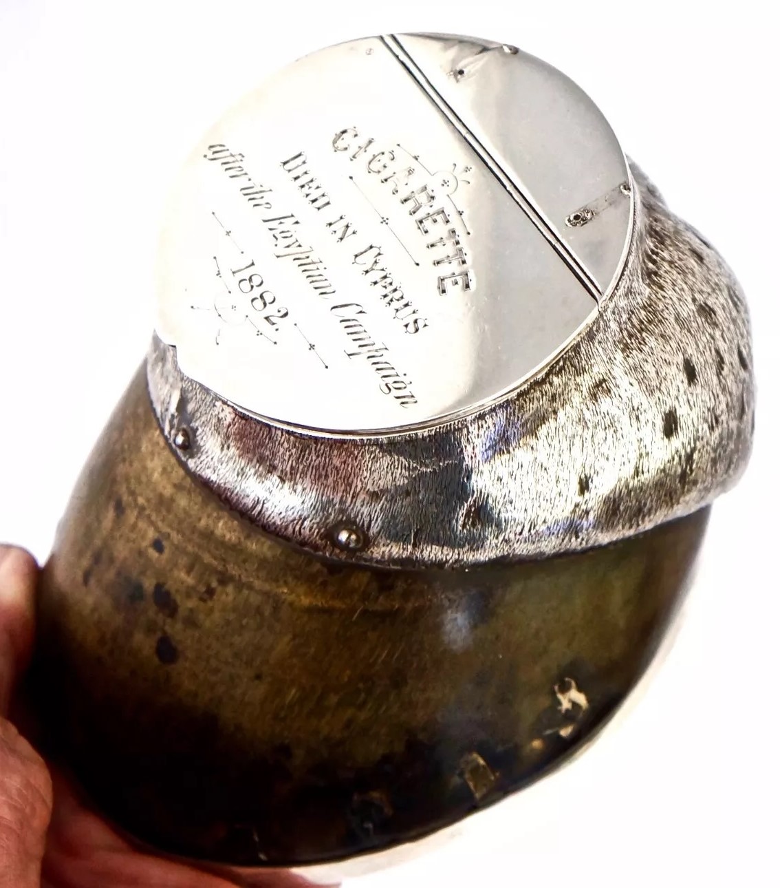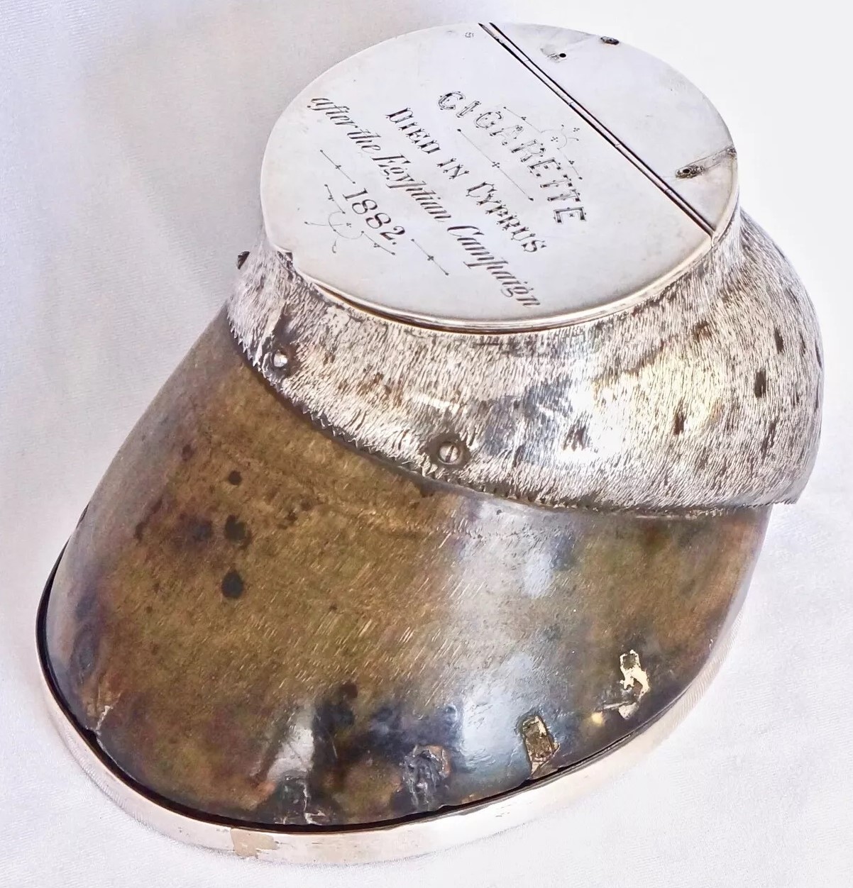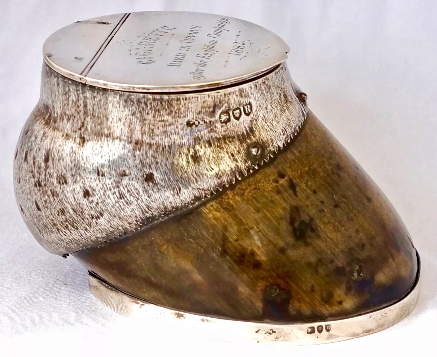 A sterling silver mounted taxidermy hoof of a war horse involved in the Anglo-Egyptian War of 1882. The hoof has been converted to an inkwell with both the upper mounting and horseshoe in hallmarked (Army & Navy Cooperative Society Ltd., London, 1892). The horse survived the war and retired to Cyprus where he died ten years later in 1892.