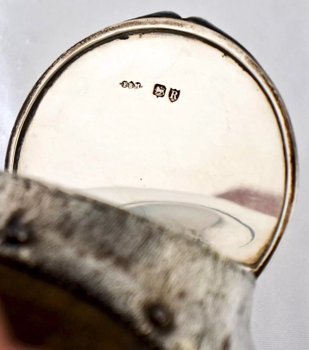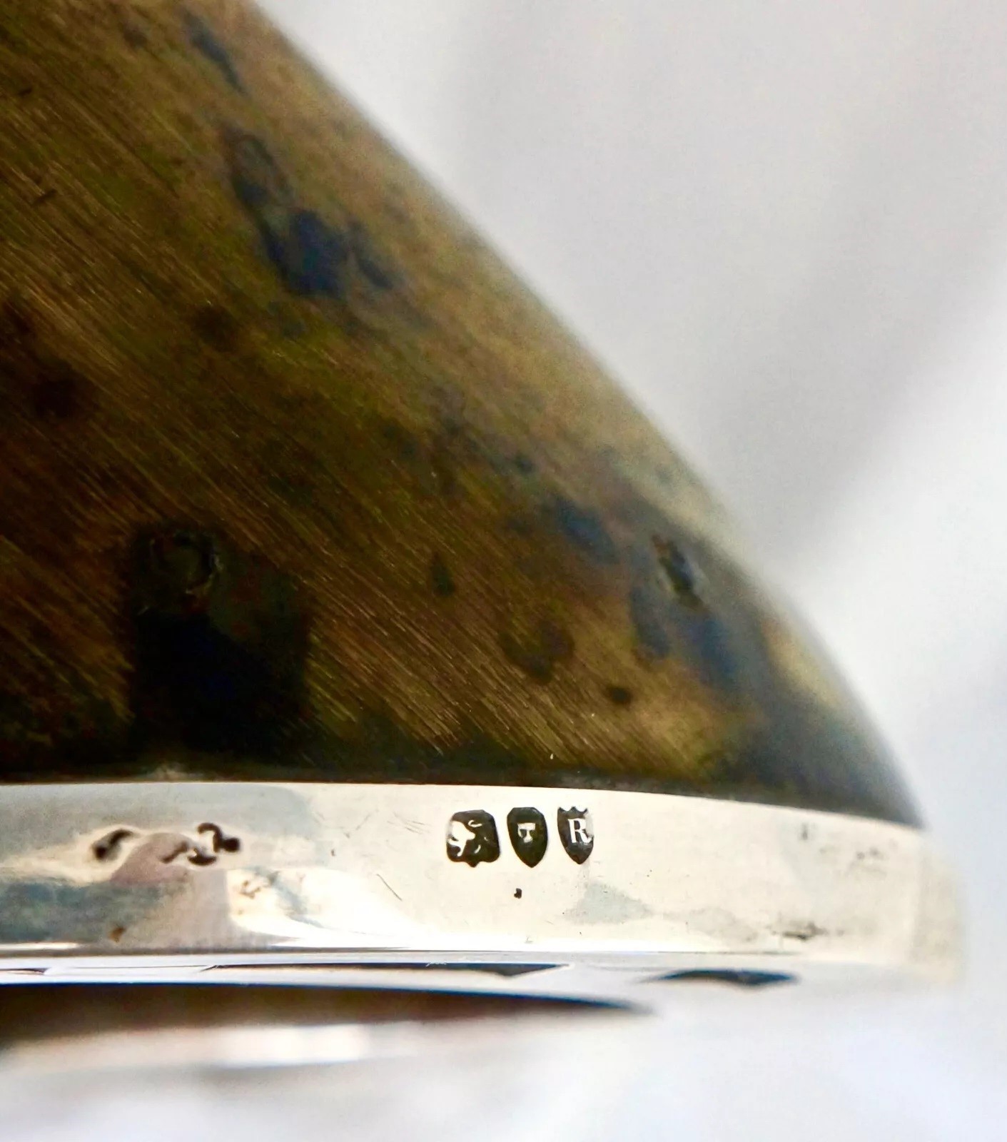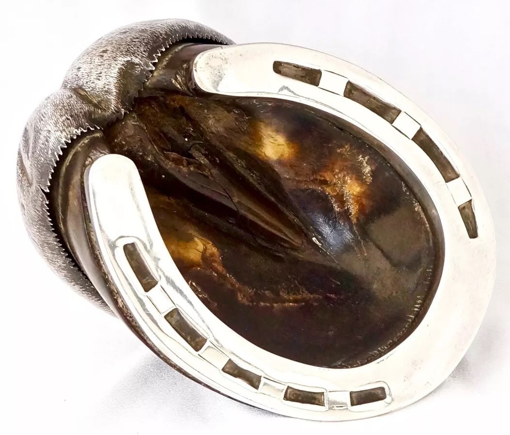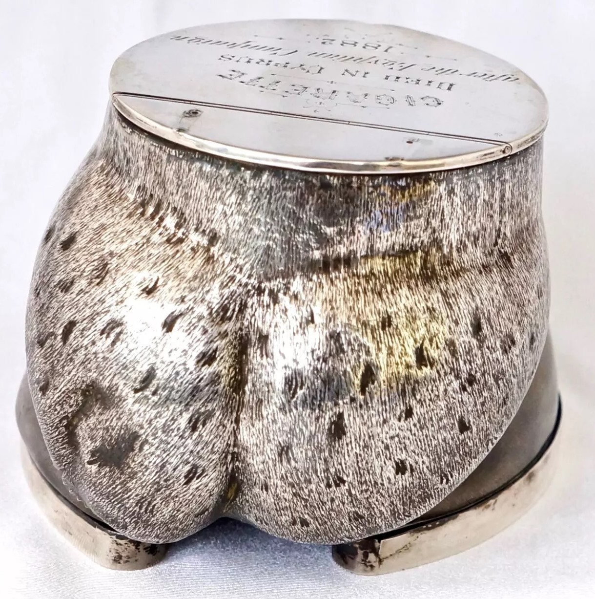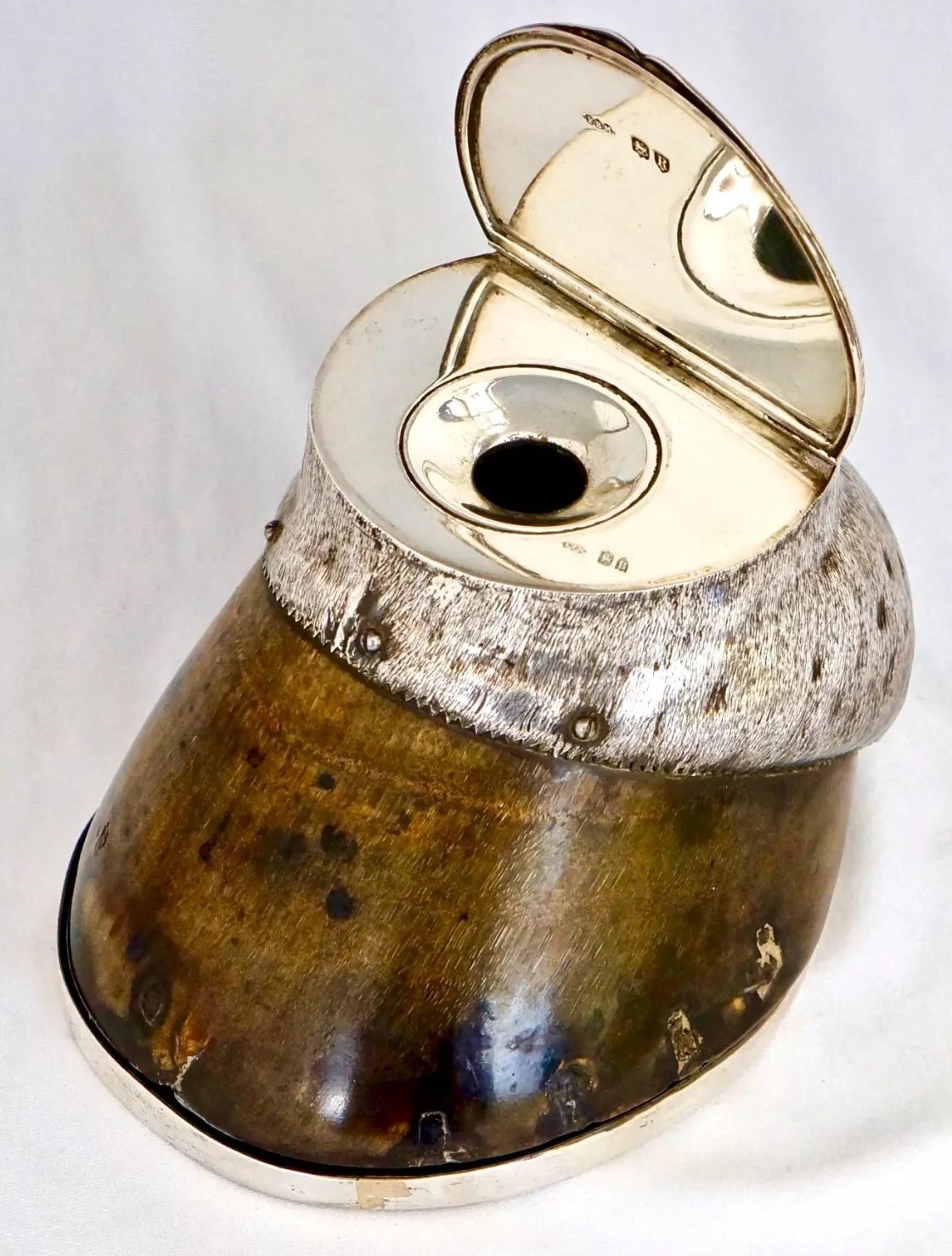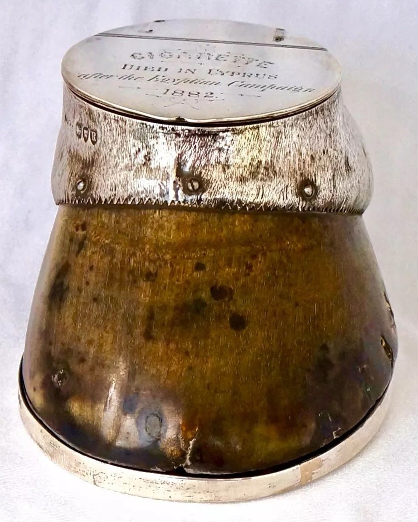 A sterling silver mounted taxidermy hoof of a war horse involved in the Anglo-Egyptian War of 1882. The hoof has been converted to an inkwell with both the upper mounting and horseshoe in hallmarked (Army & Navy Cooperative Society Ltd., London, 1892). The horse survived the war and retired to Cyprus where he died ten years later in 1892.