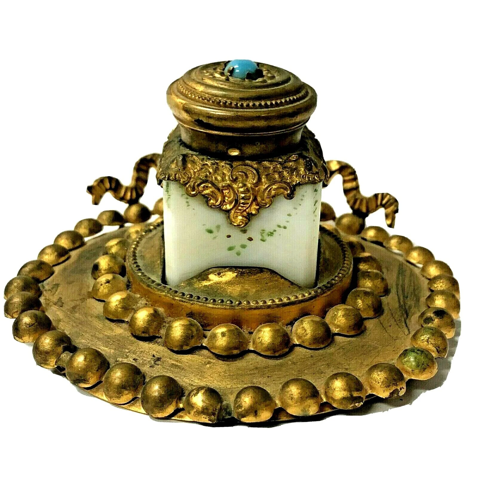 This is a patented inkstand. The inkwell is made of white opaque glass, a material often called milk glass and features a hinged brass lid with an ornate lambrequin collar. The lid is decorated with a turquoise-colored stone at its center.