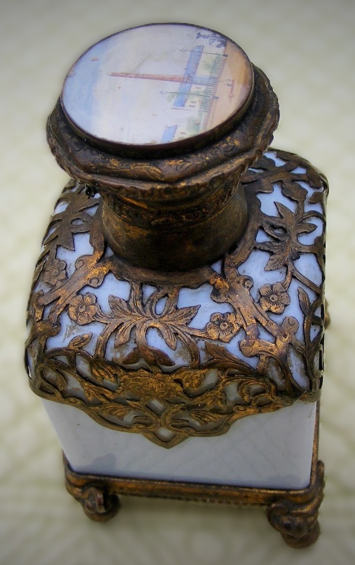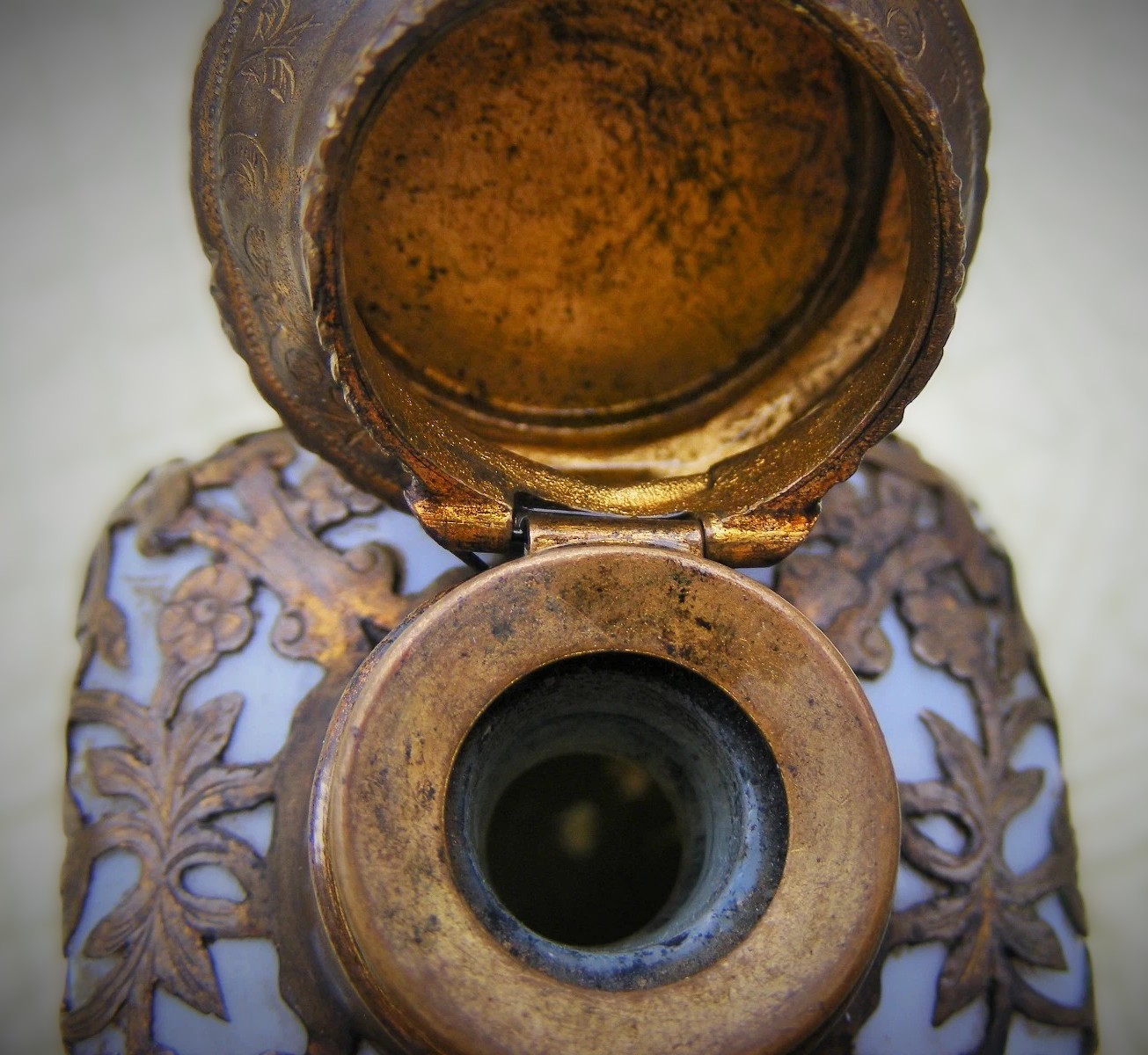 • Age: Late 19th Century (c. 1880–1900). This period favored the combination of milk glass, high-quality gilt-metal monture, and small, detailed decorative scenes.
