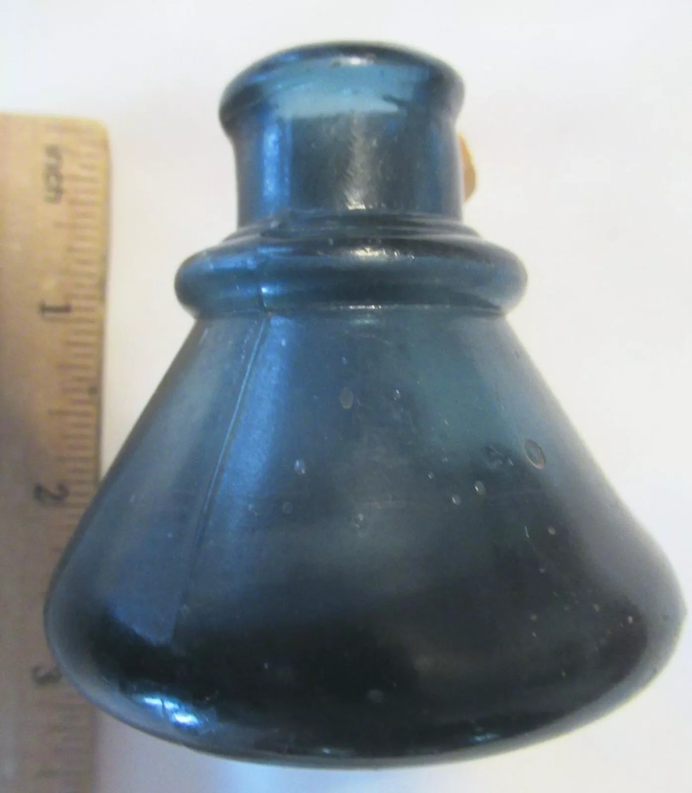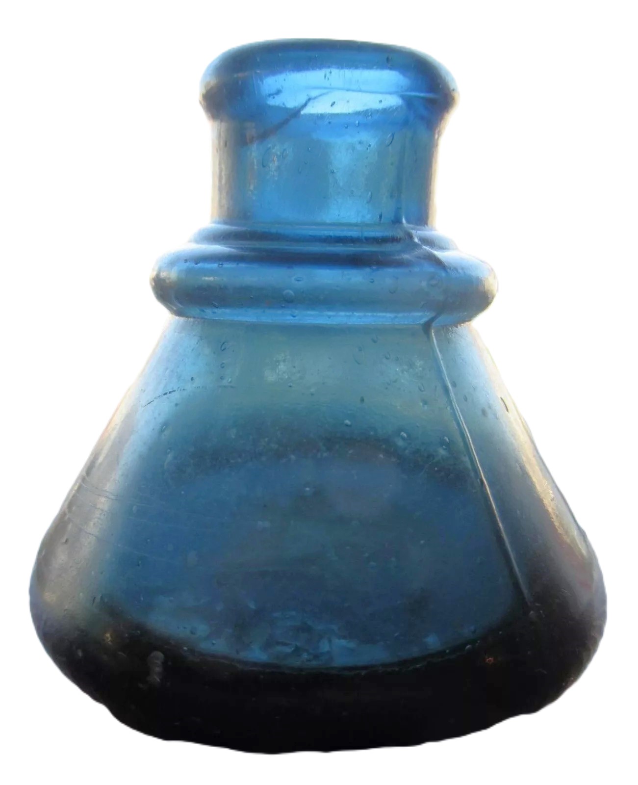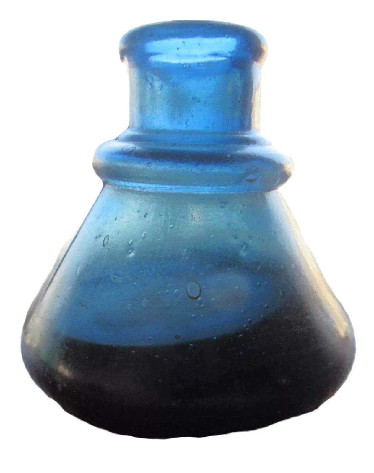 A gun-metal blue, mold blown, cone shaped ink bottle with a tooled lip. The bottle has a thick glass bottom.