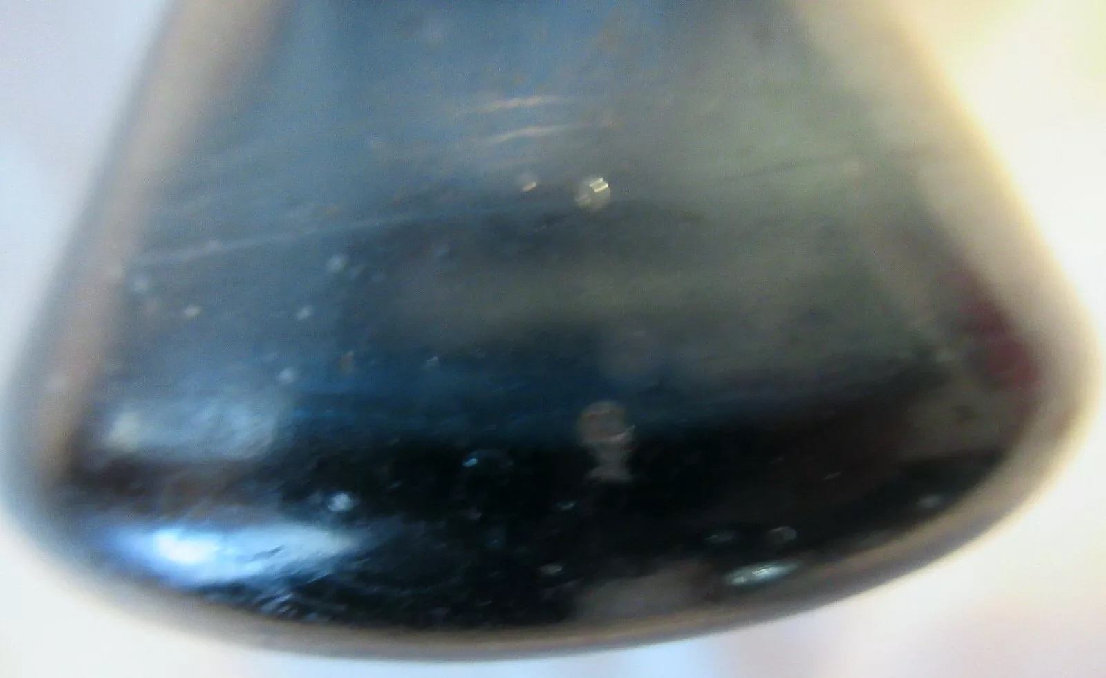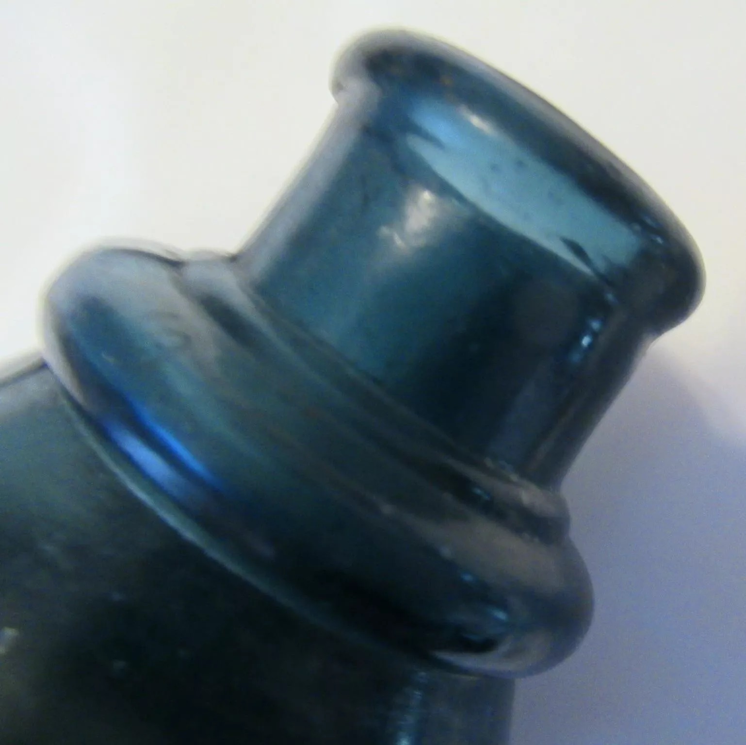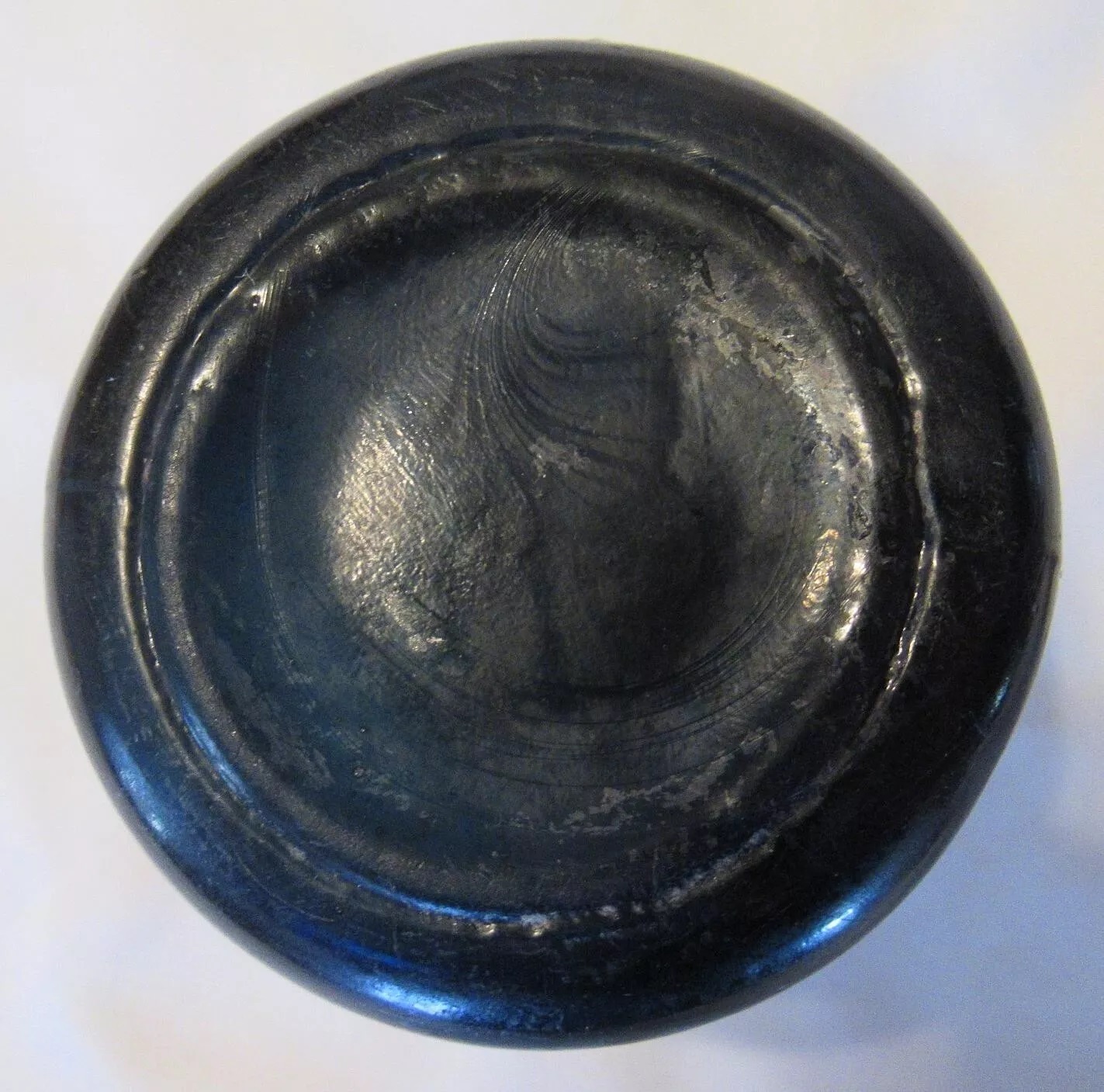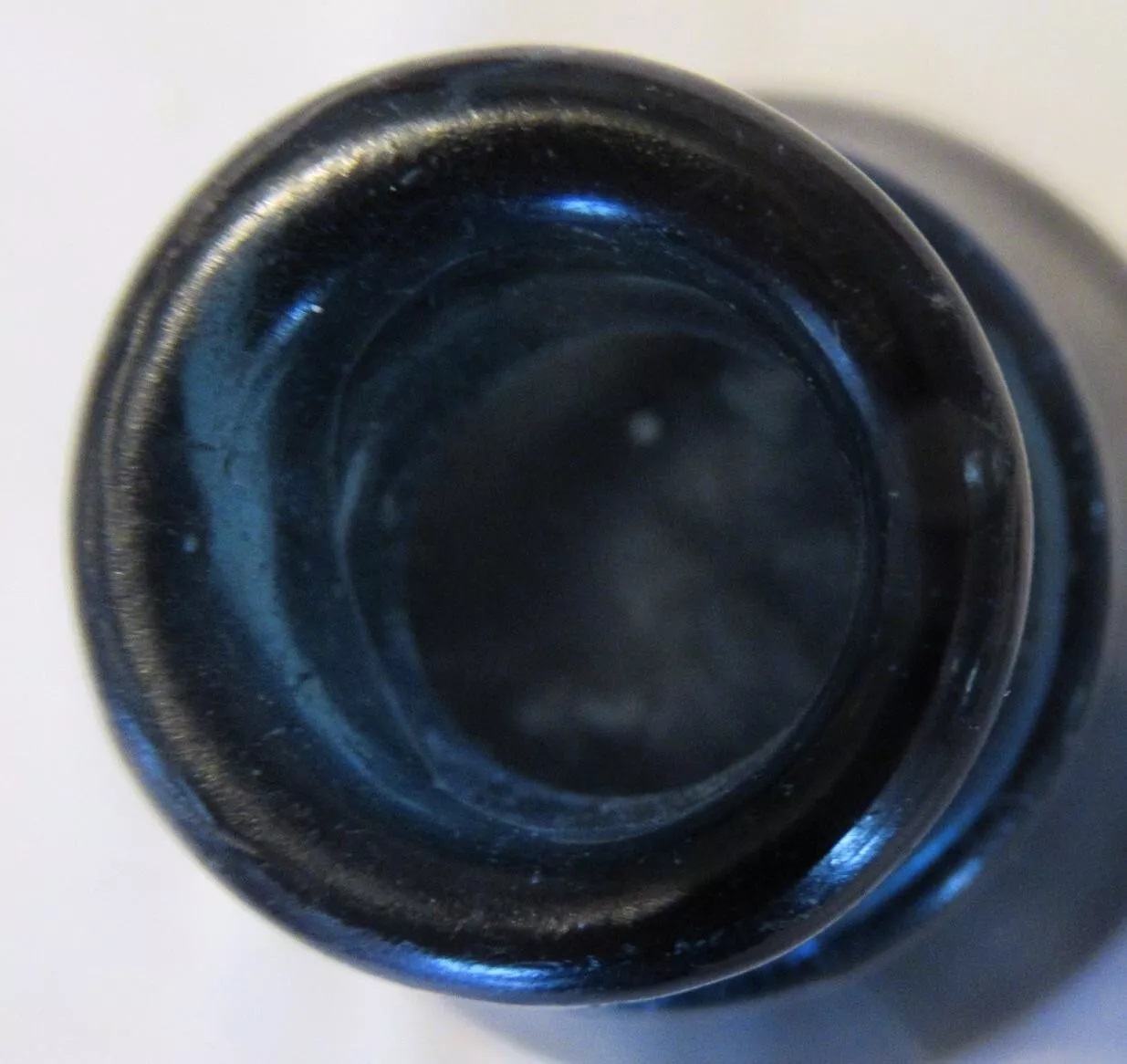 A gun-metal blue, mold blown, cone shaped ink bottle with a tooled lip. The bottle has a thick glass bottom.