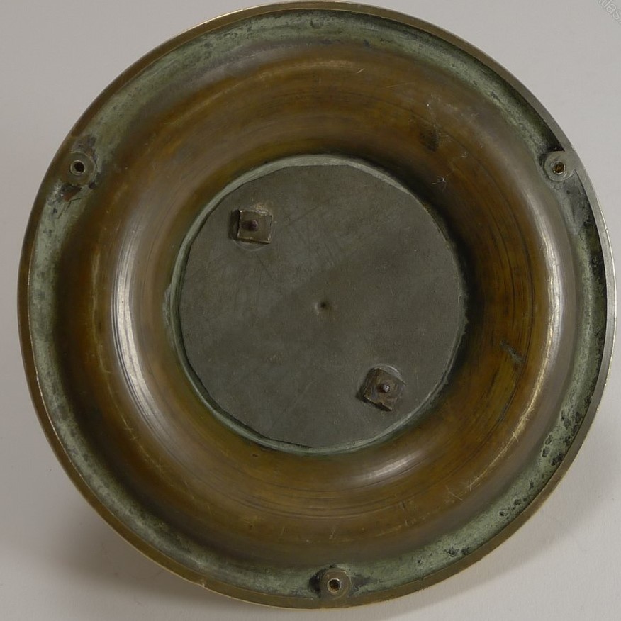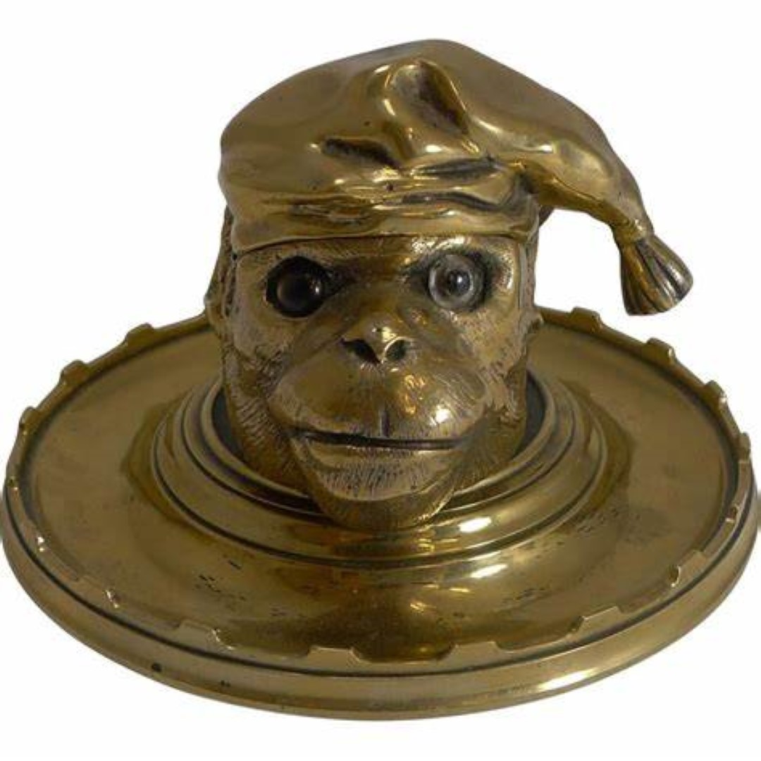 Solid cast brass inkwell on a circular base in the form of a monkey, with glass eyes, wearing a stocking cap. The cap is hinged and opens to access the inkwell.
