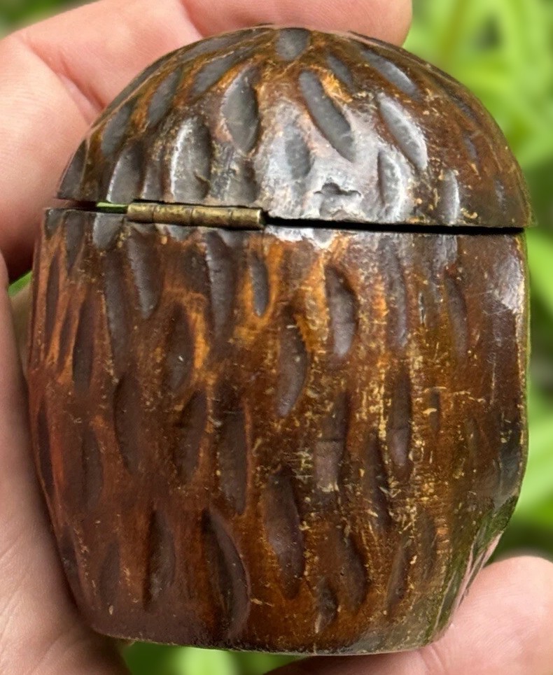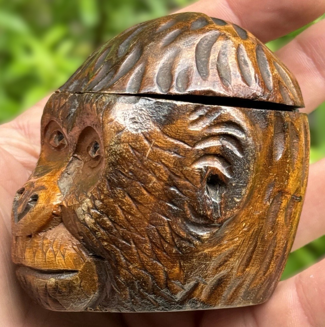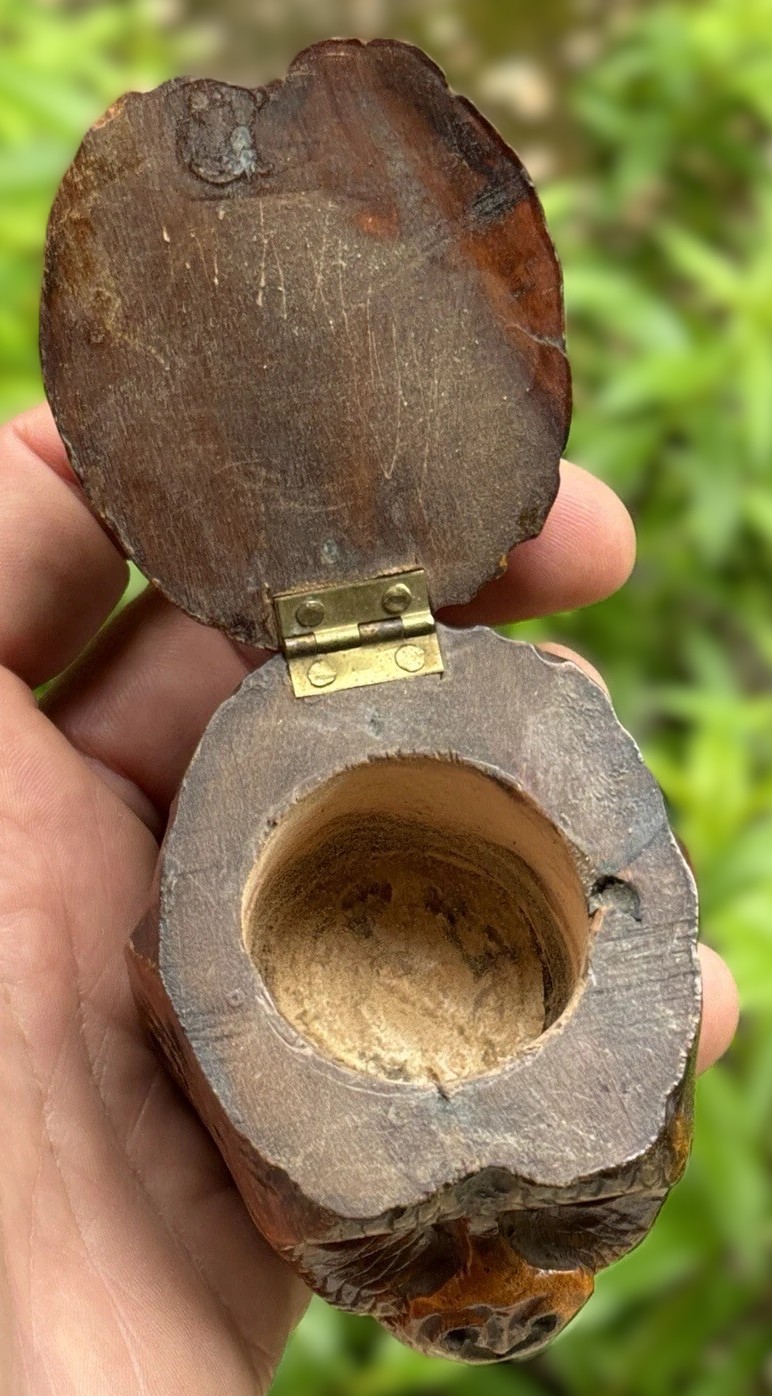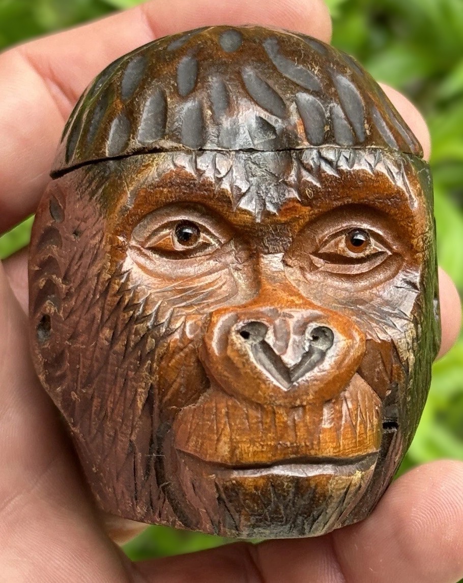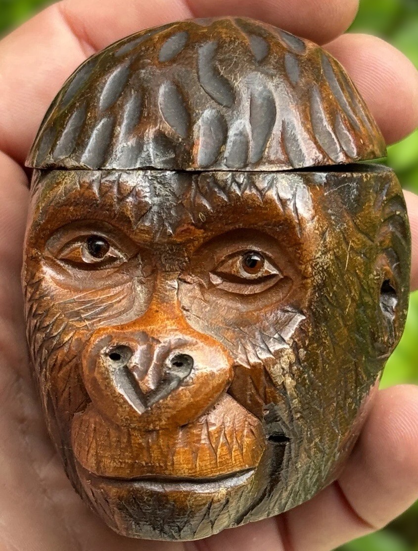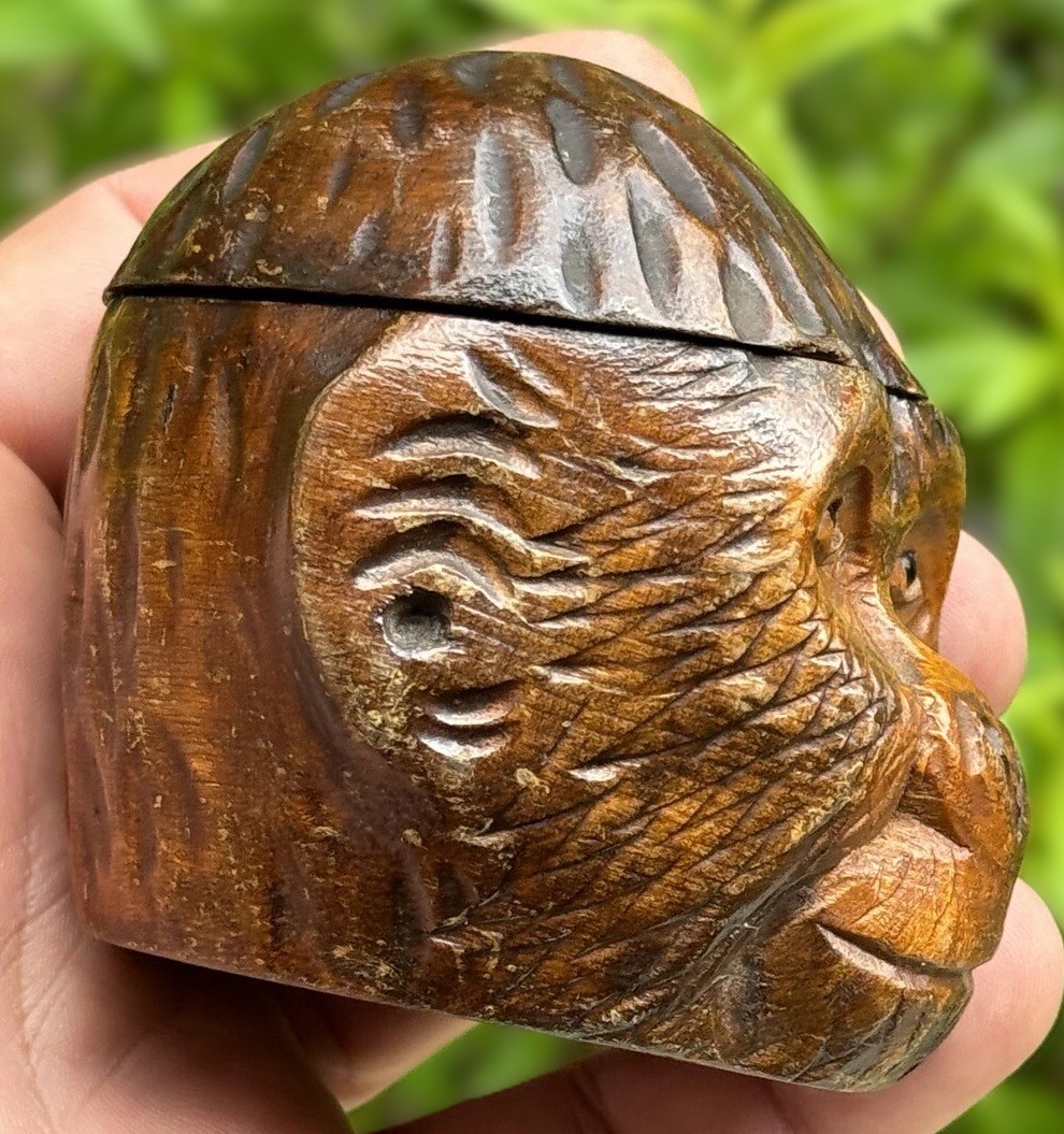 This inkwell is a hand-carved Black Forest creation, designed to resemble a monkey’s head. The craftsmanship is quite detailed, capturing the lifelike features of the monkey, especially with the addition of glass eyes. The top of the monkey’s head is hinged, allowing it to open and reveal a ceramic insert inside.