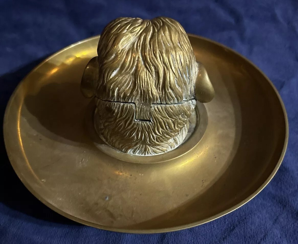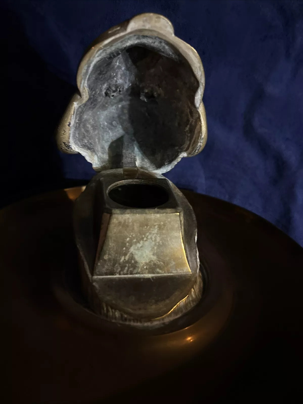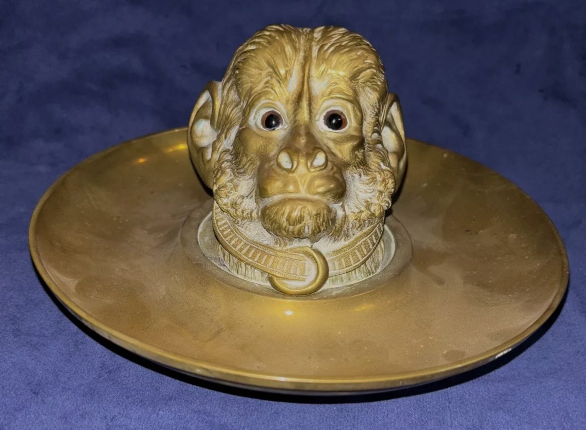 This is a novelty brass inkwell in the form of a monkey’s head, designed with a hinged top for accessing the ink reservoir.