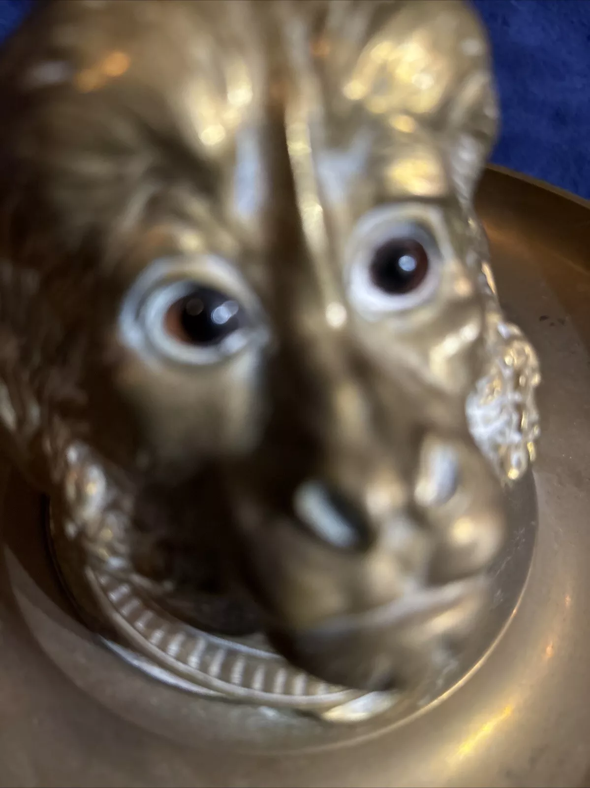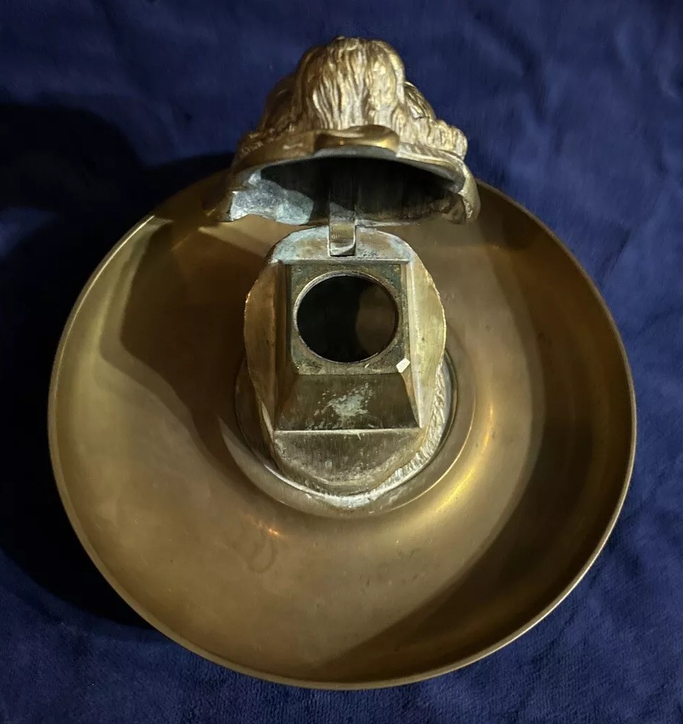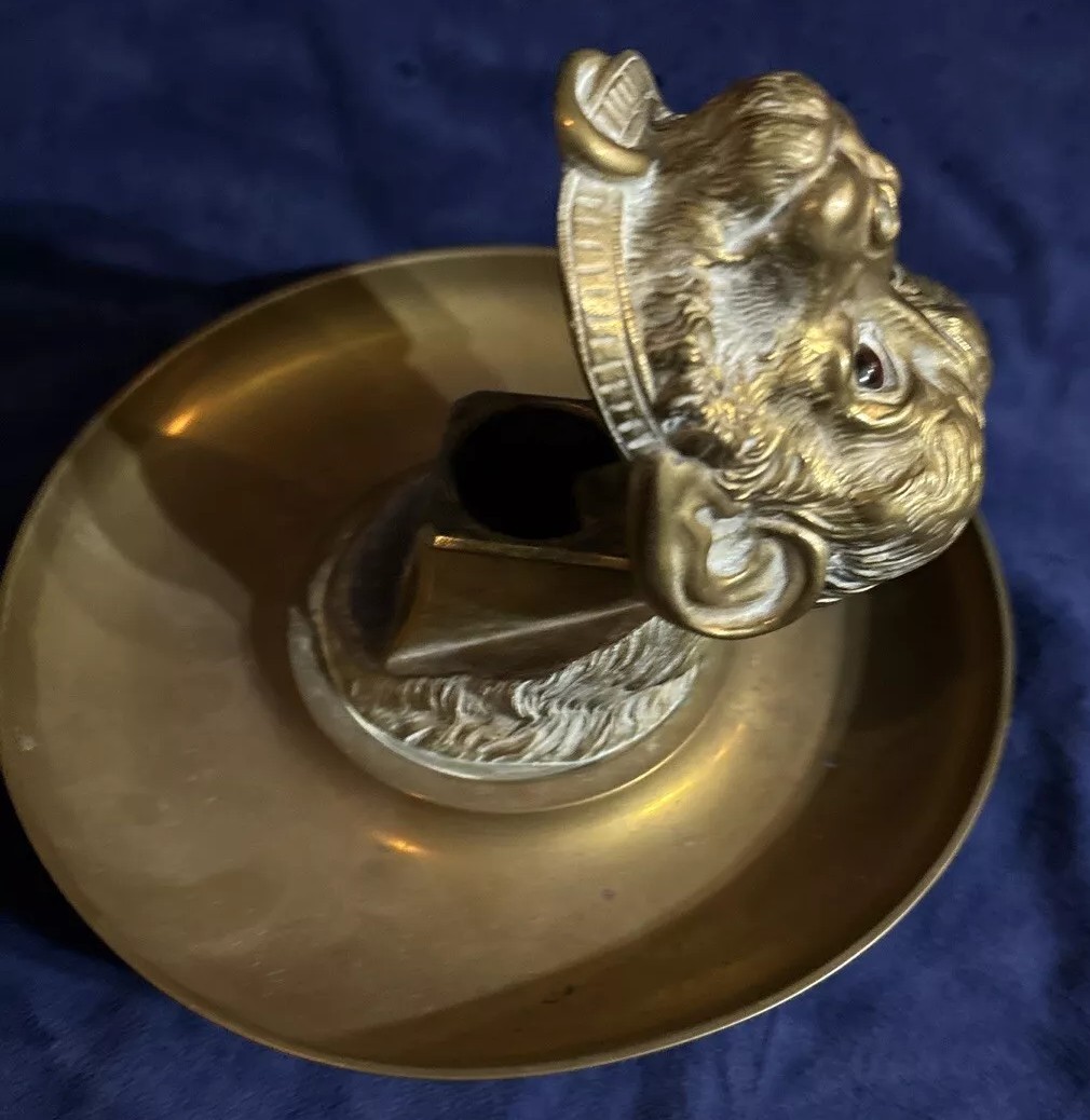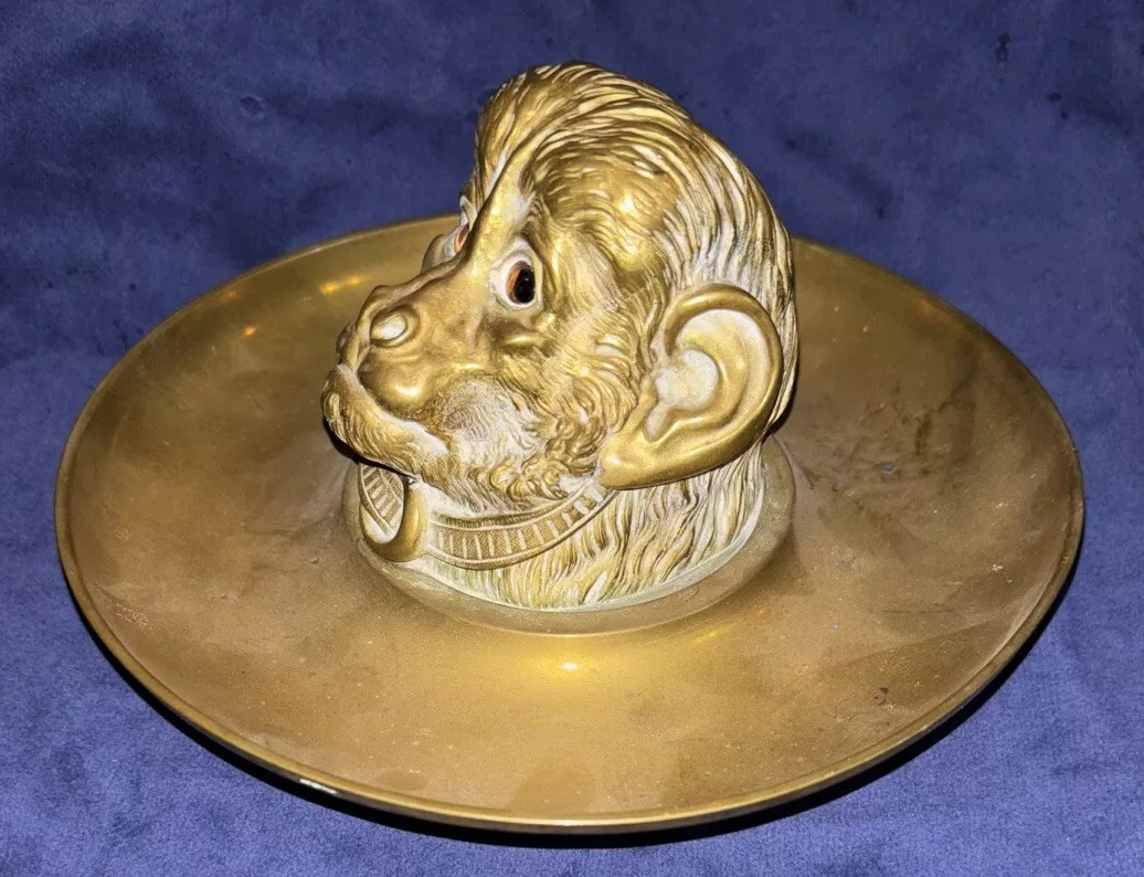 This is a novelty brass inkwell in the form of a monkey’s head, designed with a hinged top for accessing the ink reservoir.