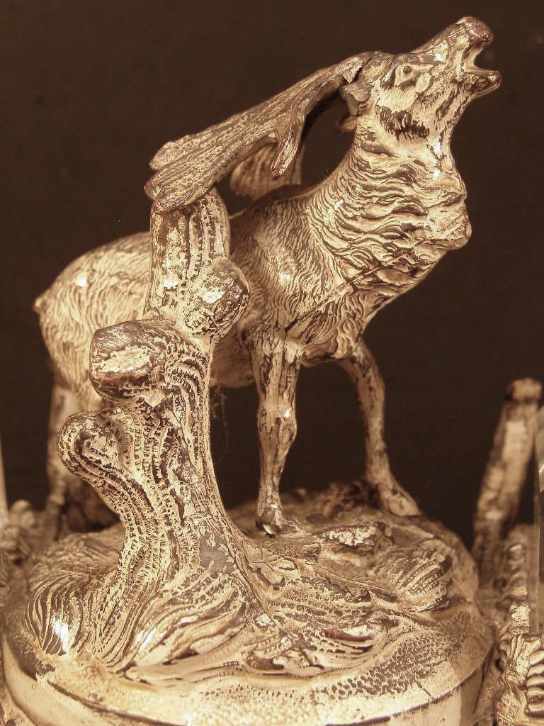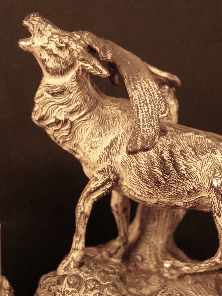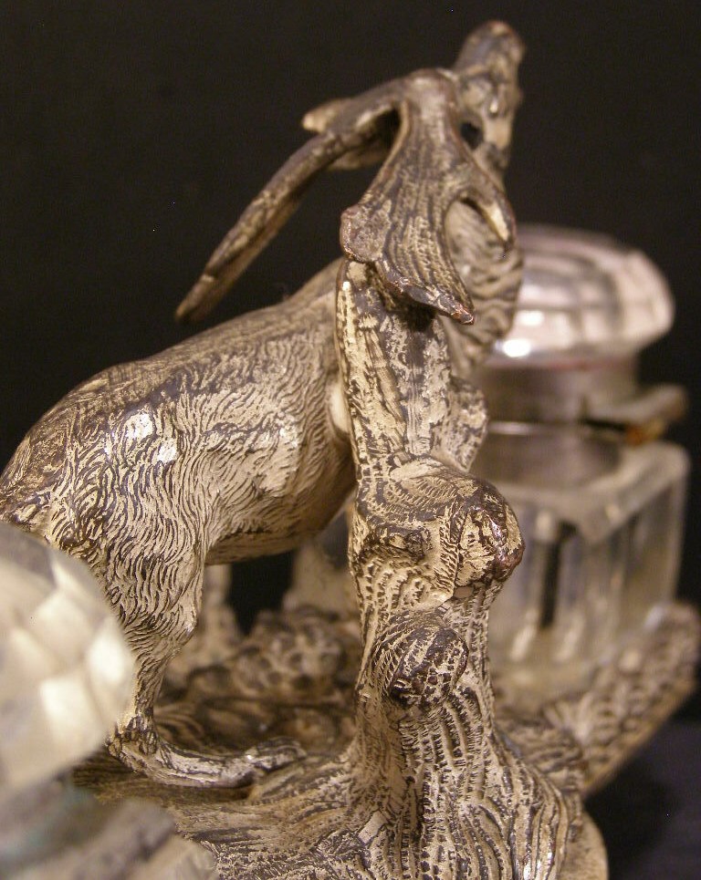 Early 20th century inkstand featuring a moose (or elk) standing between two glass inkwells, with a pen holder in the front.