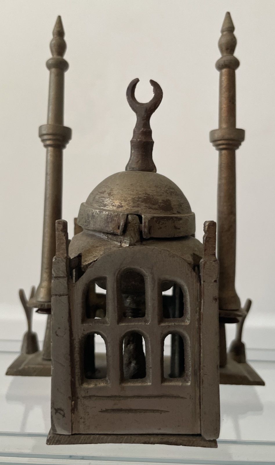 - Subject: This inkstand is modeled in the shape of a miniature mosque complex, complete with a central dome, a series of smaller domes or cupolas, and prominent minarets (slender towers) flanking the structure. The architectural details are simplified but recognizable, intended to evoke the grandeur of Ottoman or Middle Eastern religious architecture.
