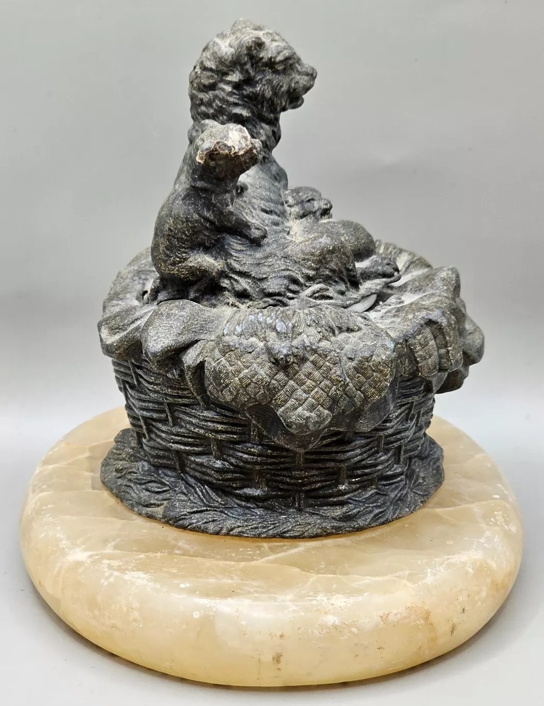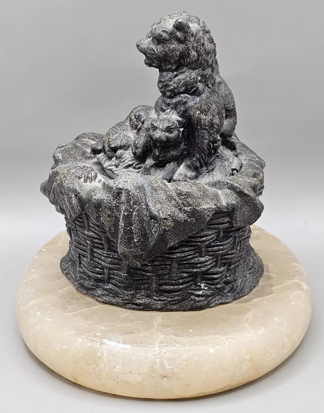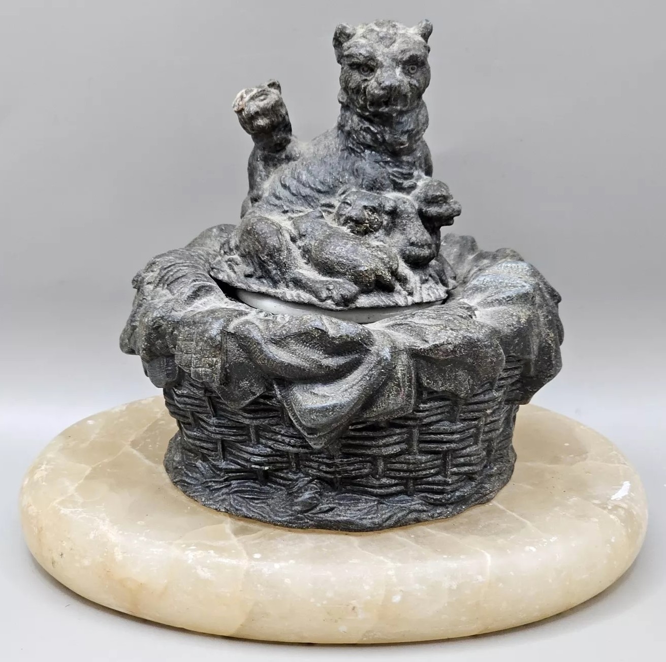 This inkwell features a mother cat with her kittens nestled in a basket. The inkwell is set on an oval base made of marble.