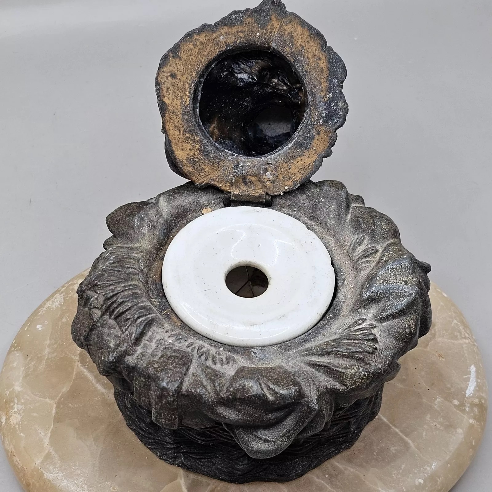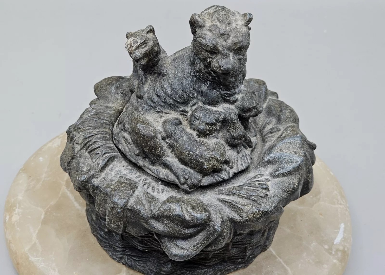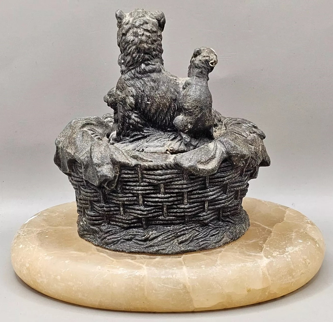 This inkwell features a mother cat with her kittens nestled in a basket. The inkwell is set on an oval base made of marble.