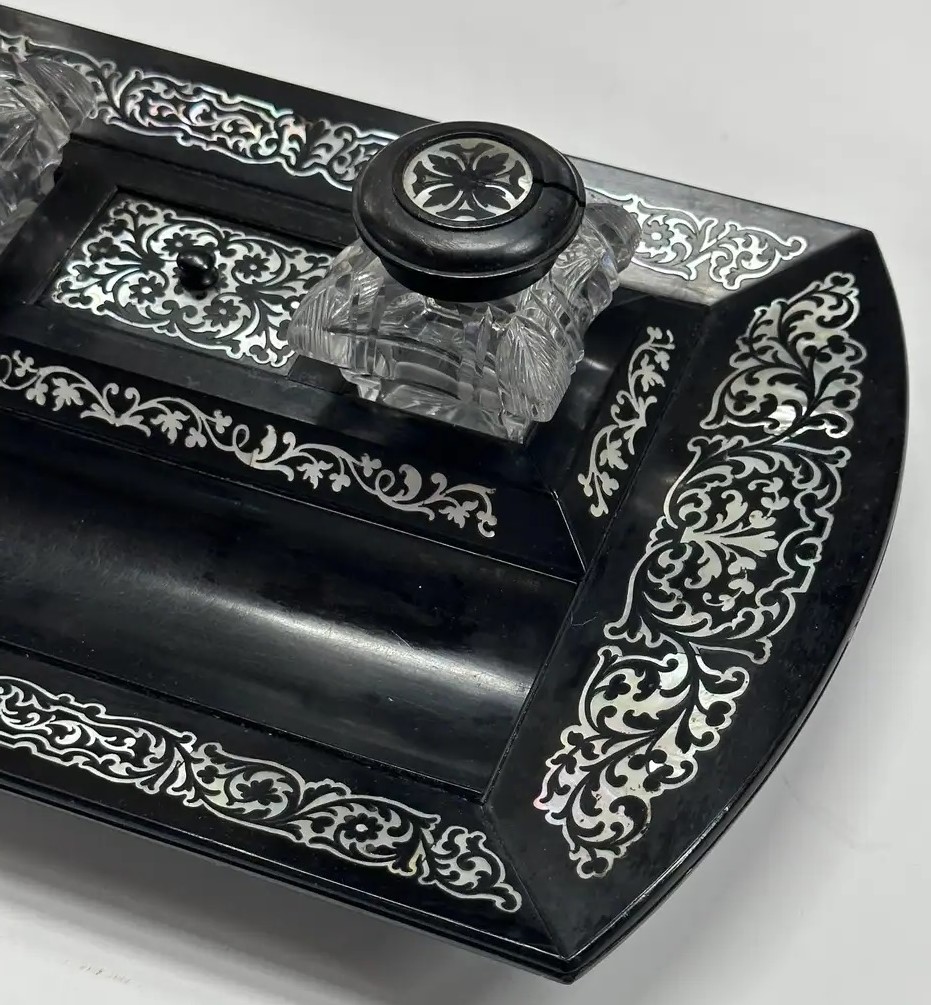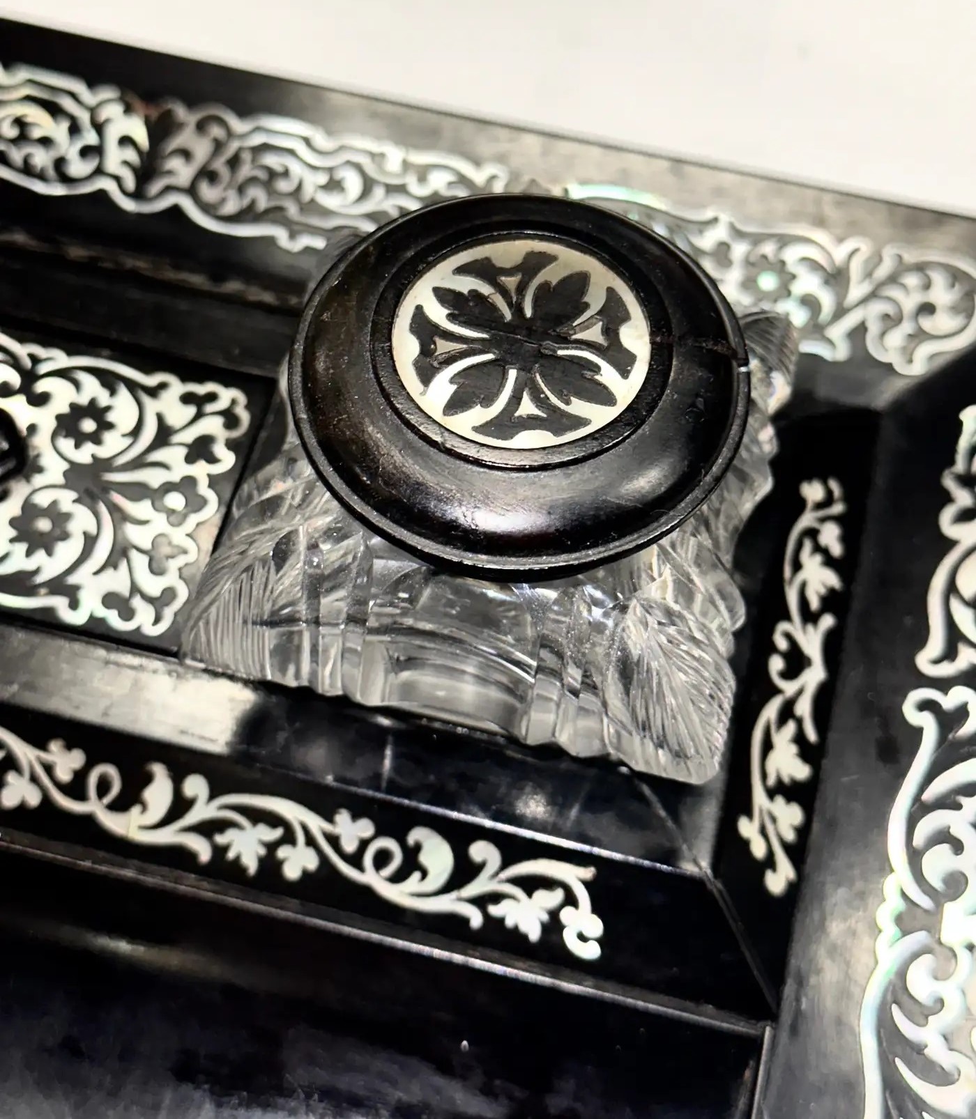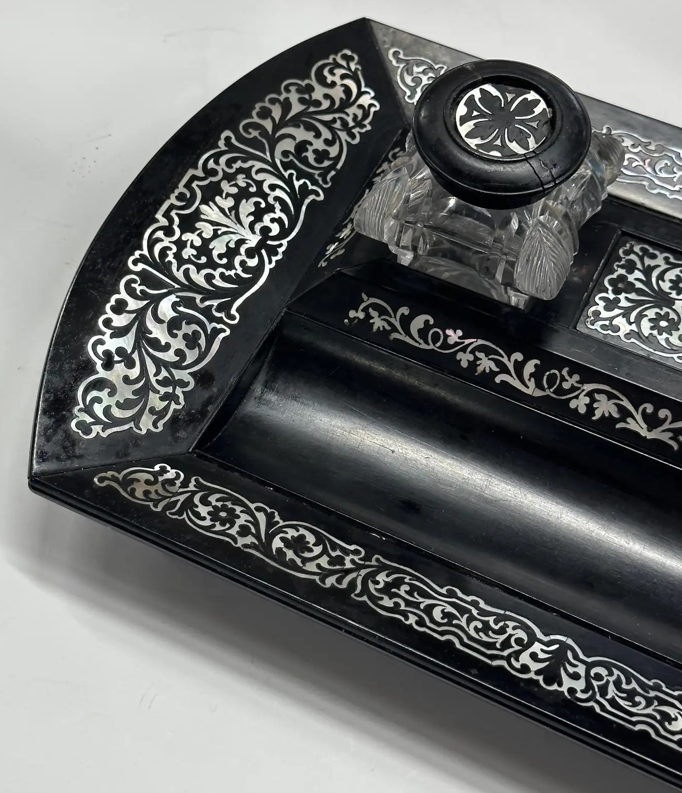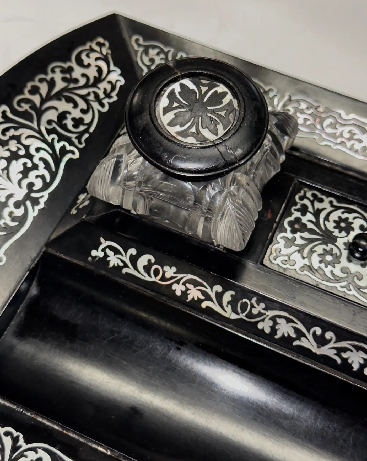 A hand-crafted mother of pearl inlaid inkstand with cut glass inkwells on a rosewood or ebony base with pen channel and central lidded storage compartment.