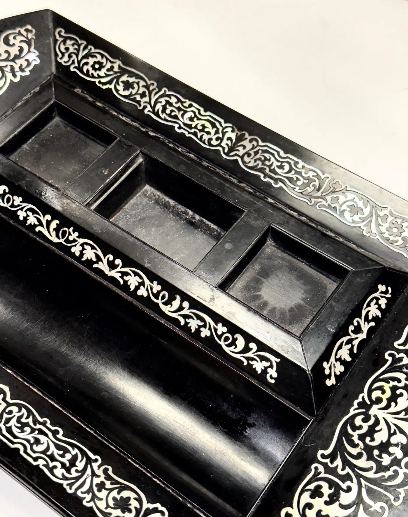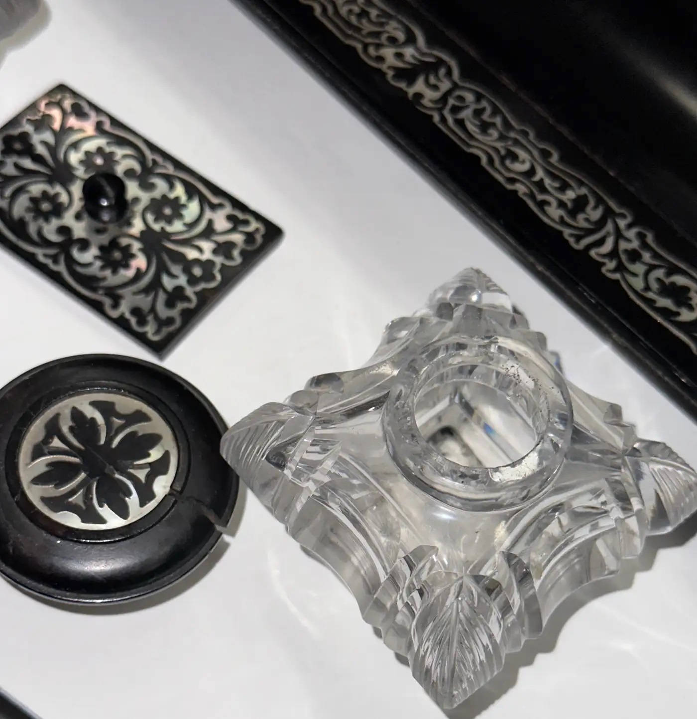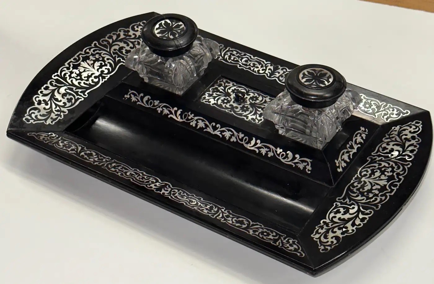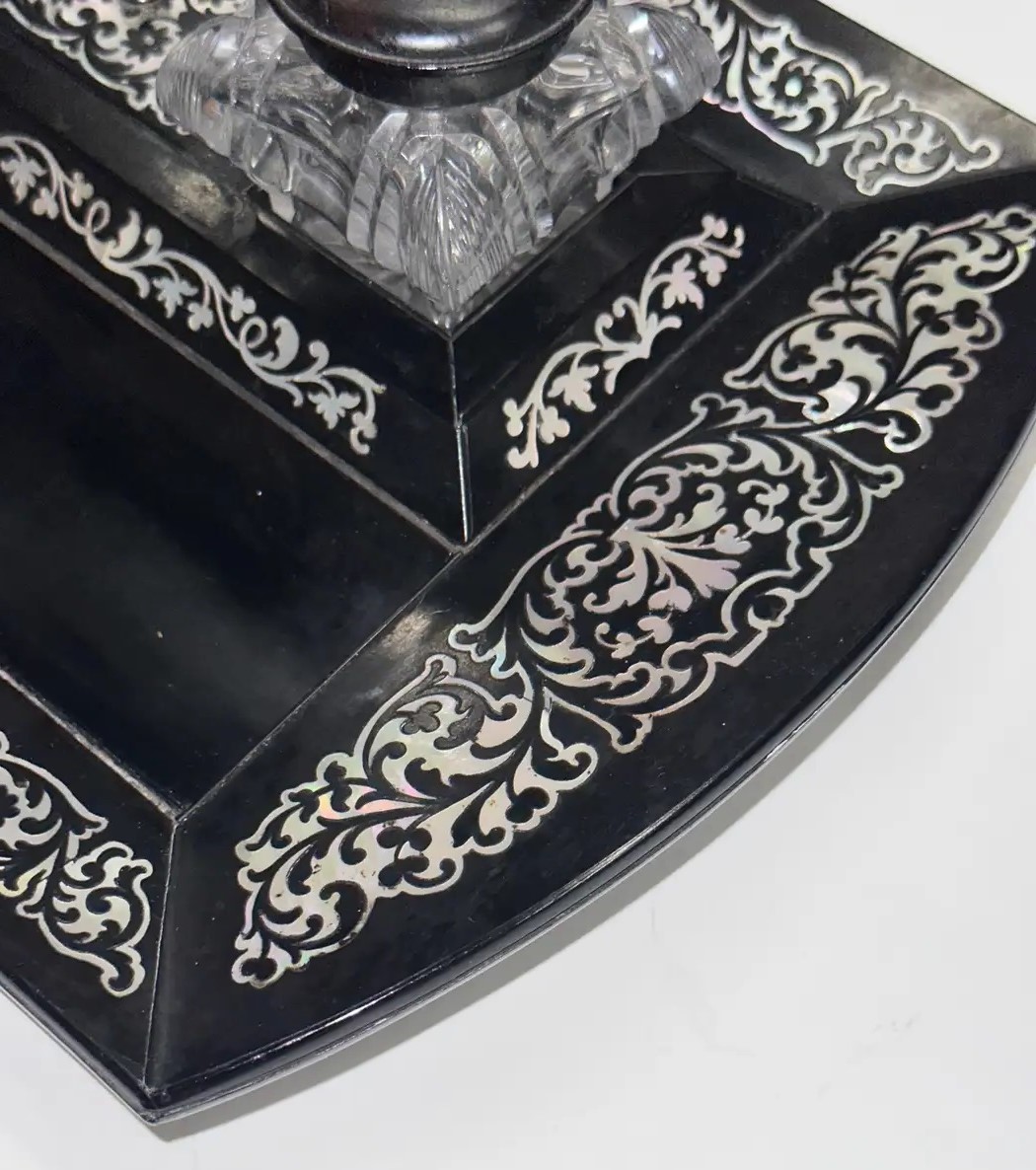 A hand-crafted mother of pearl inlaid inkstand with cut glass inkwells on a rosewood or ebony base with pen channel and central lidded storage compartment.