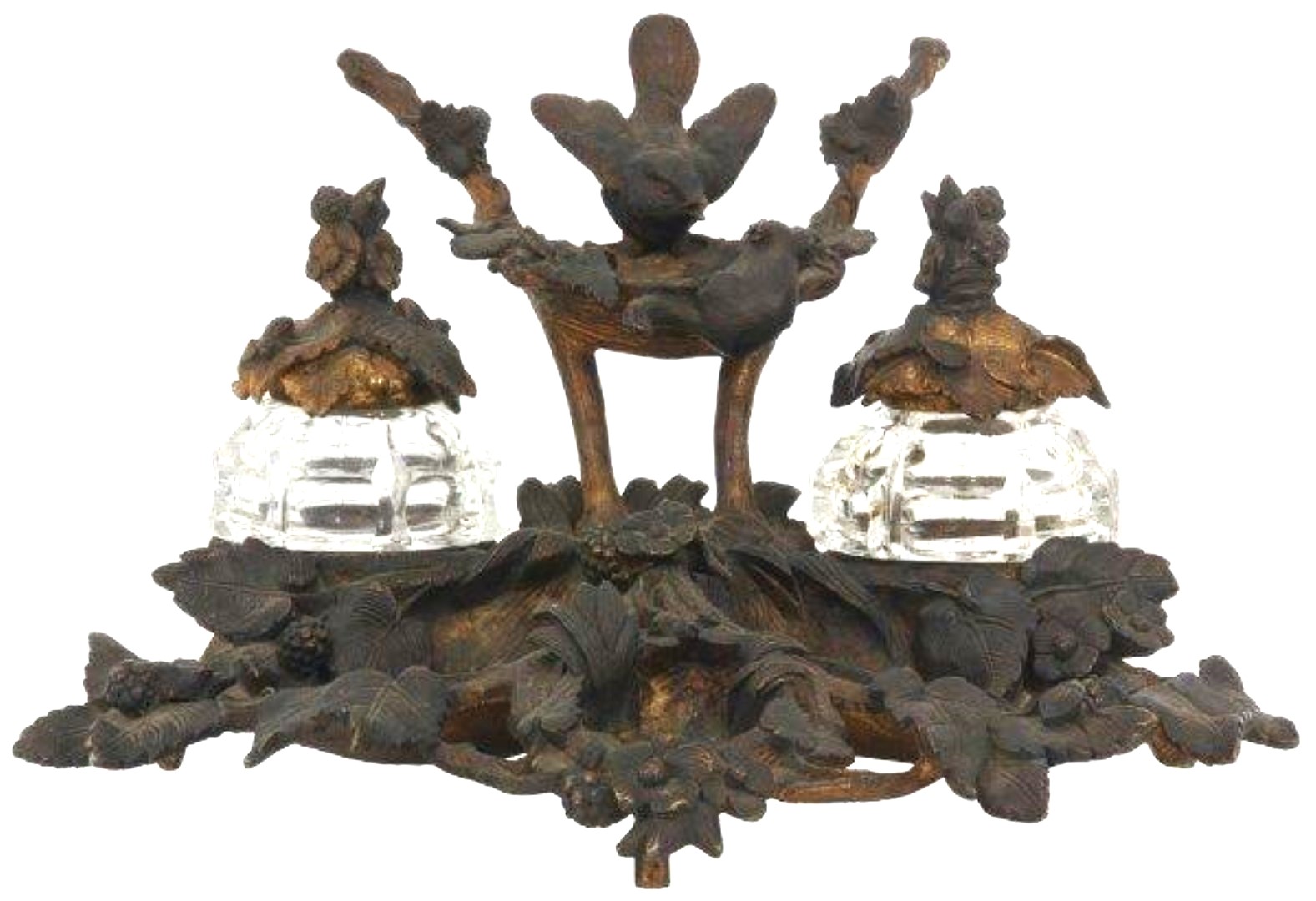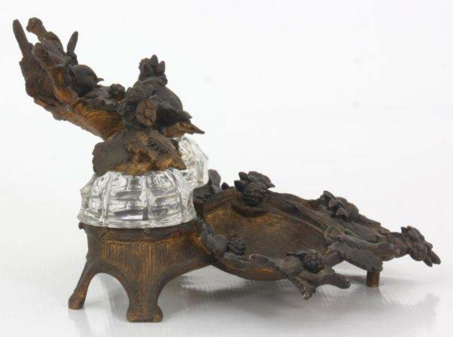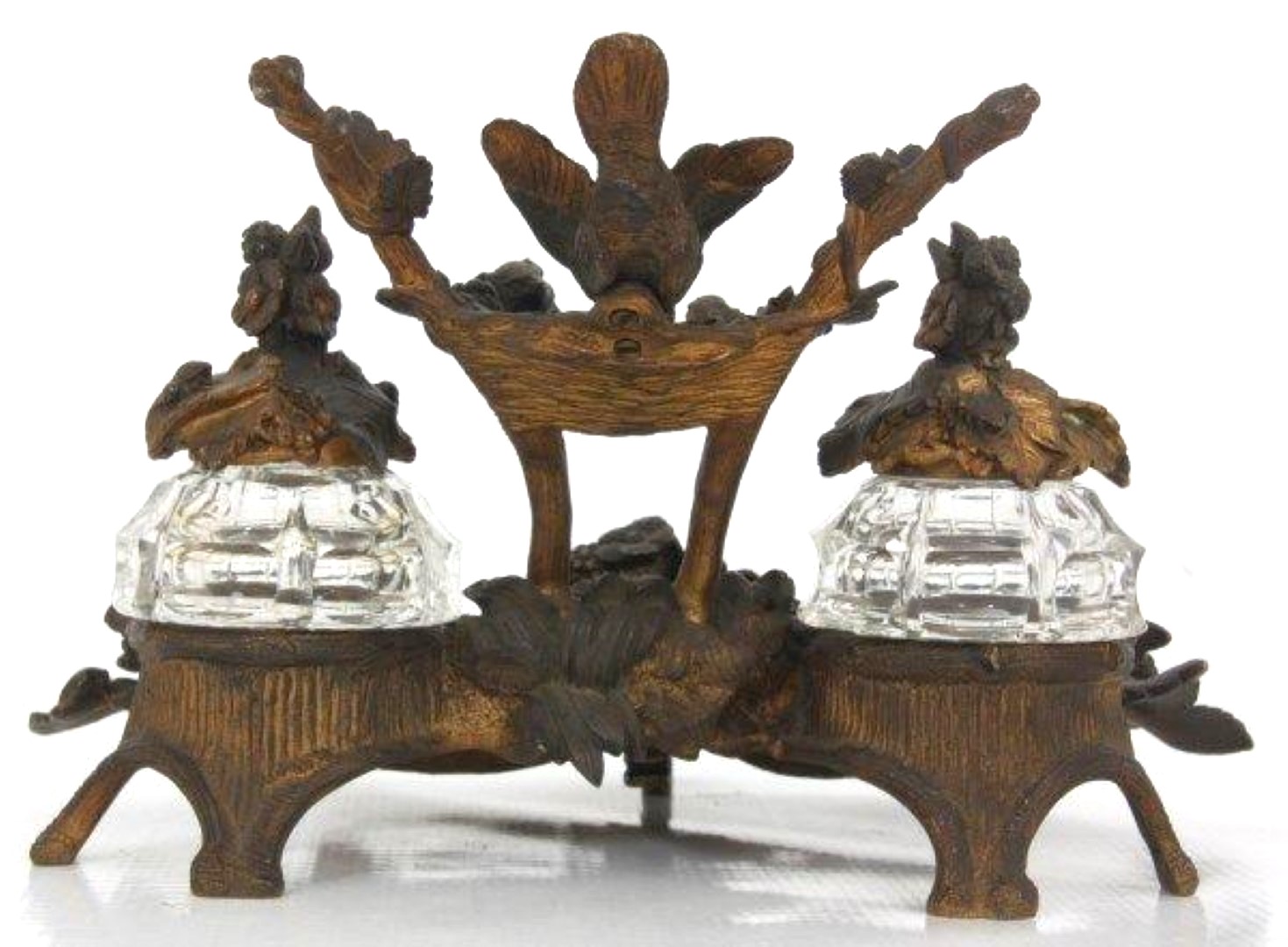 A bird and her nest rests at the top of this bronze inkstand. A mouse is crawling up the side of the nest. Below the nest are twining vines, leaves, berries, and florals. The center floret is removable and acts as a wax seal. The separate lids covering the two glass inkwells have finials of leaves and florals.