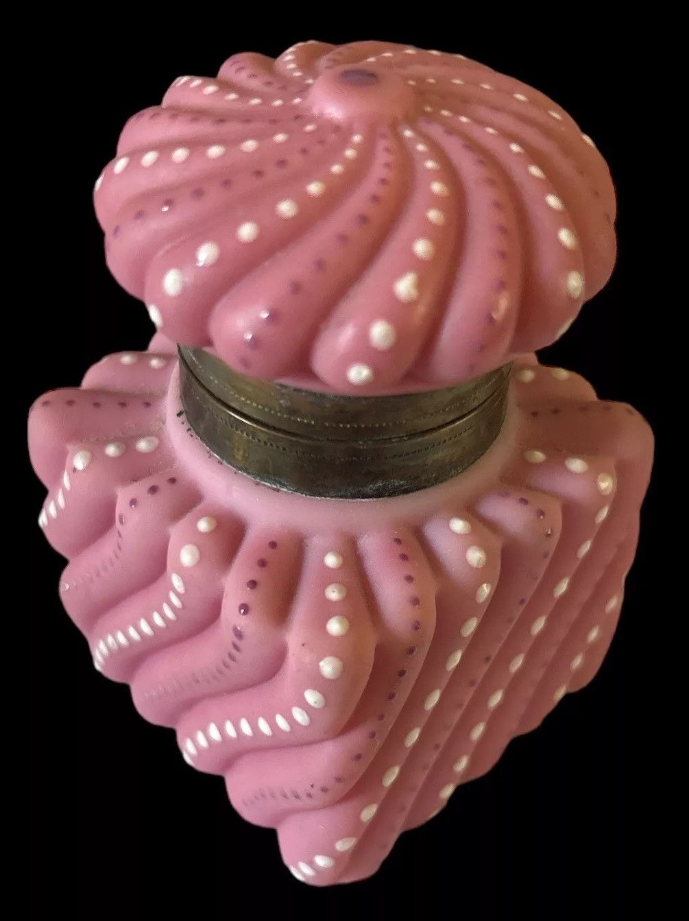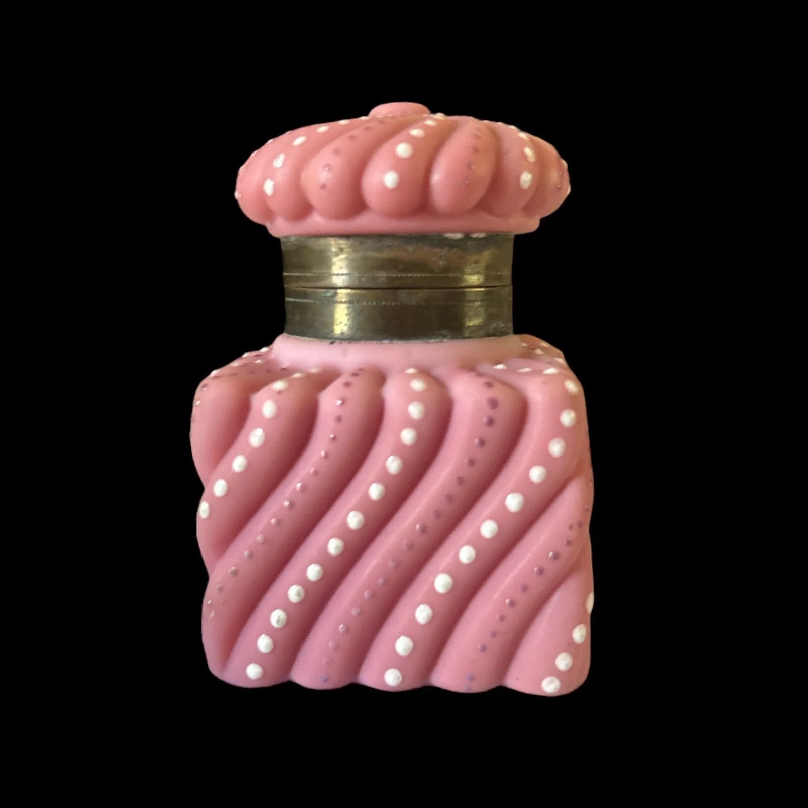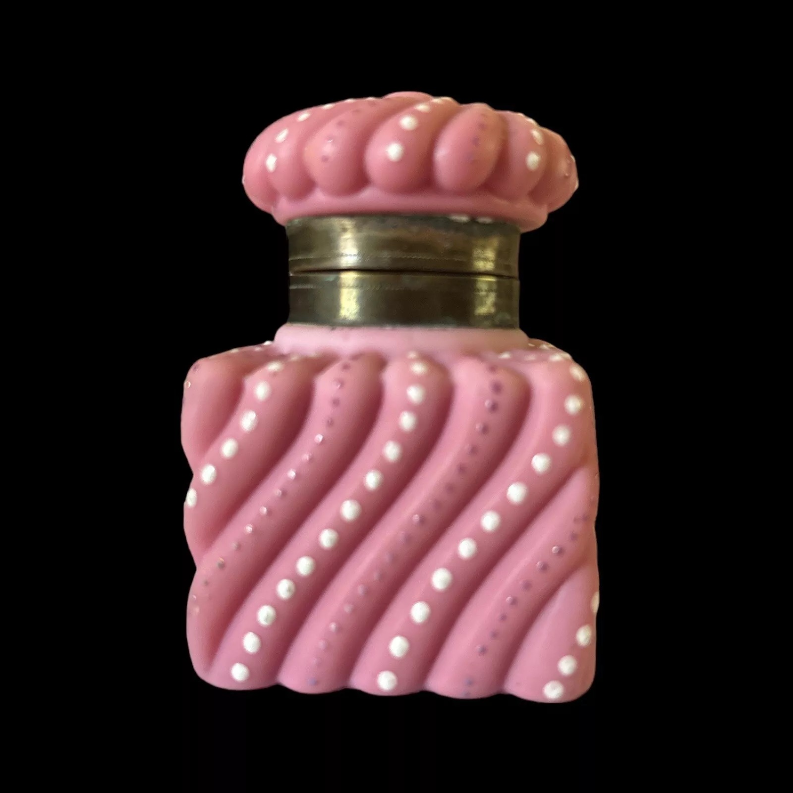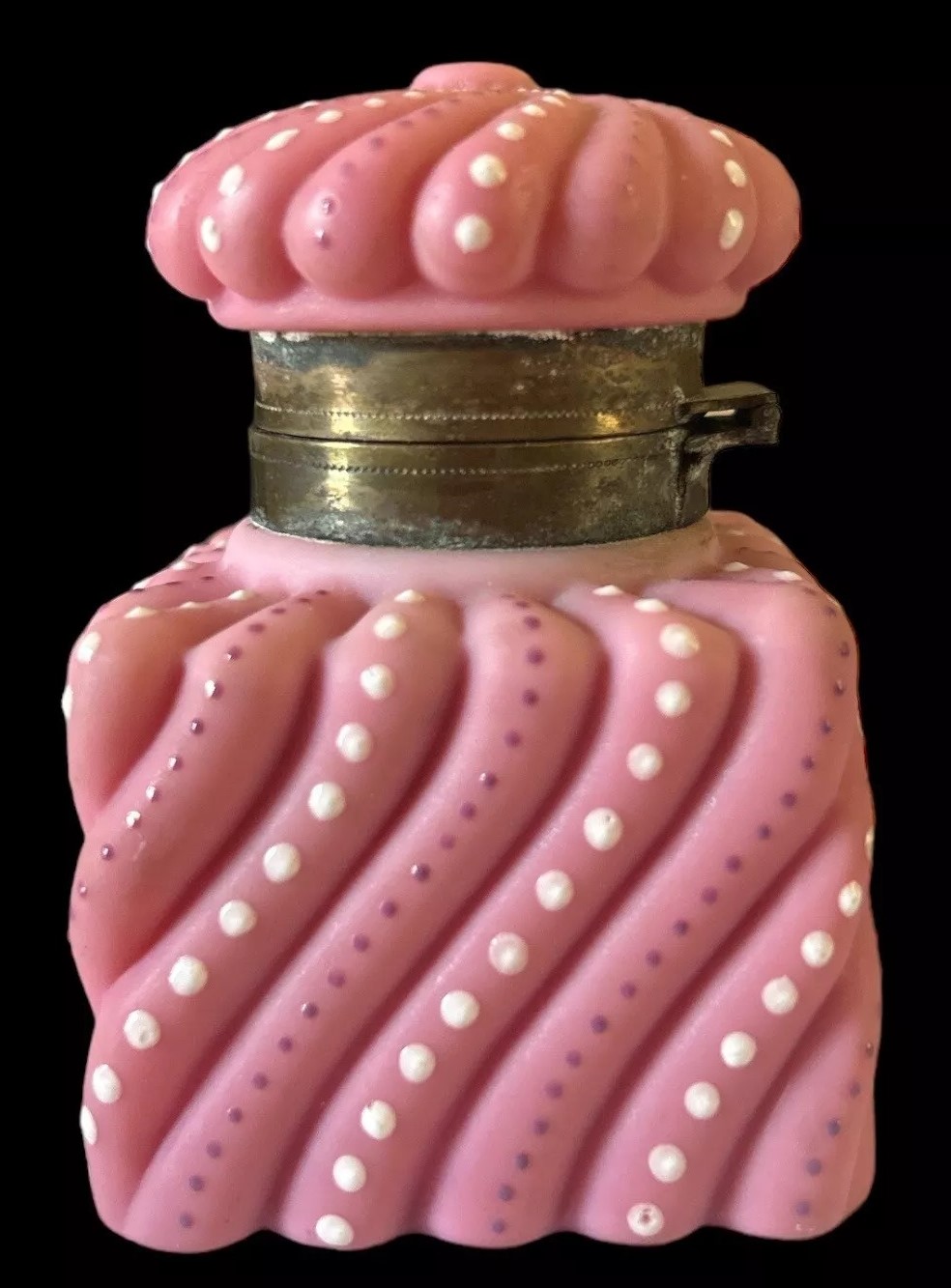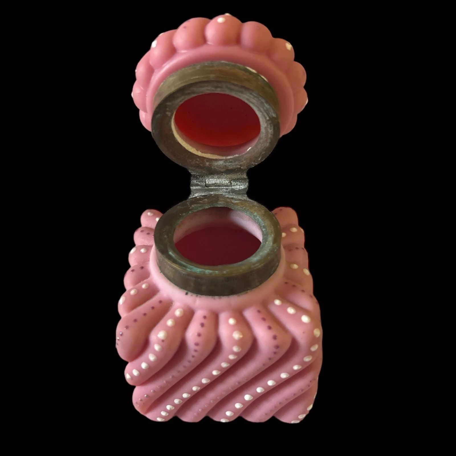 A pink satin glass hinged inkwell features a swirled design with alternating edges adorned by white dots. The glass body has a soft, velvety texture, characteristic of satin glass. The hinged lid with brass mounts complements the swirls of the glass. This inkwell is attributed to Mt. Washington Glass, a renowned American glassworks company.