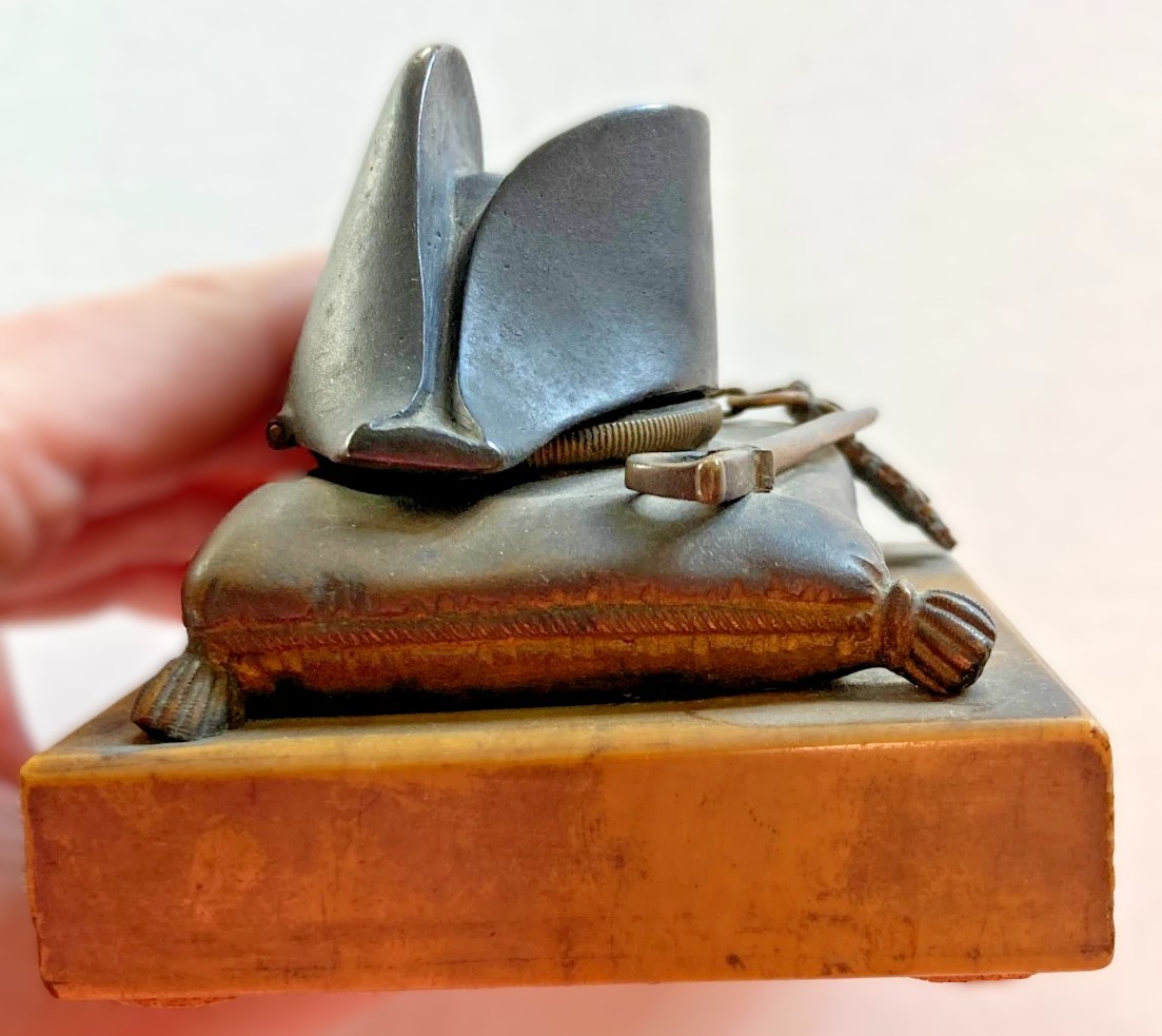 - The Hat & Pillow: The pillow/cushion and the Bicorn Hat (which would hold the inkwell liner) are finely cast metal. This metal is spelter (zinc alloy, bronzed).