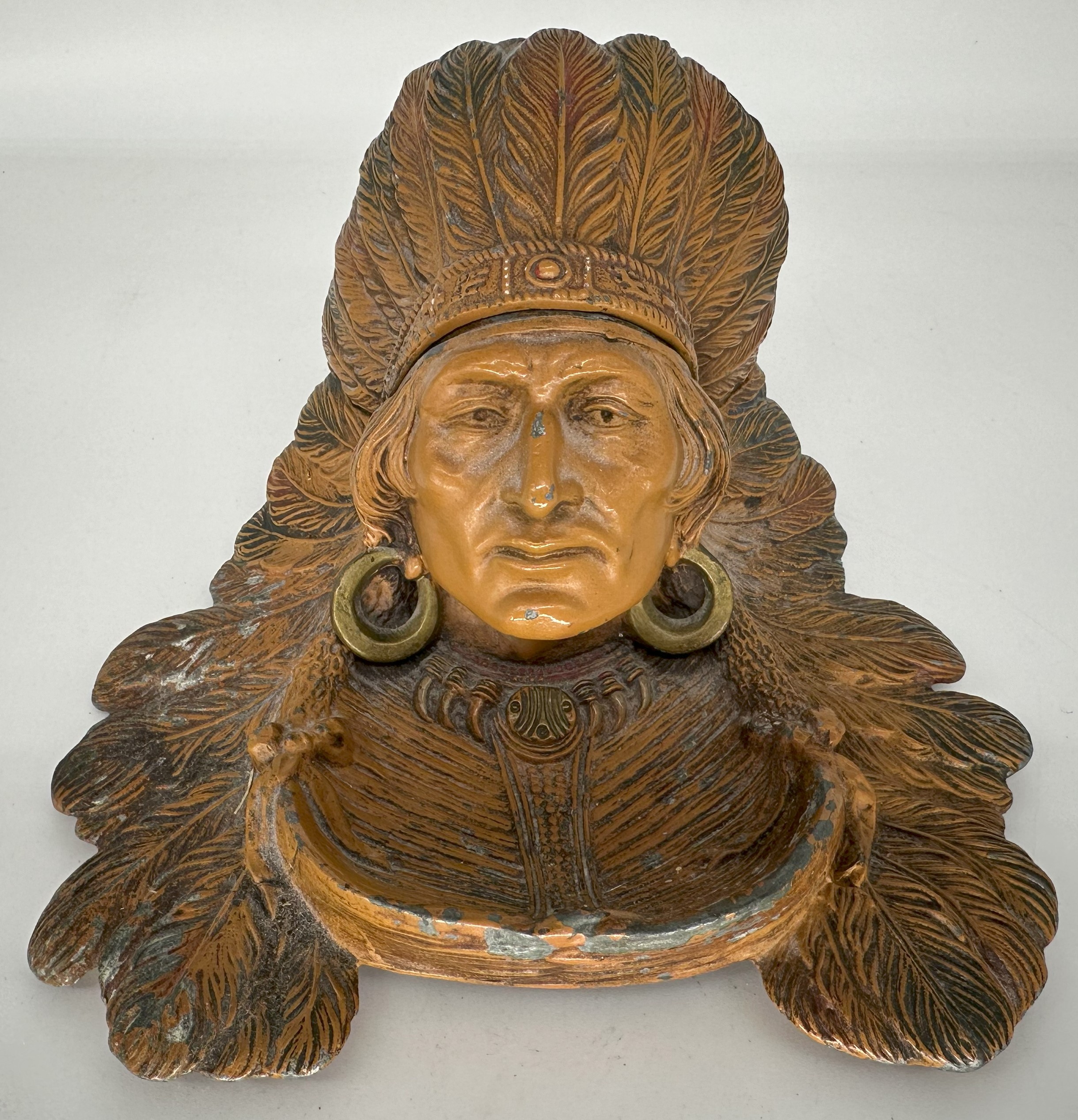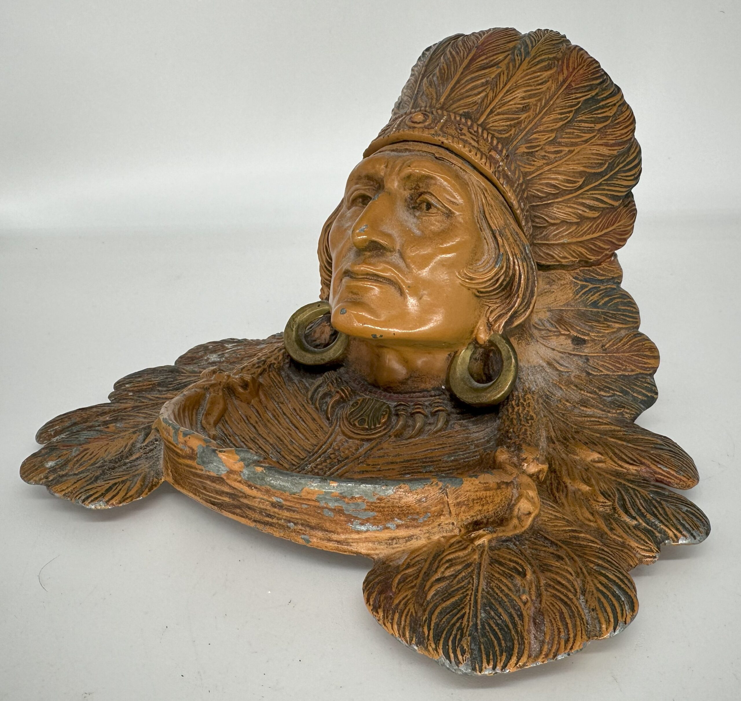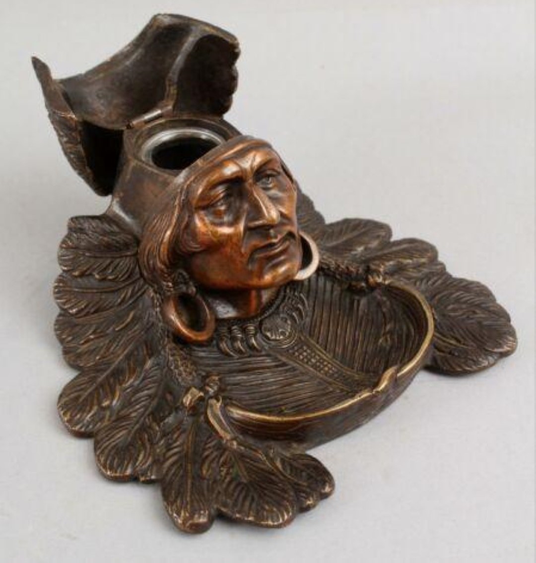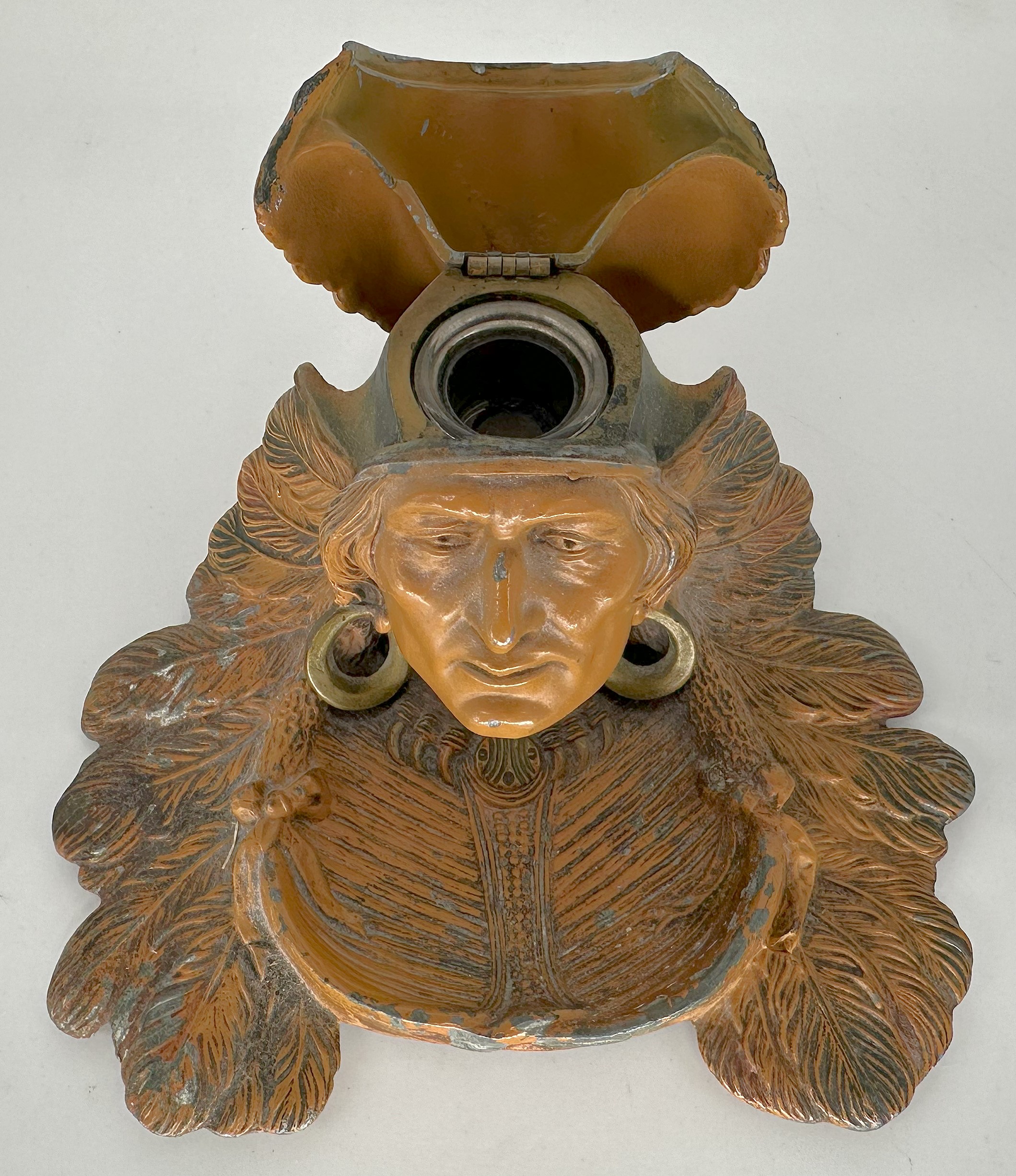 This inkstand features a Native American Indian chief adorned with earrings and a bear claw necklace. The headdress is hinged, allowing it to open to access the ink.  There is an area in front for resting pens or other writing tools. The back of the inkstand is embossed with three arches and a snake. Two versions are pictured – (1) painted white metal and (2) bronze. The depiction of a Native American chief reflects the fascination with indigenous cultures during the late 19th and early 20th centuries. Attributed to the H. L. Judd Company, there were other desk items made including a letter holder, pen tray, letter clip, rocker blotter, and letter opener.