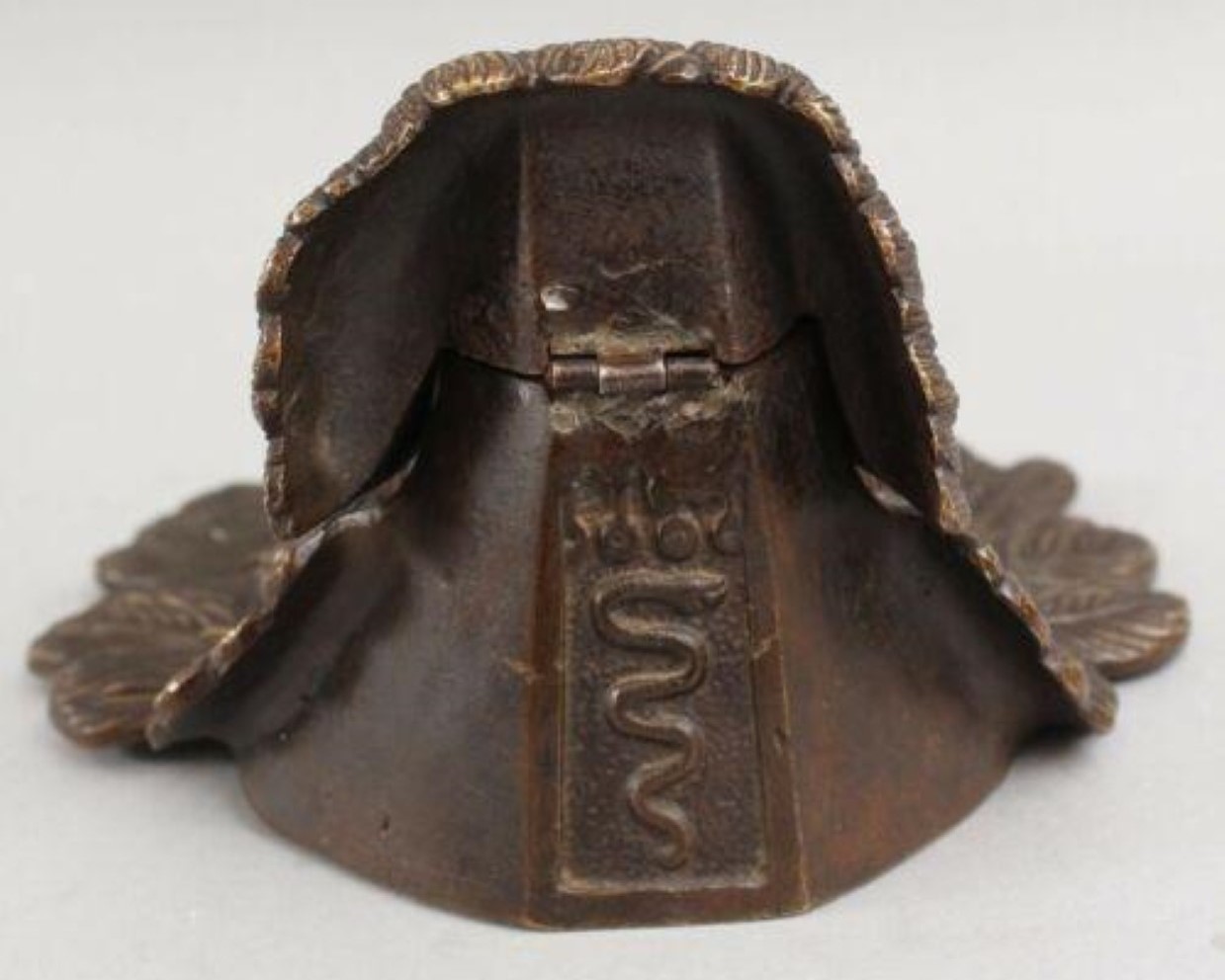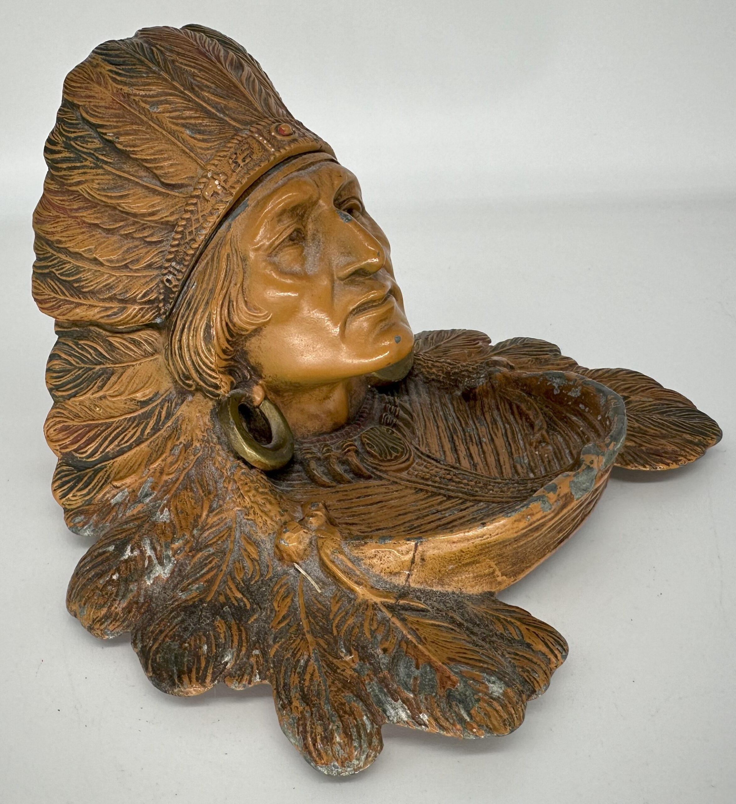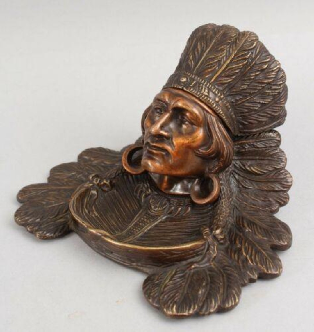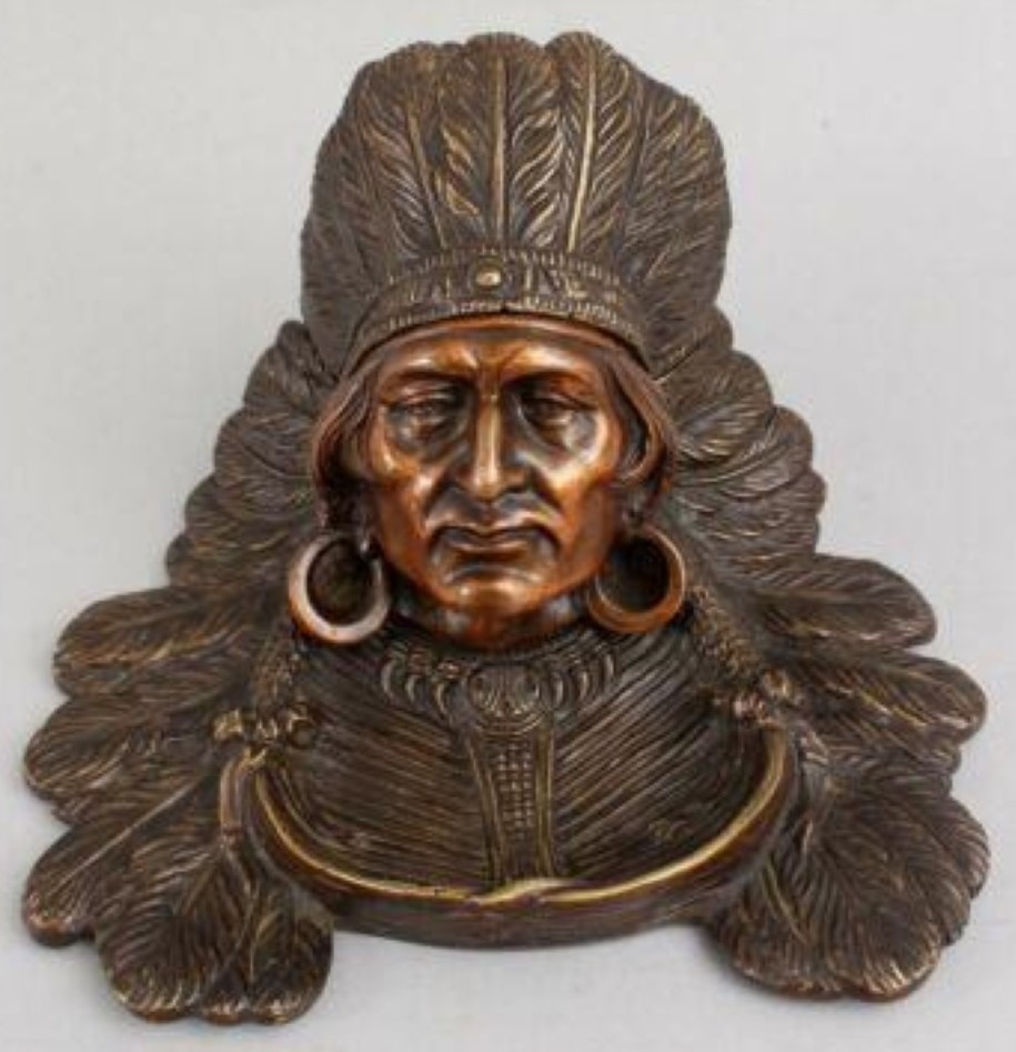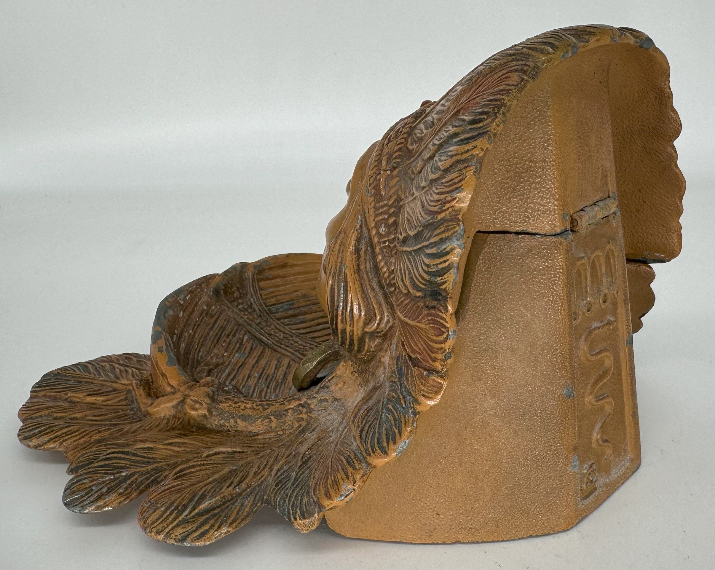 This inkstand features a Native American Indian chief adorned with earrings and a bear claw necklace. The headdress is hinged, allowing it to open to access the ink.  There is an area in front for resting pens or other writing tools. The back of the inkstand is embossed with three arches and a snake. Two versions are pictured – (1) painted white metal and (2) bronze. The depiction of a Native American chief reflects the fascination with indigenous cultures during the late 19th and early 20th centuries. Attributed to the H. L. Judd Company, there were other desk items made including a letter holder, pen tray, letter clip, rocker blotter, and letter opener.