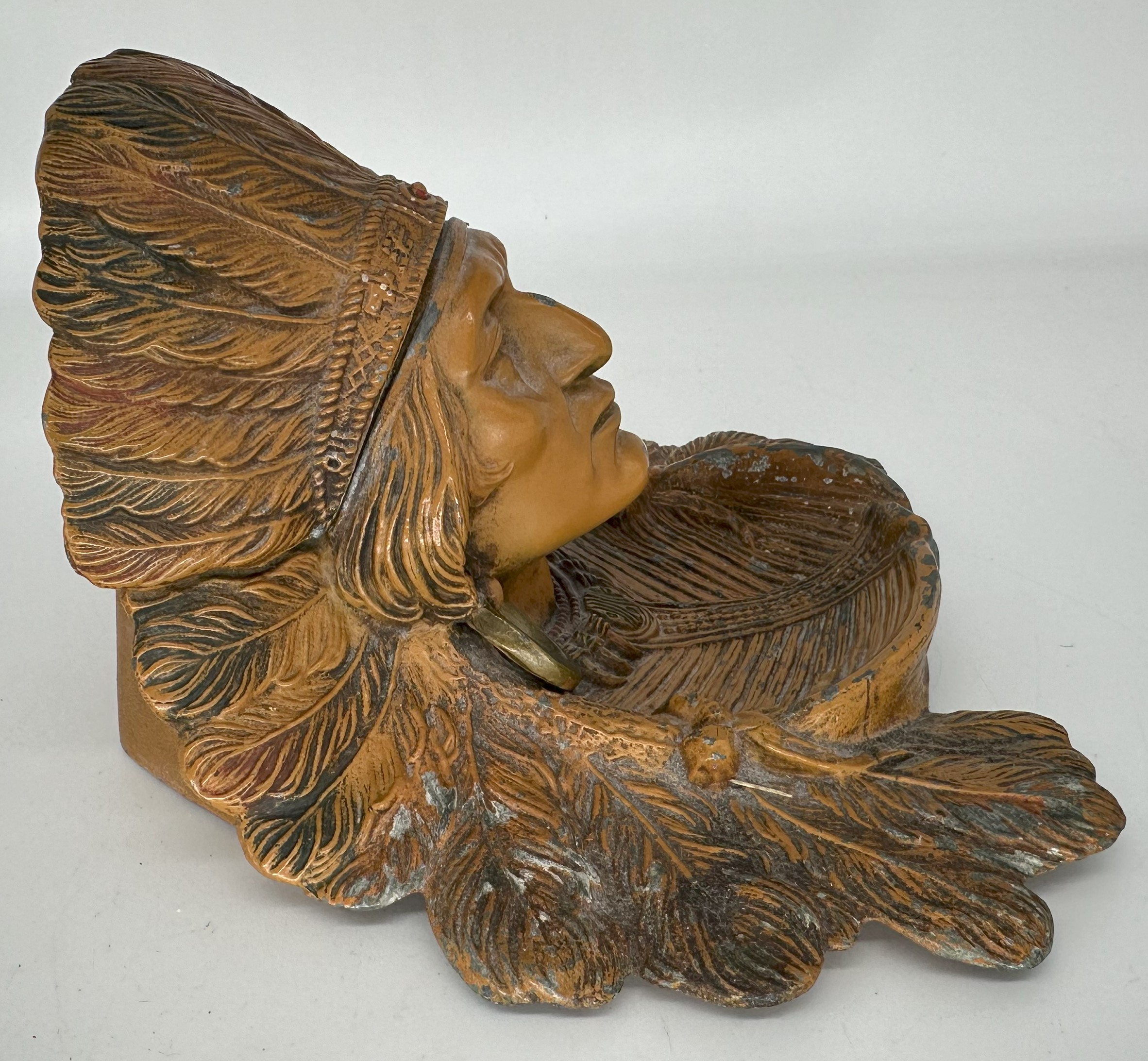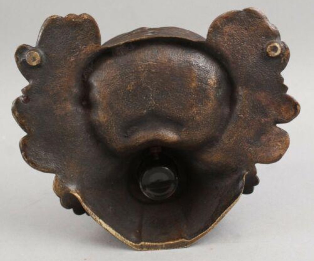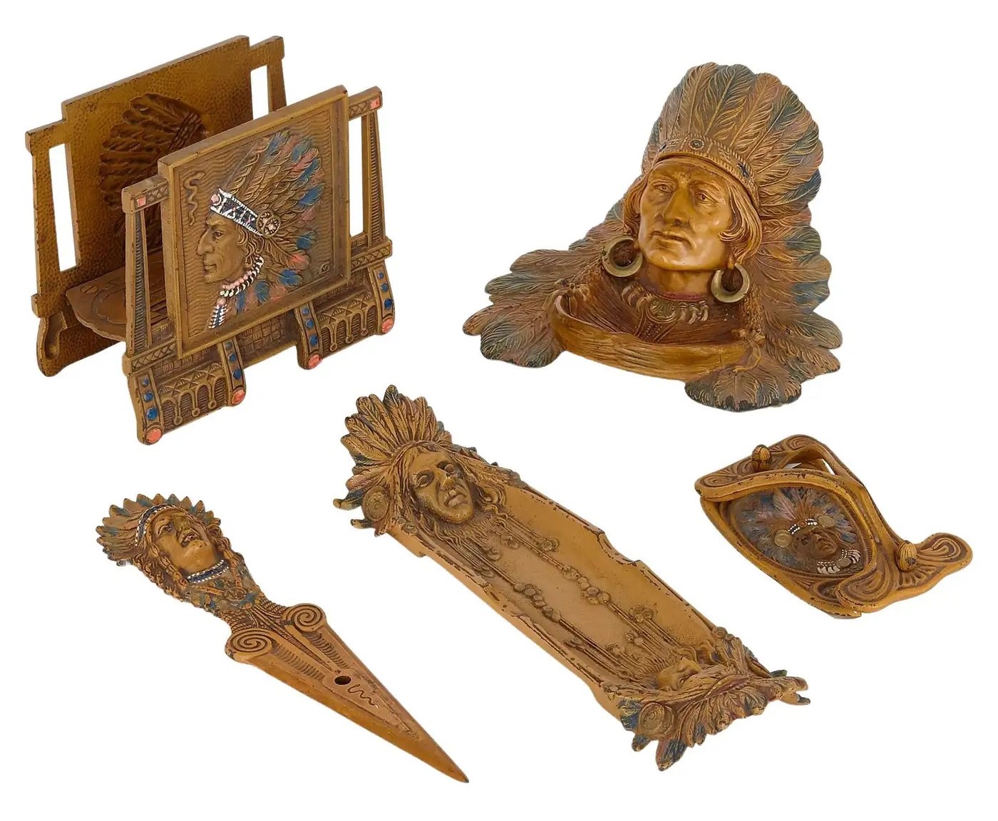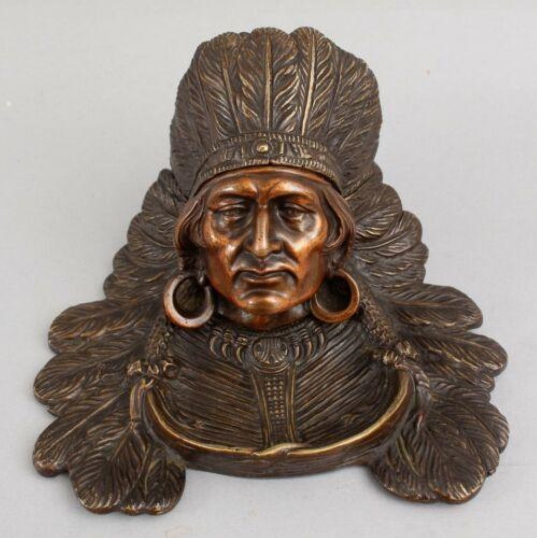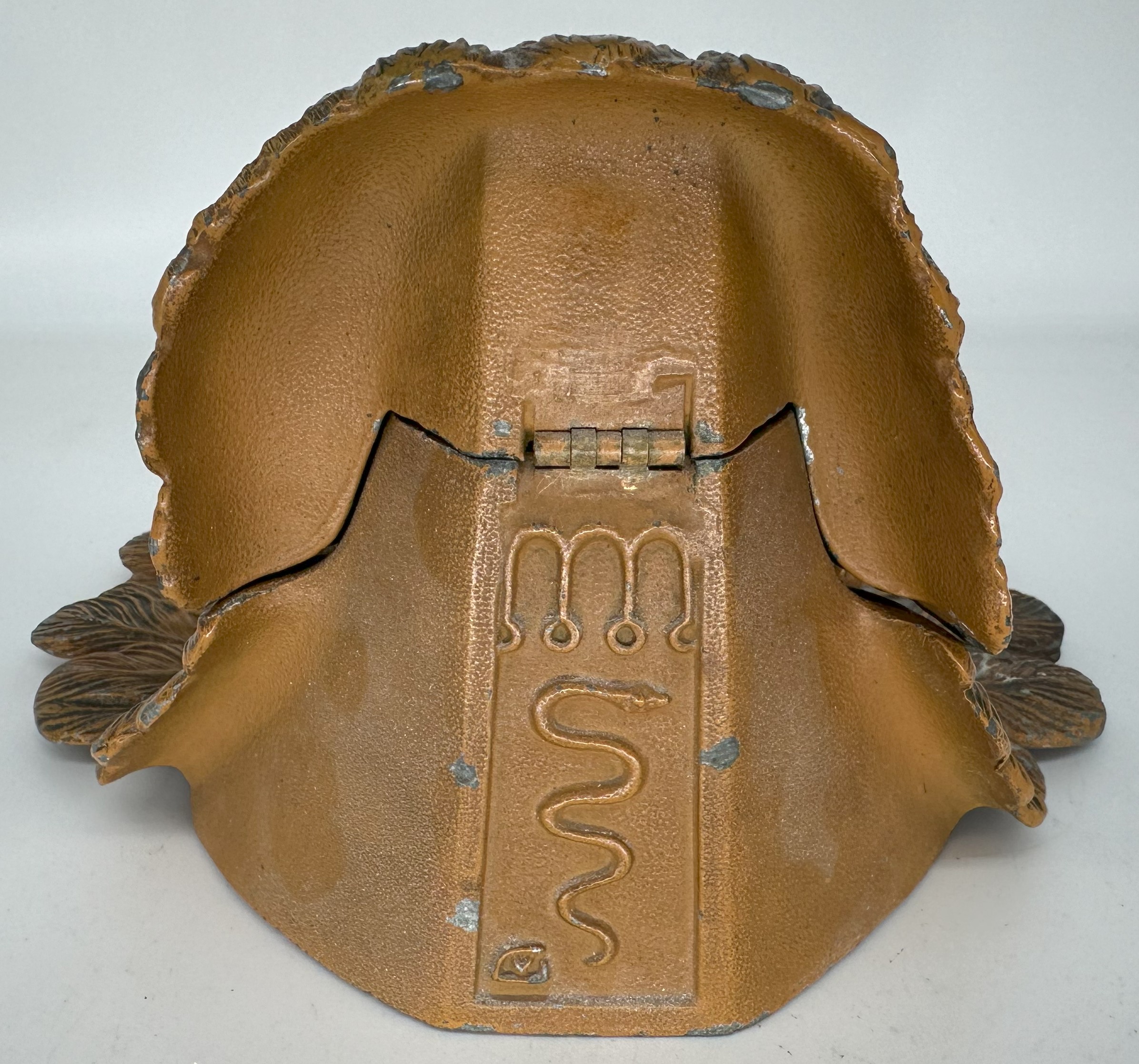 This inkstand features a Native American Indian chief adorned with earrings and a bear claw necklace. The headdress is hinged, allowing it to open to access the ink.  There is an area in front for resting pens or other writing tools. The back of the inkstand is embossed with three arches and a snake. Two versions are pictured – (1) painted white metal and (2) bronze. The depiction of a Native American chief reflects the fascination with indigenous cultures during the late 19th and early 20th centuries. Attributed to the H. L. Judd Company, there were other desk items made including a letter holder, pen tray, letter clip, rocker blotter, and letter opener.