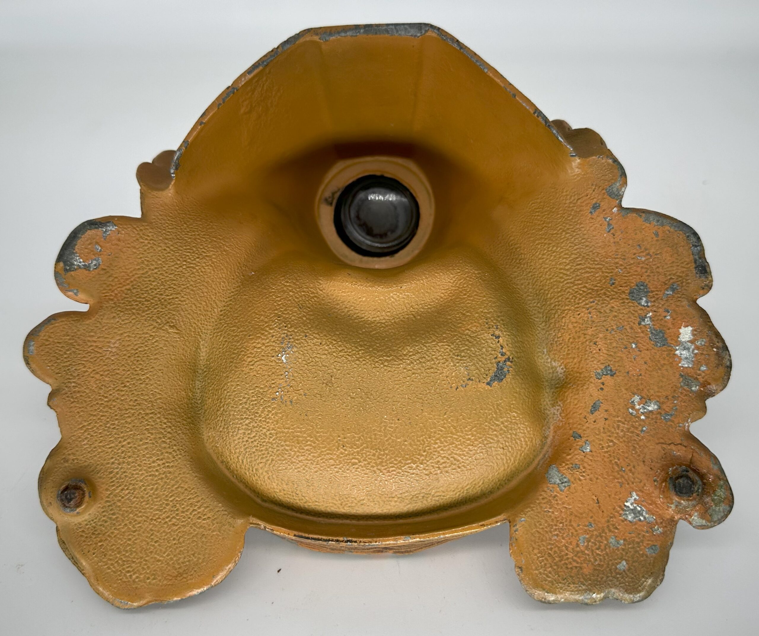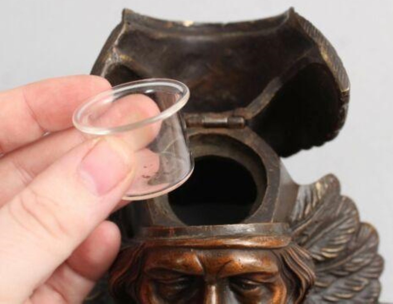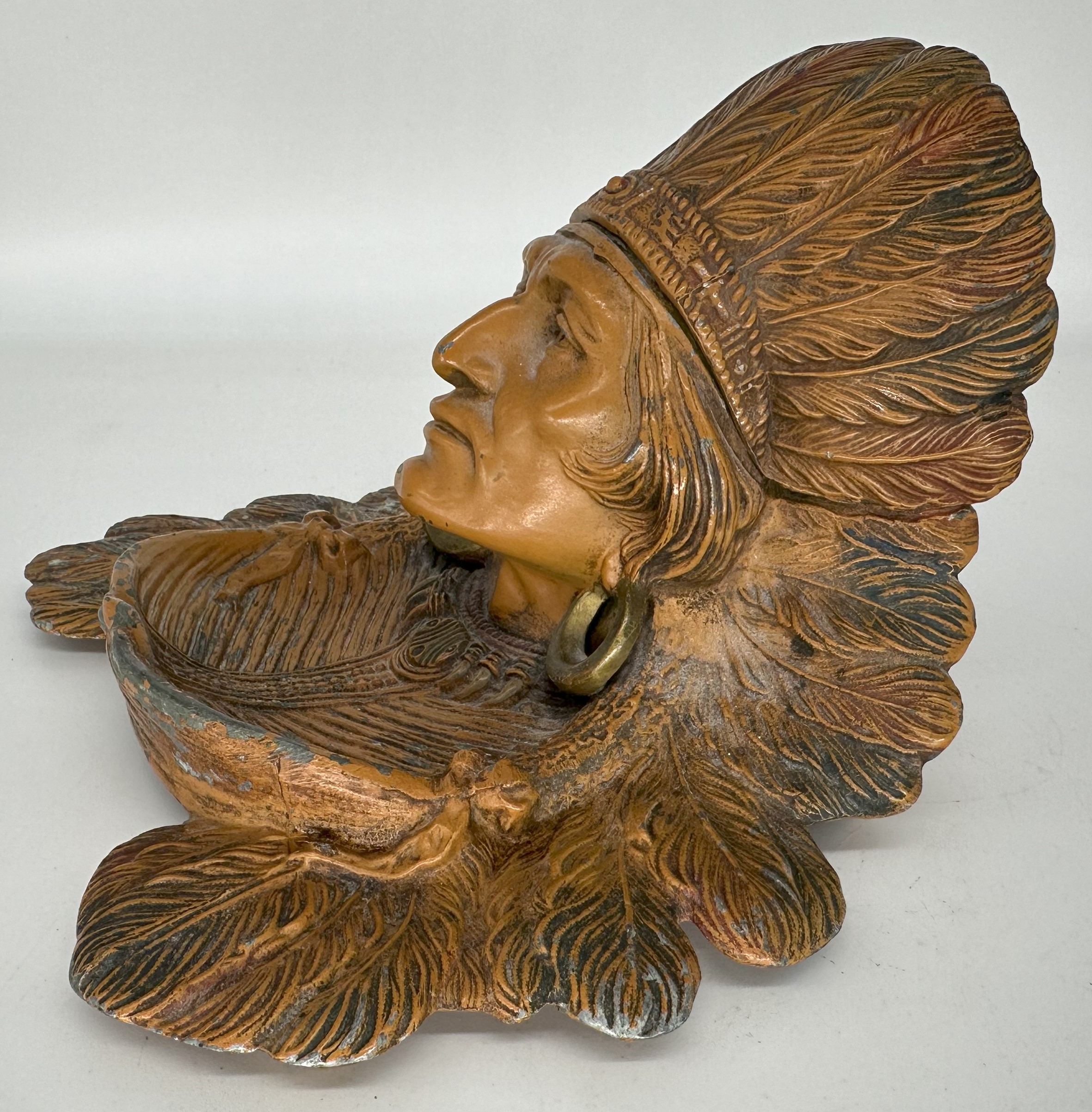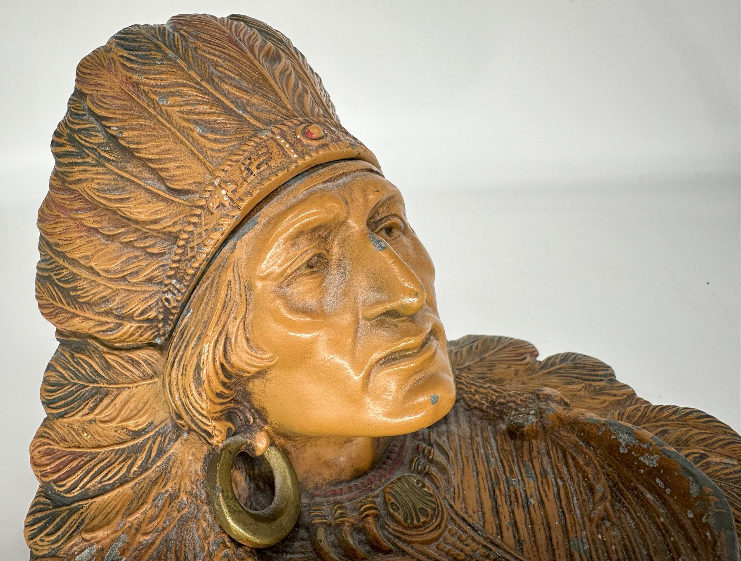 This inkstand features a Native American Indian chief adorned with earrings and a bear claw necklace. The headdress is hinged, allowing it to open to access the ink.  There is an area in front for resting pens or other writing tools. The back of the inkstand is embossed with three arches and a snake. Two versions are pictured – (1) painted white metal and (2) bronze. The depiction of a Native American chief reflects the fascination with indigenous cultures during the late 19th and early 20th centuries. Attributed to the H. L. Judd Company, there were other desk items made including a letter holder, pen tray, letter clip, rocker blotter, and letter opener.