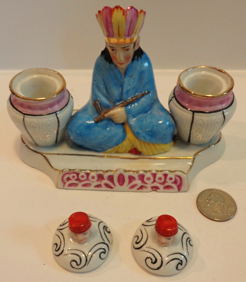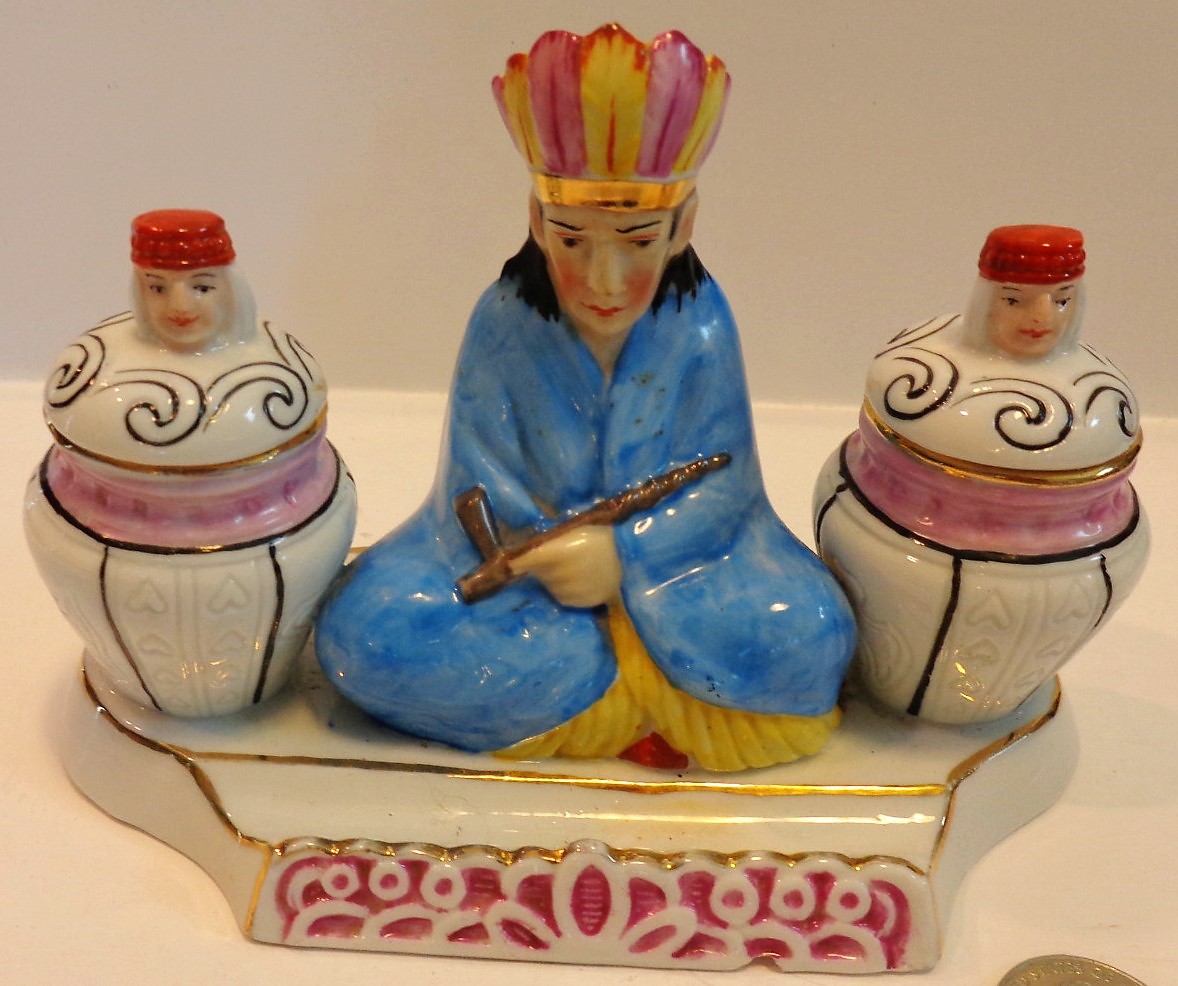 Double inkstand featuring an Indian Chief holding a peace pipe, sitting between two pots (the inkwells). Note the faces on the lids covering the inkwells. The hole in the headdress is designed to hold a pen.
