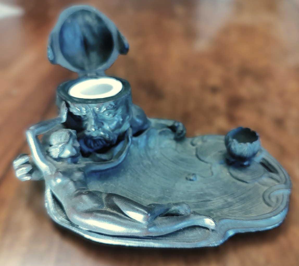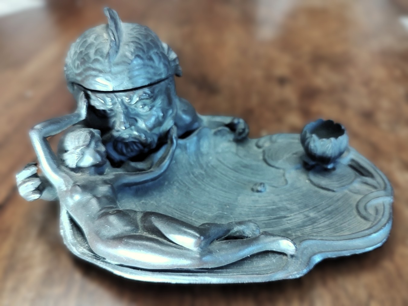 - Inkwell Access: Neptune’s head (or a detailed helmet/headdress atop his head) is hinged, swinging open to reveal the ink white ceramic reservoir.