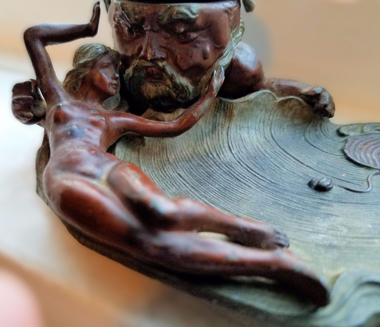 This inkstand is a Late 19th-Century Figural Standish depicting a mythological scene. The central figure, Neptune (God of the Sea), is flanked by a Water Nymph (Nereid) whose nude form and gesture of touching his face emphasize the emotional or narrative focus of the scene. The figures stand on a molded aquatic base which is flattened to serve as the pen tray. The functional inkwell is hidden beneath Neptune’s hinged helmet or headdress.