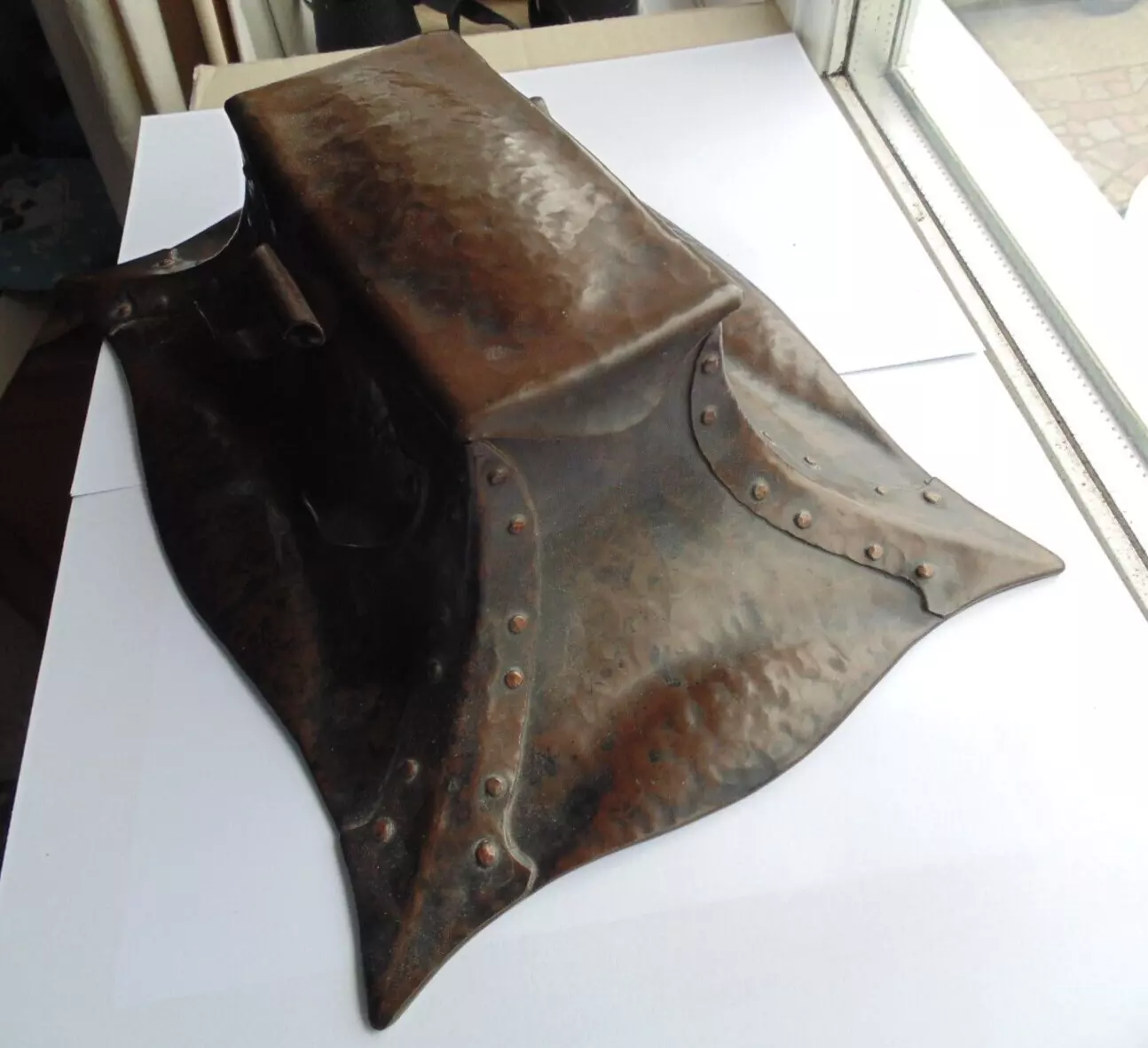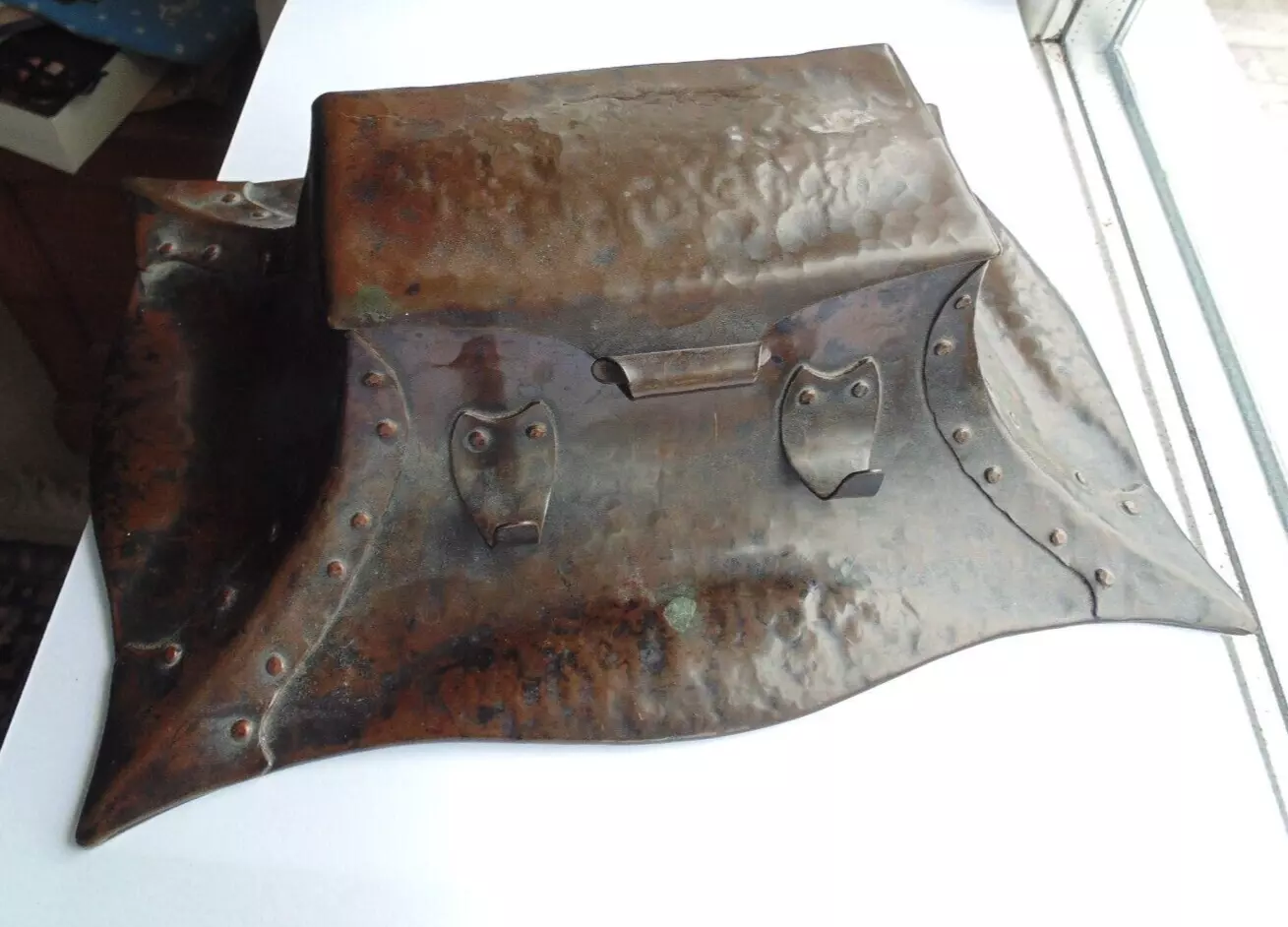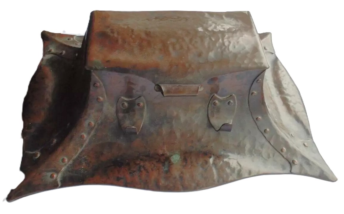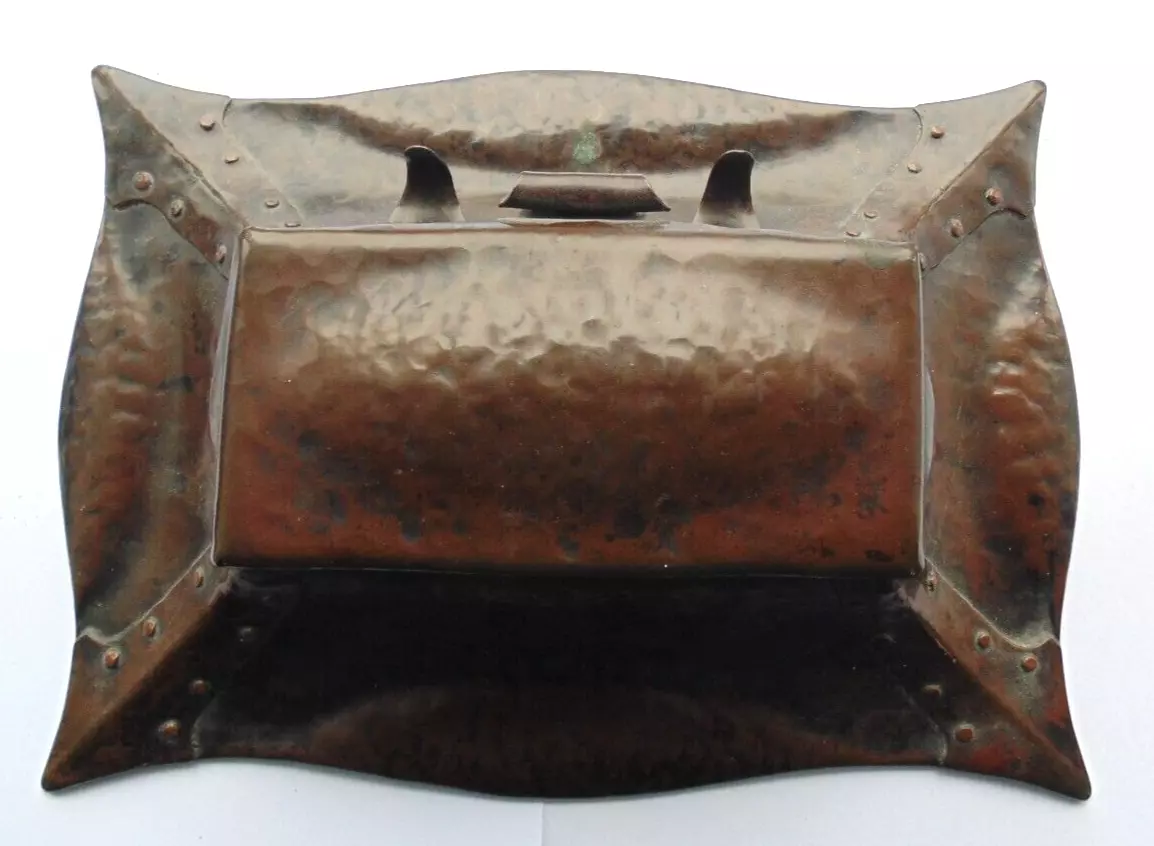 This Newlyn School hammered copper inkstand has a rectangular shape with a slightly domed lid. The edges of the base flare outwards, creating a wavy, undulating effect. The surface is textured with hammer marks, giving it a rustic and handcrafted appearance. Decorative elements like rivets and small shield-like plates add to its aesthetic appeal. The design reflects the Arts and Crafts movement, emphasizing craftsmanship and artistic detail.