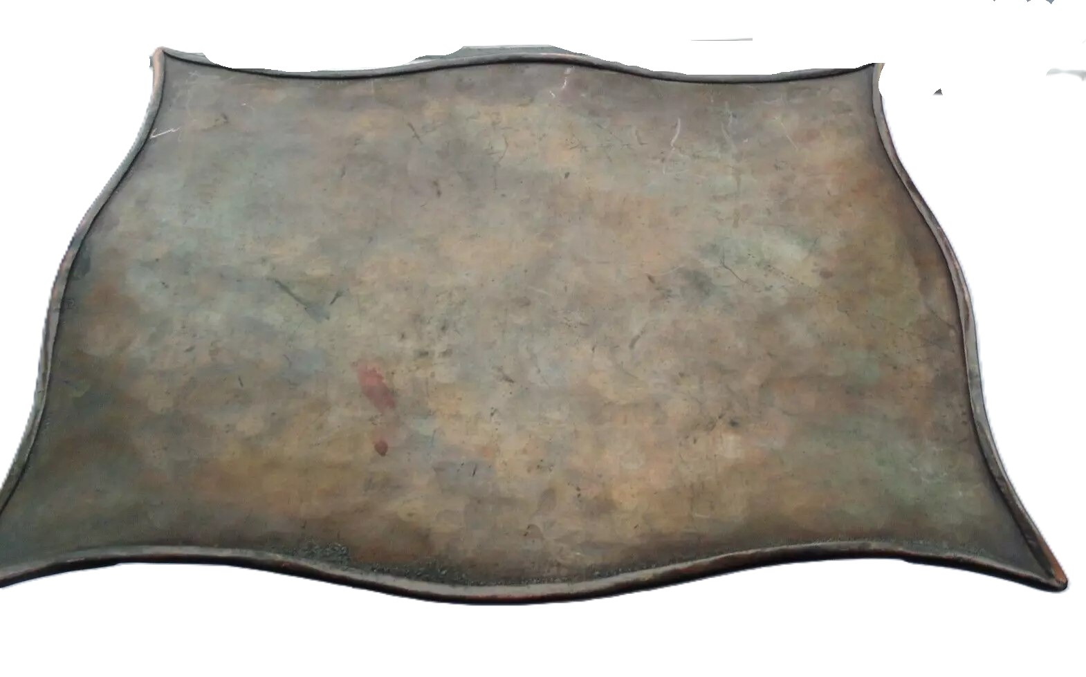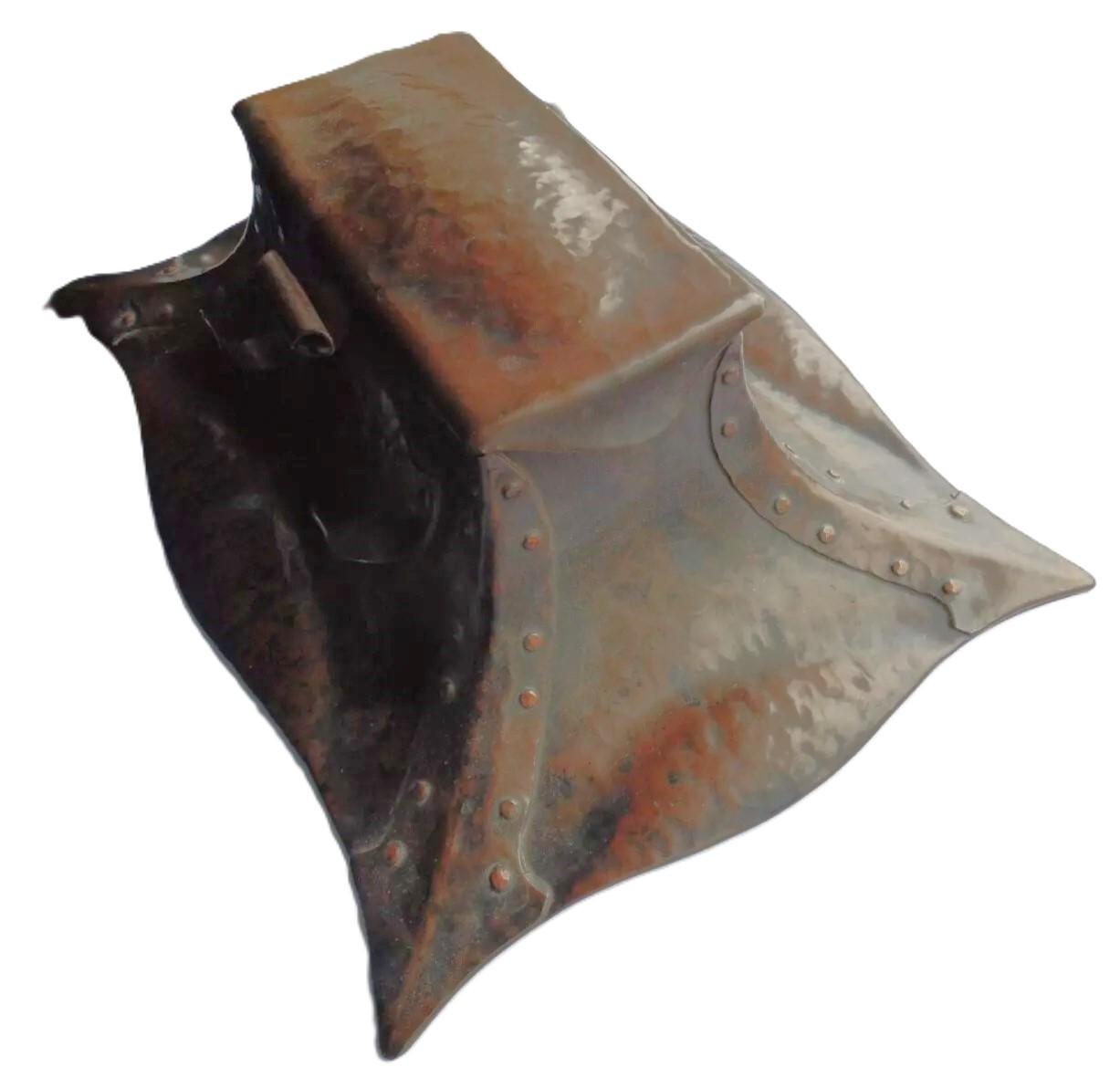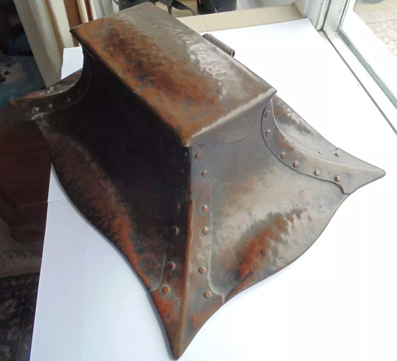 This Newlyn School hammered copper inkstand has a rectangular shape with a slightly domed lid. The edges of the base flare outwards, creating a wavy, undulating effect. The surface is textured with hammer marks, giving it a rustic and handcrafted appearance. Decorative elements like rivets and small shield-like plates add to its aesthetic appeal. The design reflects the Arts and Crafts movement, emphasizing craftsmanship and artistic detail.