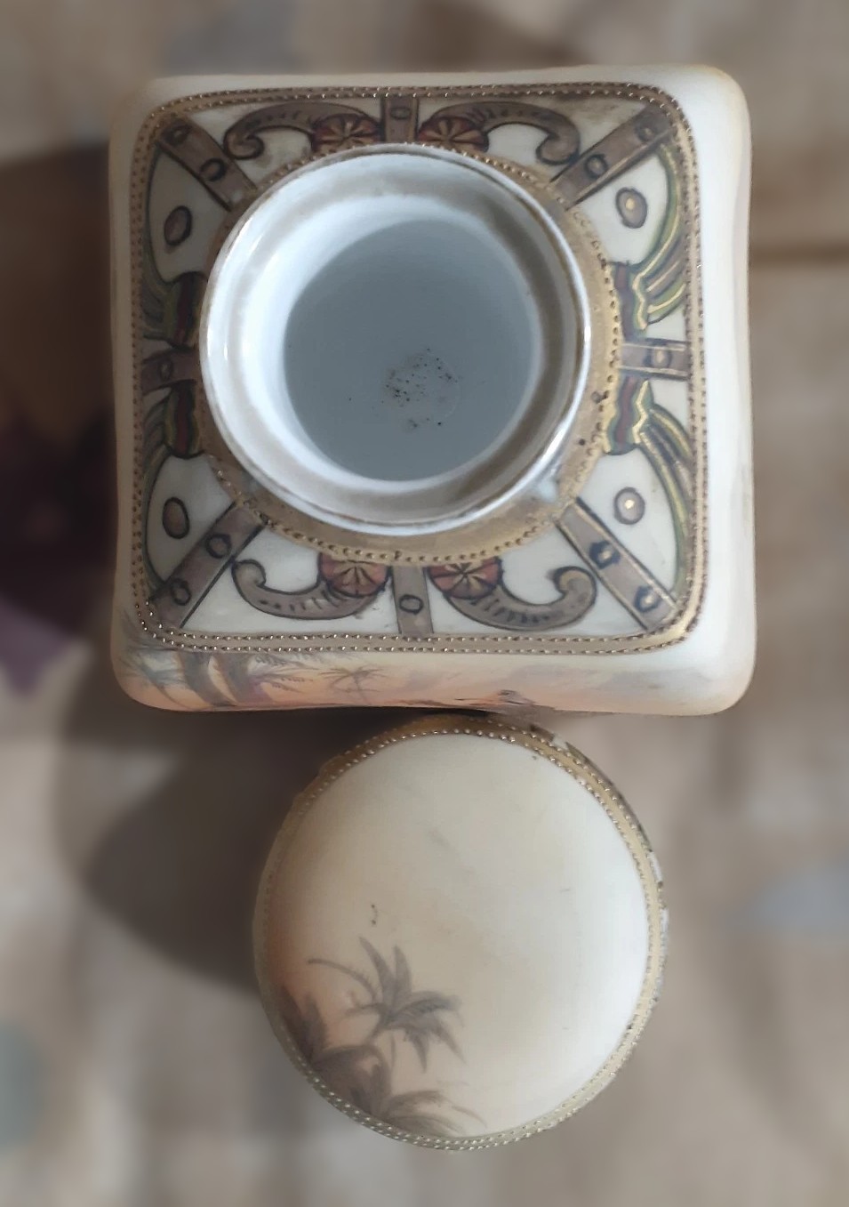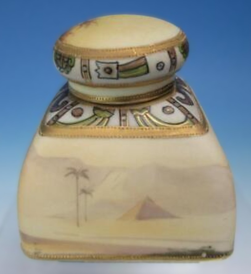- Form & Structure: This is a square, pyramidal inkwell with gently sloping sides and a matching circular, domed lid. The porcelain is a high-quality white paste, common to the Morimura Brothers’ production. It includes a removable white porcelain ink insert.