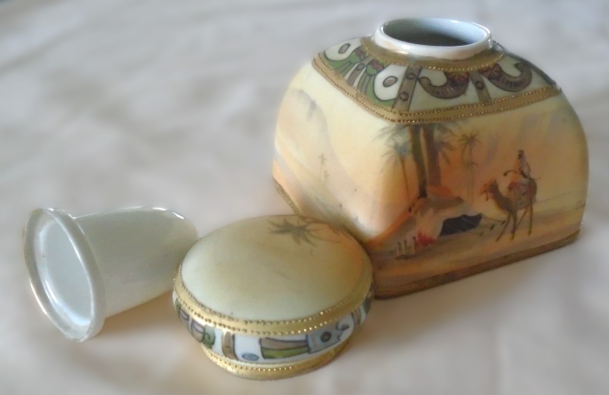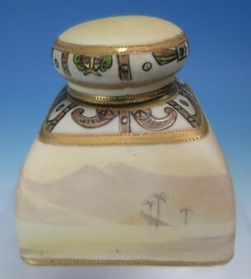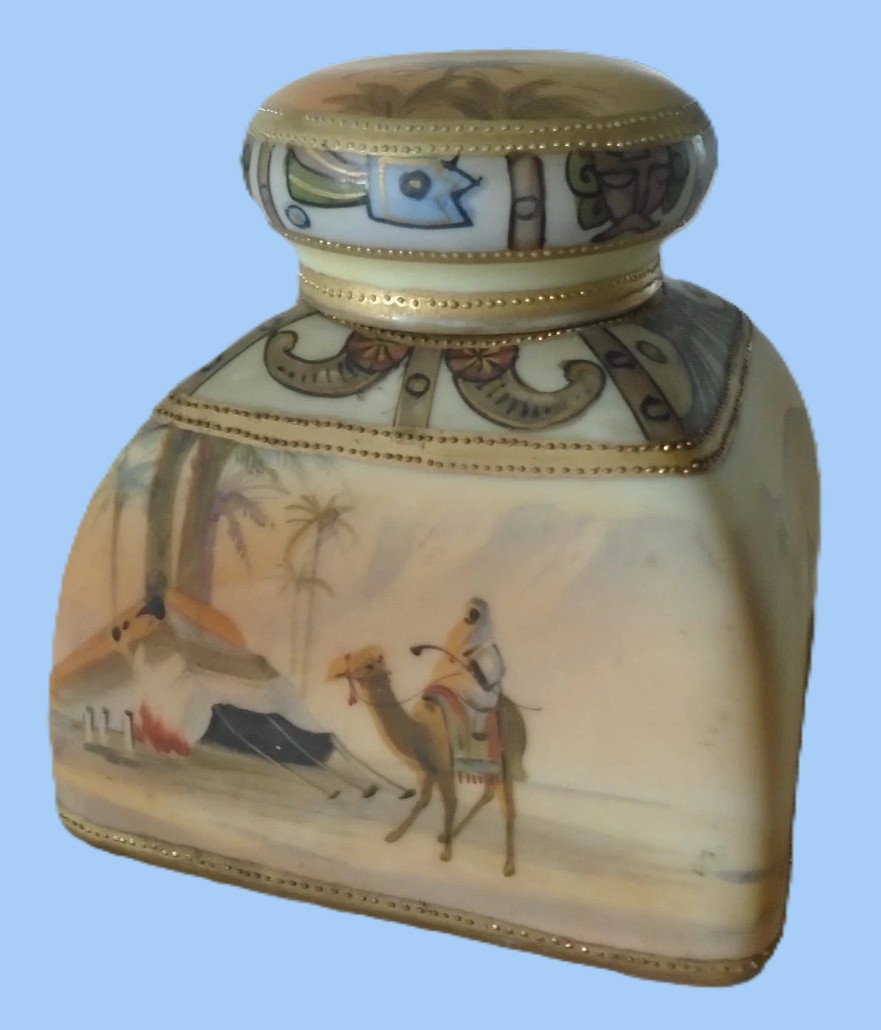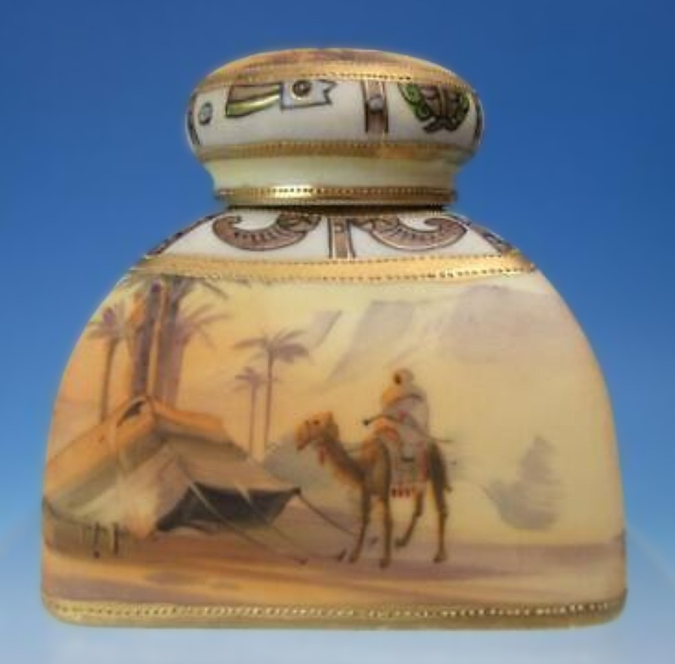 - The Desert Scene: The hand-painted “Oasis” scene wraps around the body of the inkwell. It depicts a classic Orientalist landscape: