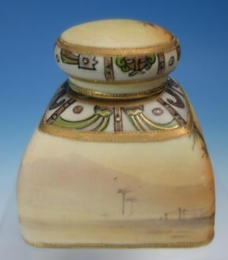 This is a fine example of Nippon porcelain featuring the “Desert” or “Egyptian” motif. The atmospheric painting combined with the intricate texture of the gold work makes it a standout piece.