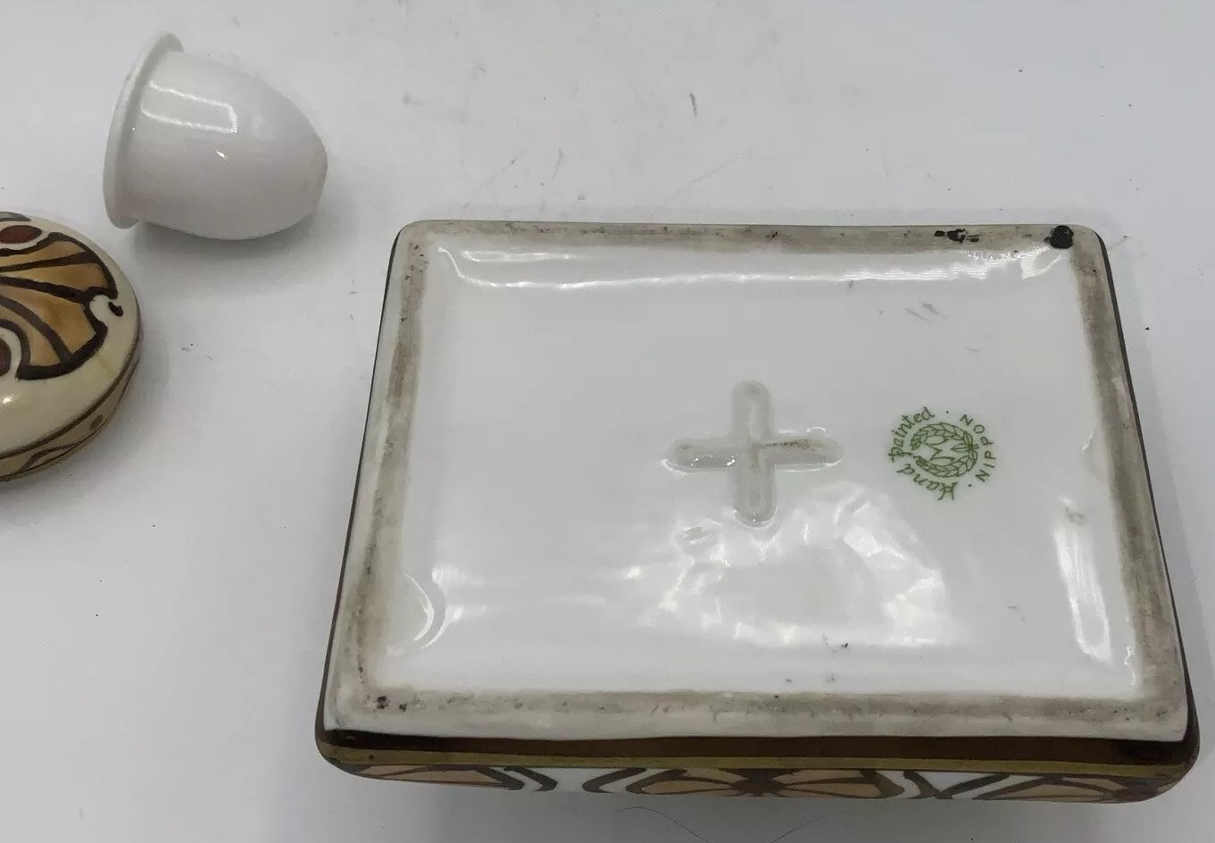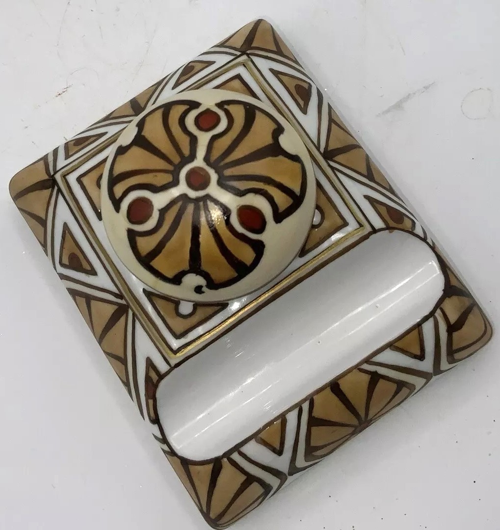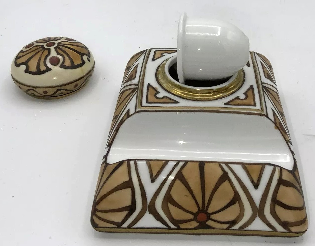This Nippon inkwell features a hand-painted design of geometric patterns and stylized floral motifs in earth tones with red and white accents. It is hallmarked with the Morimura Bros “M in Wreath”.