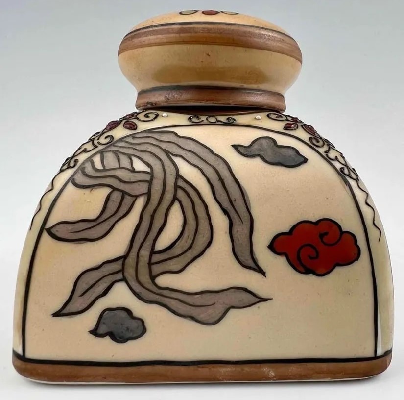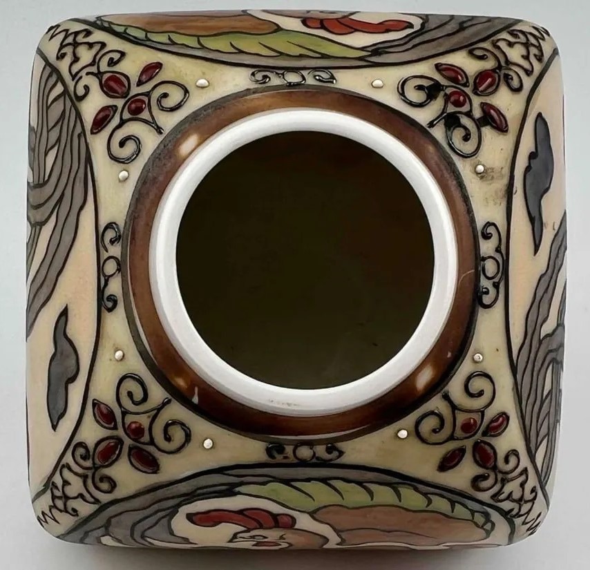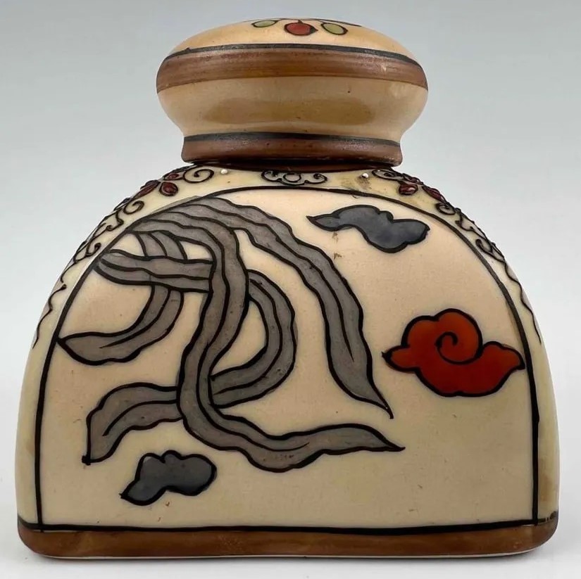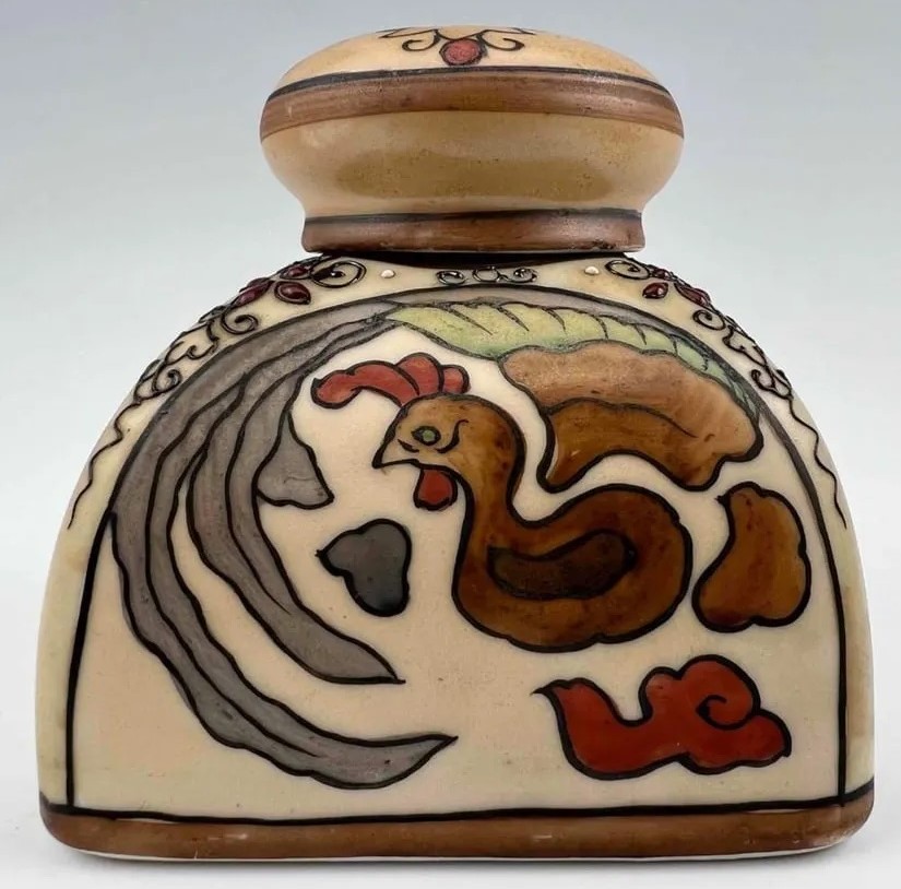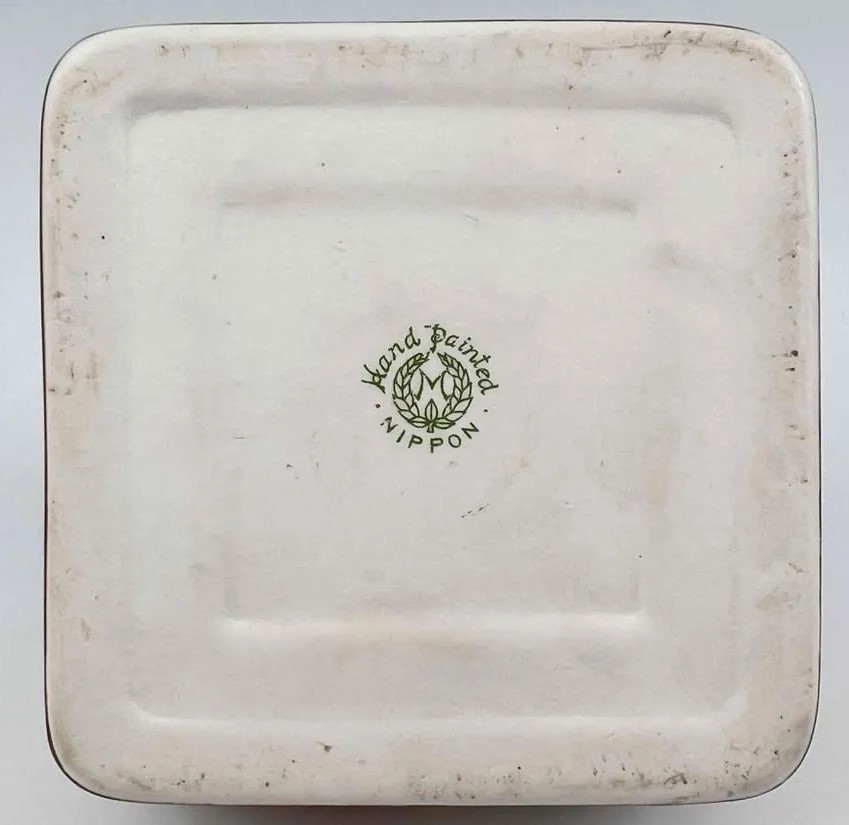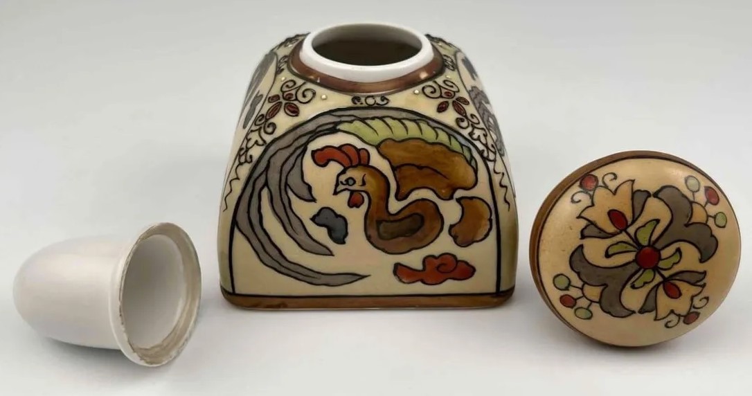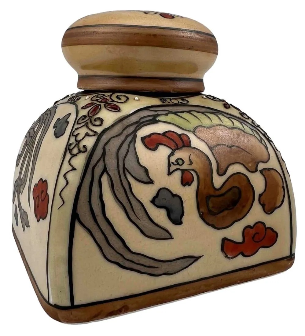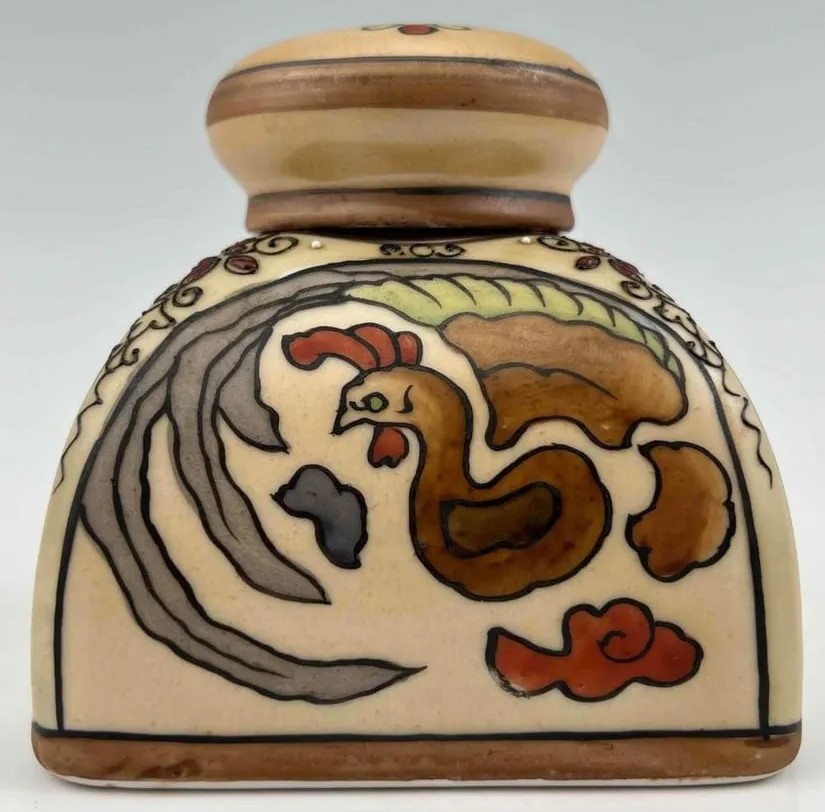 Hand painted Nippon inkwell with the M in Wreath for the importers Morimura Bros. in green, dating it to post 1911. The inkwell has a pattern with an alternating rooster and a leaf pattern repeated on the opposite sides. The corners and sloped shoulders are decorated with black moriage on light green with white and rust colored slip beads. The lid has a stylized floral pattern.
