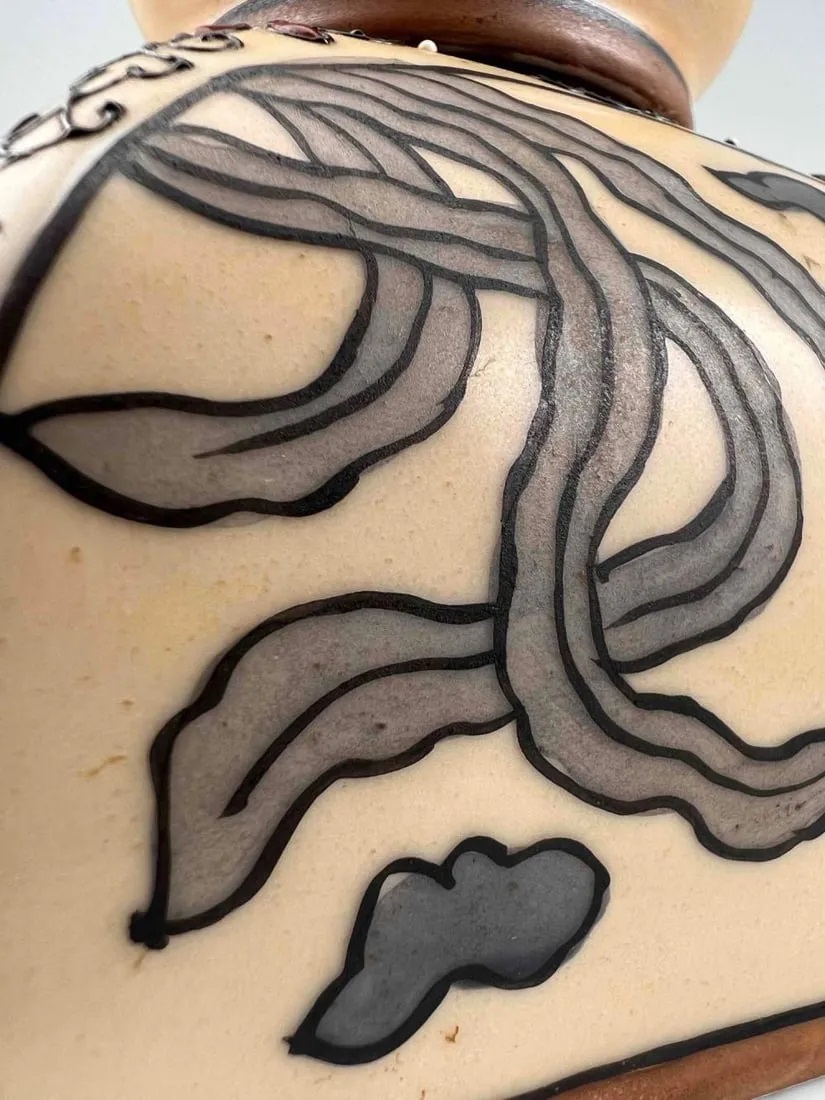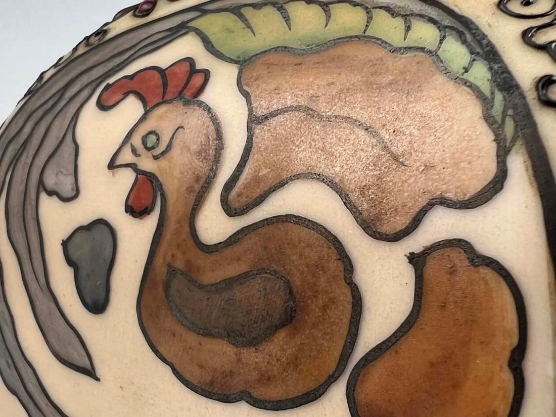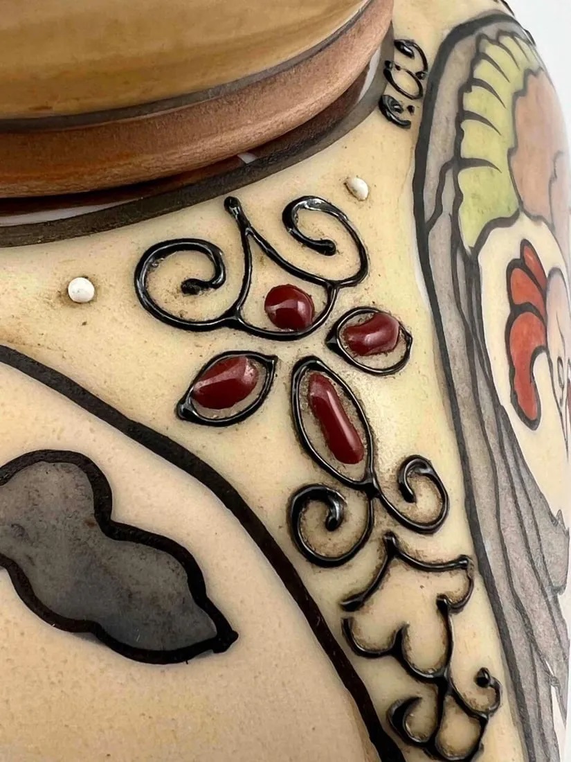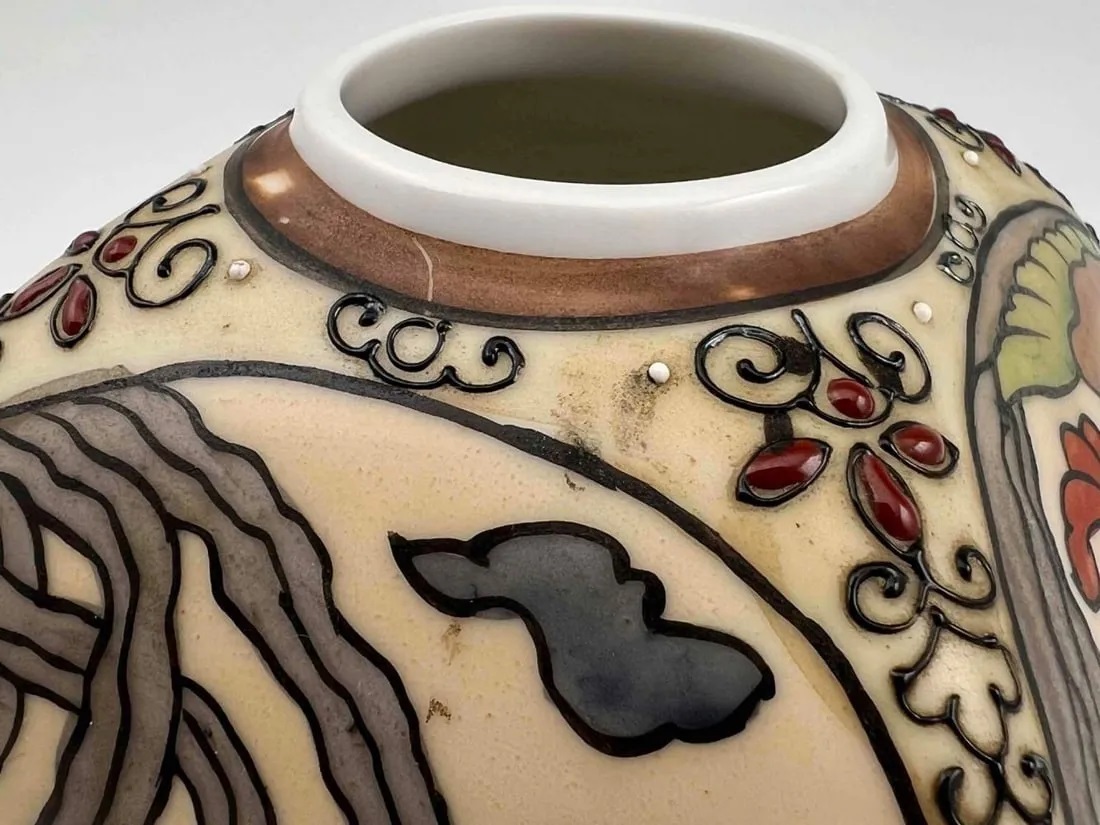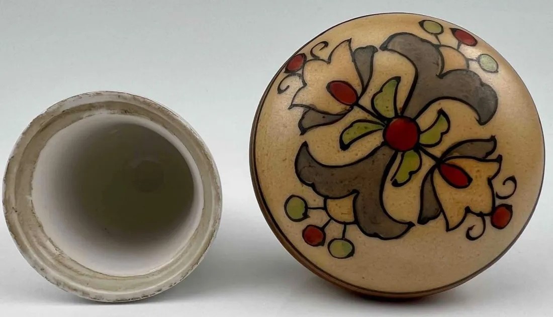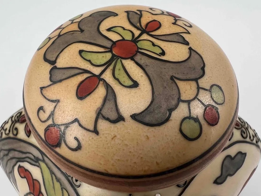 Hand painted Nippon inkwell with the M in Wreath for the importers Morimura Bros. in green, dating it to post 1911. The inkwell has a pattern with an alternating rooster and a leaf pattern repeated on the opposite sides. The corners and sloped shoulders are decorated with black moriage on light green with white and rust colored slip beads. The lid has a stylized floral pattern.